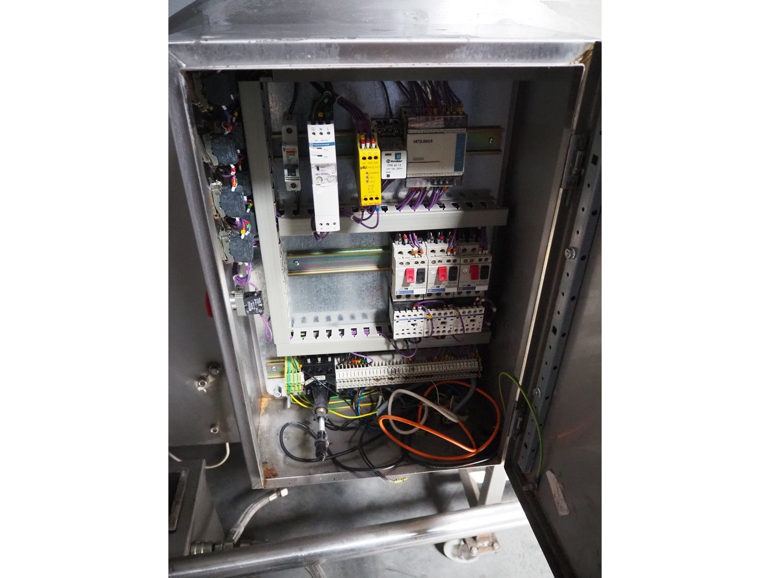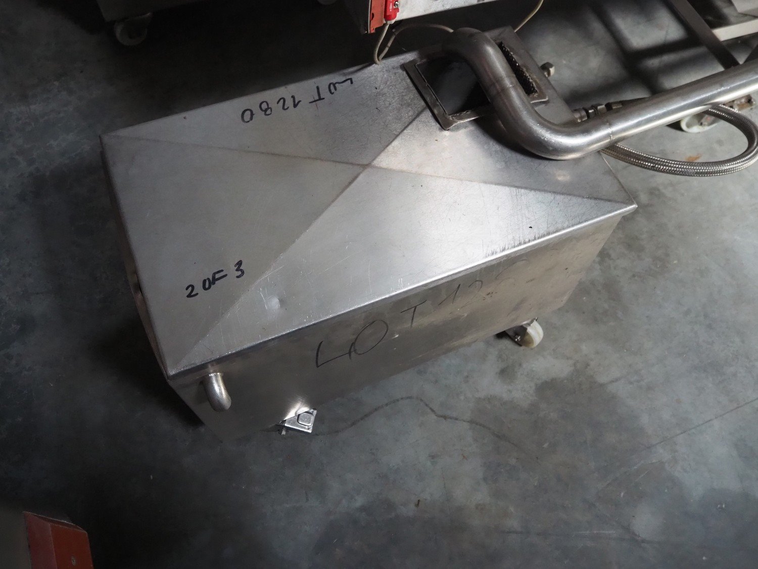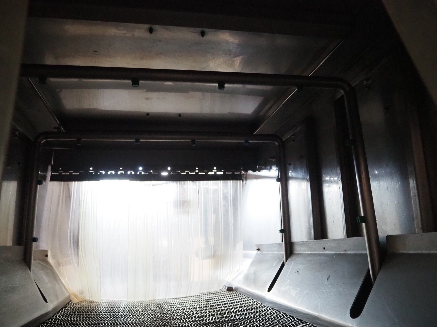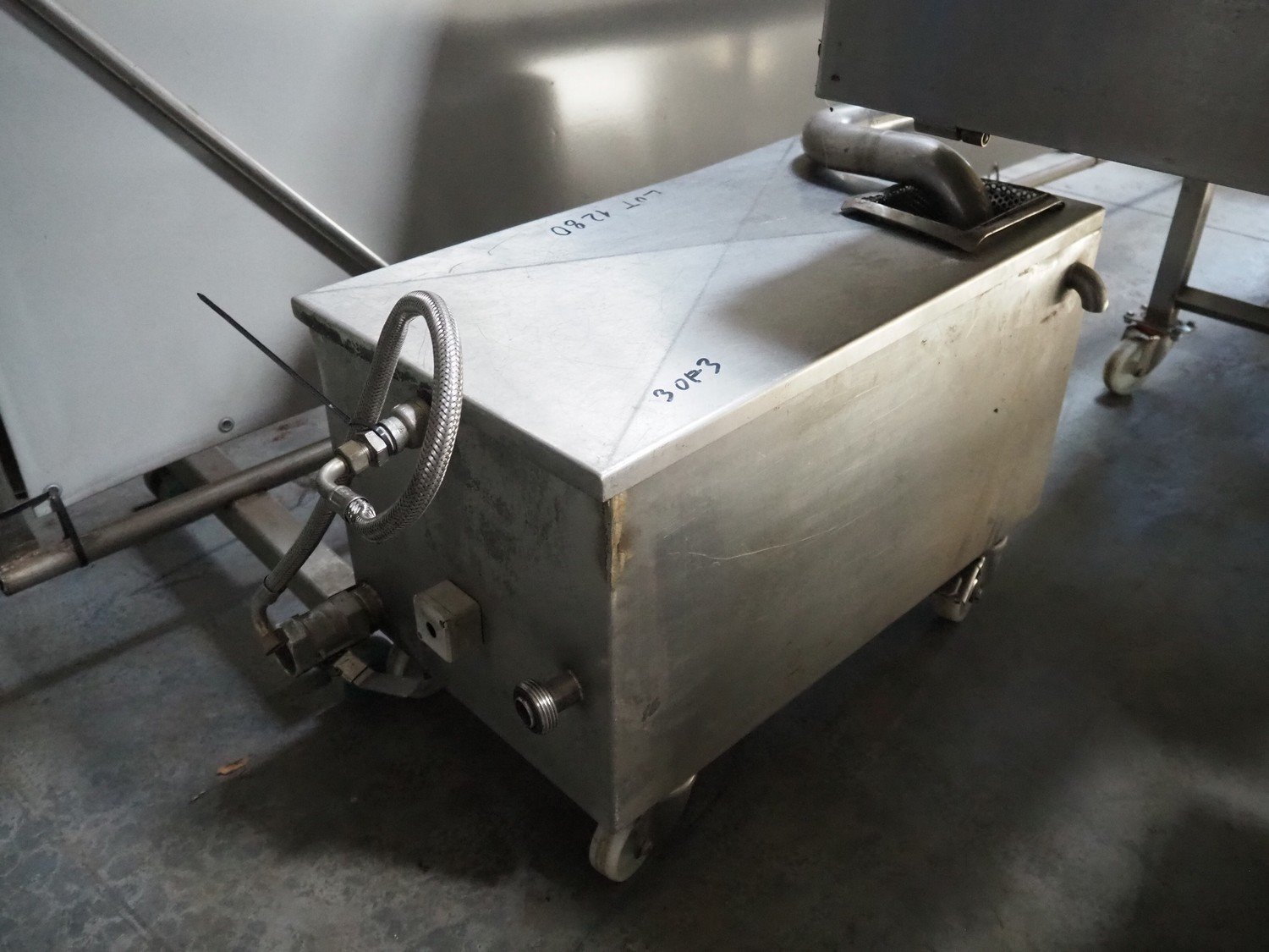 NTM washer, model: Sanit 2, serial number: 2802, year of construction: 2001, s/s mesh belt, belt width: 660 mm, clearance: 660 mm x 500 mm, total dimensions: 2850 mm x 1400 mm x 1450 mm. Including 2 mobile filter tubs, dimensions: (2x) 800 mm x 400 mm x 500 mm.