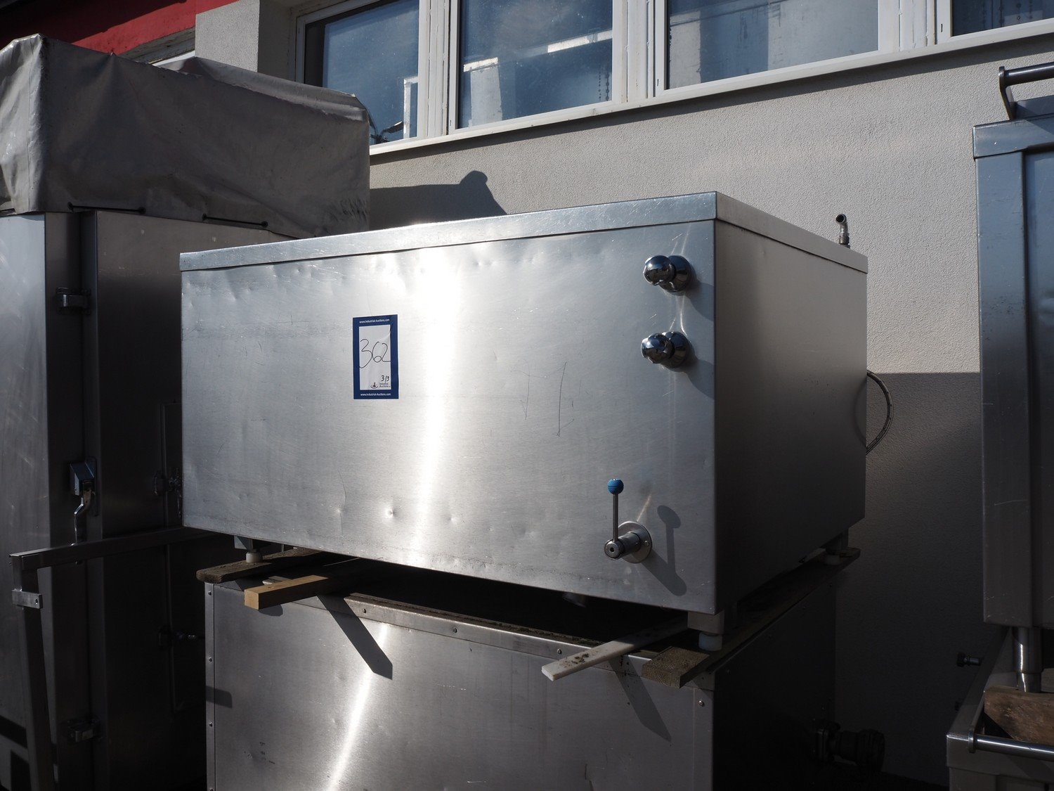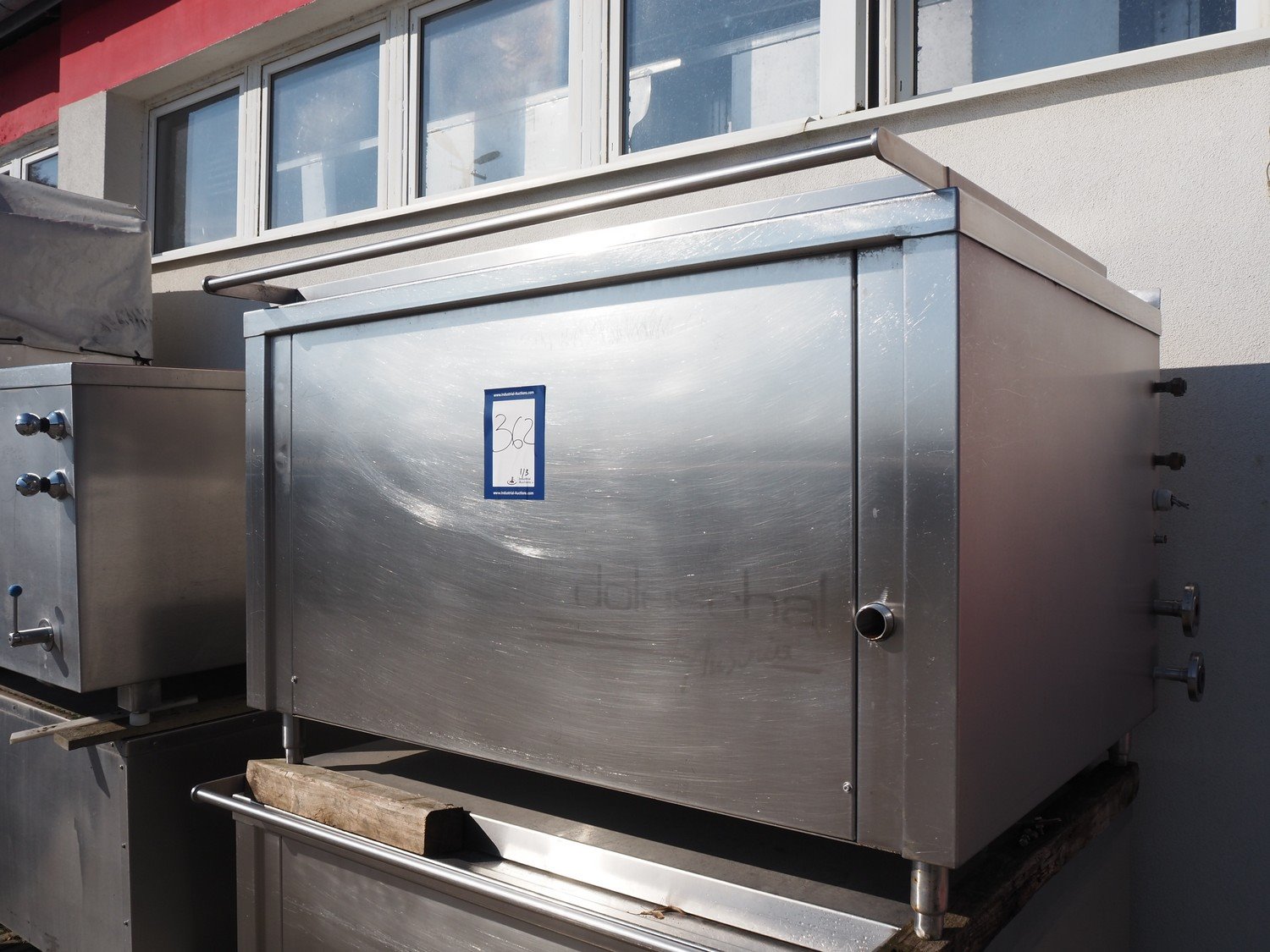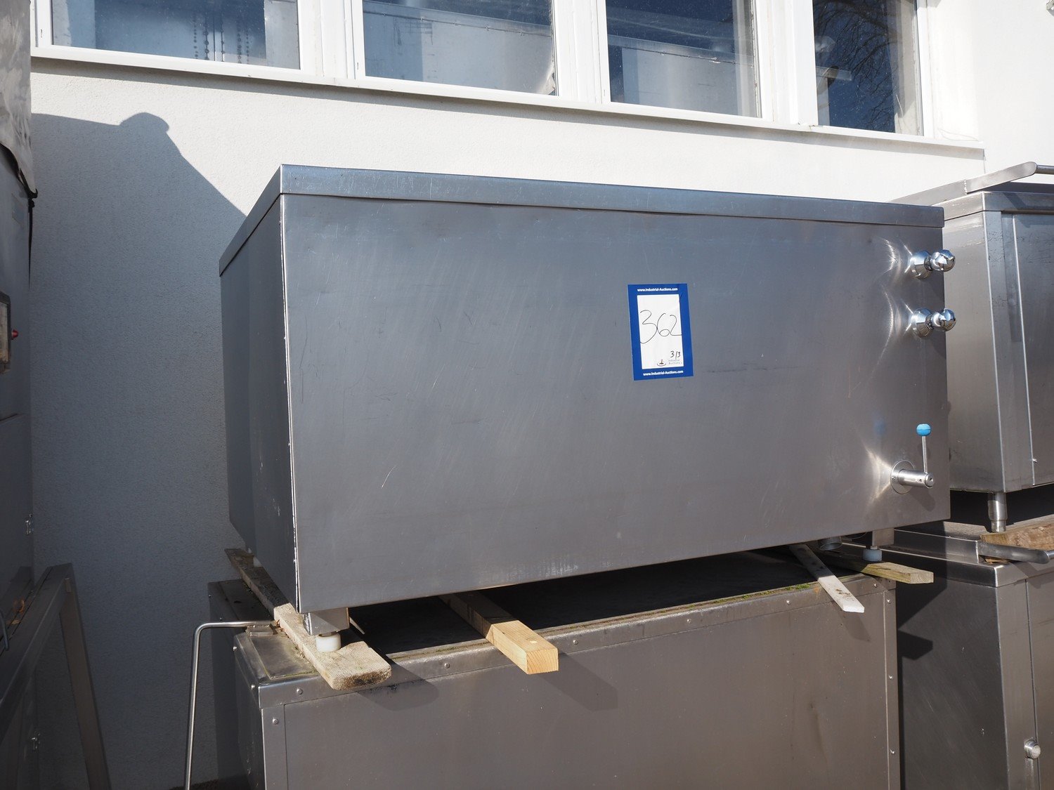 2 Doleschal s/s cooking vessels and s/s cooling vessel, inside dimensions cooking vessels: (2x) 1450 mm x 800 mm x 530 mm, total dimensions: (2x) 1600 mm x 1350 mm x 1080 mm, inside dimensions cooling vessels: 1400 mm x 1090 mm x 570 mm, total dimensions: 1600 mm x 1290 mm x 950 mm.