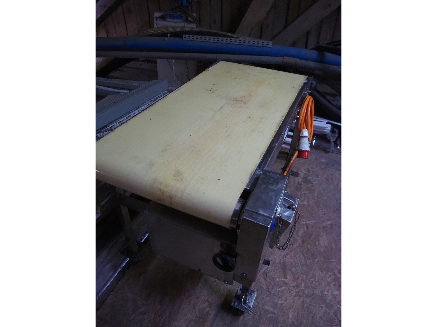 Mobile transport belt, s/s frame, plastic belt, belt width: 600 mm, total dimensions: 1370 mm x 850 mm x 950 mm.