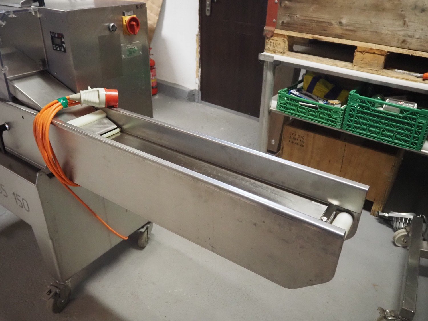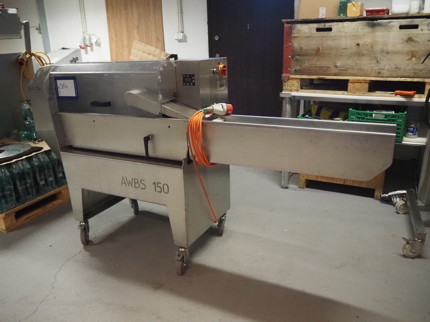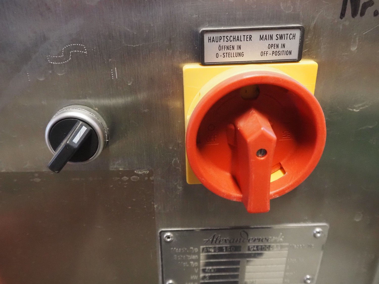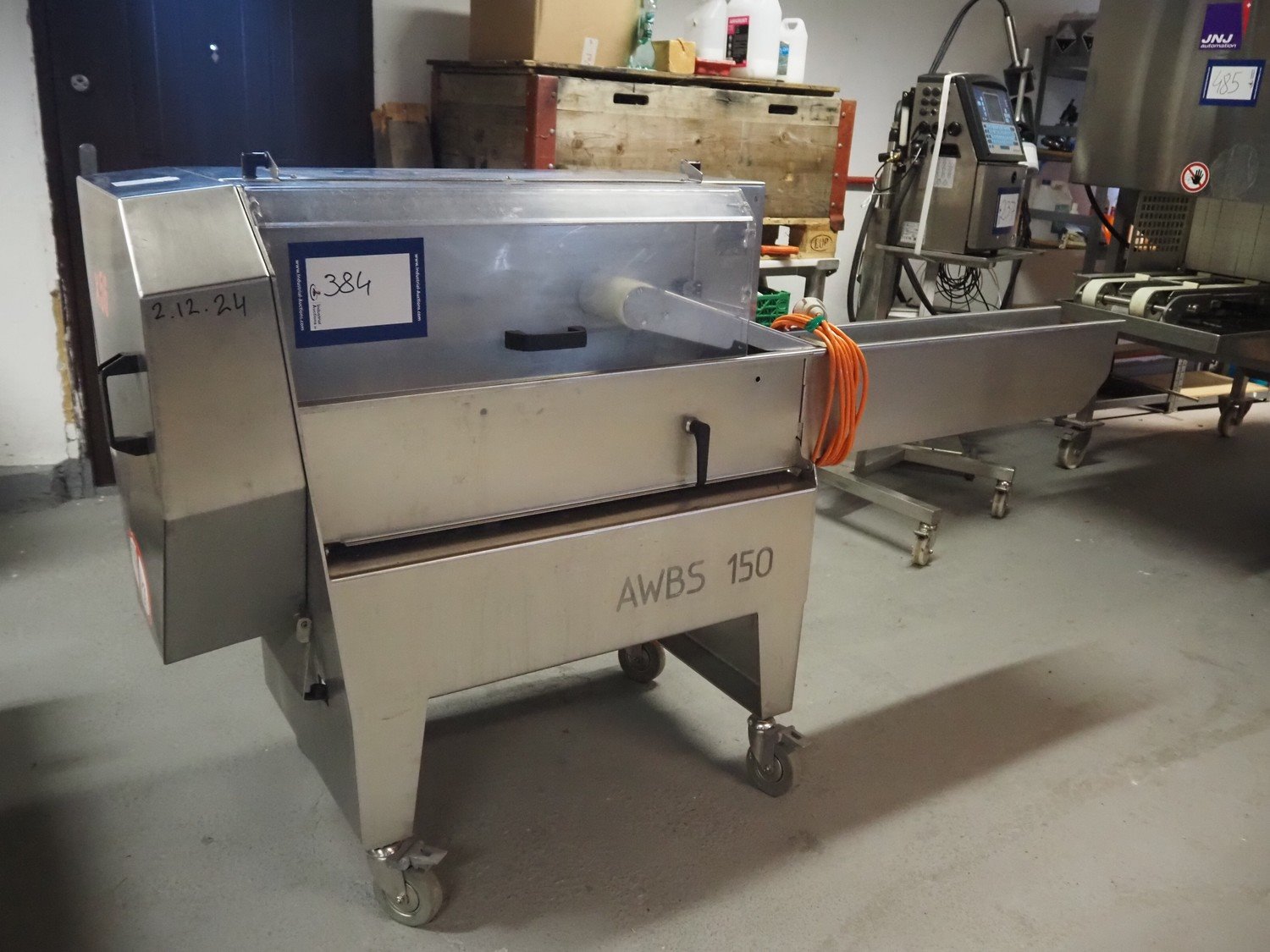 Alexanderwerk mobile belt slicer, type: AWBS 150, machine number: 04800029, 400 V, 50 Hz, 2 kW, belt width: 150 mm, clearance: 150 mm x 150 mm, total dimensions: 2240 mm x 630 mm x 1200 mm. Missing belt.