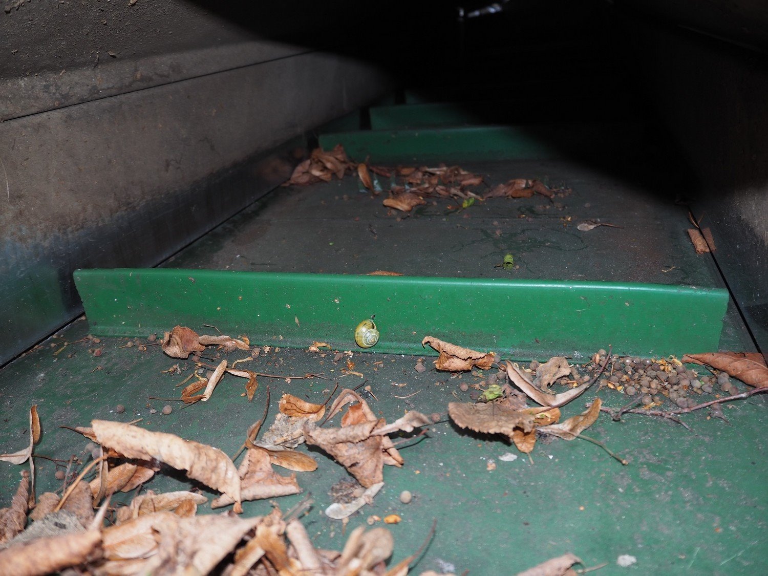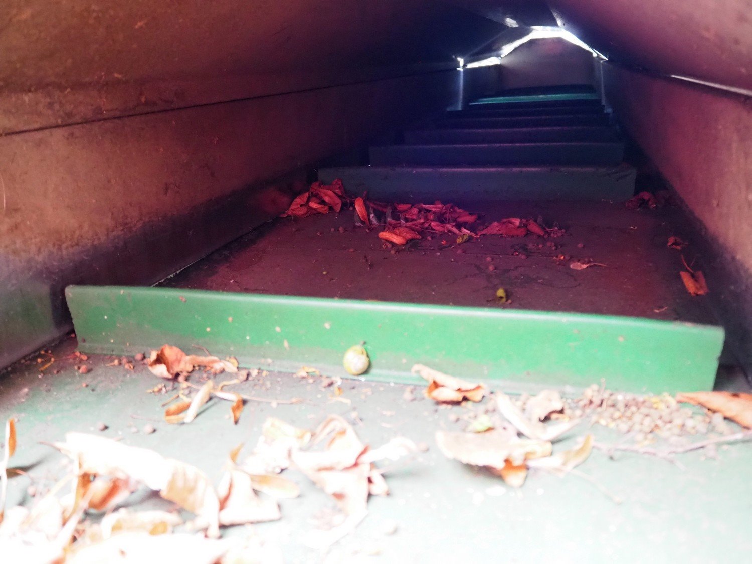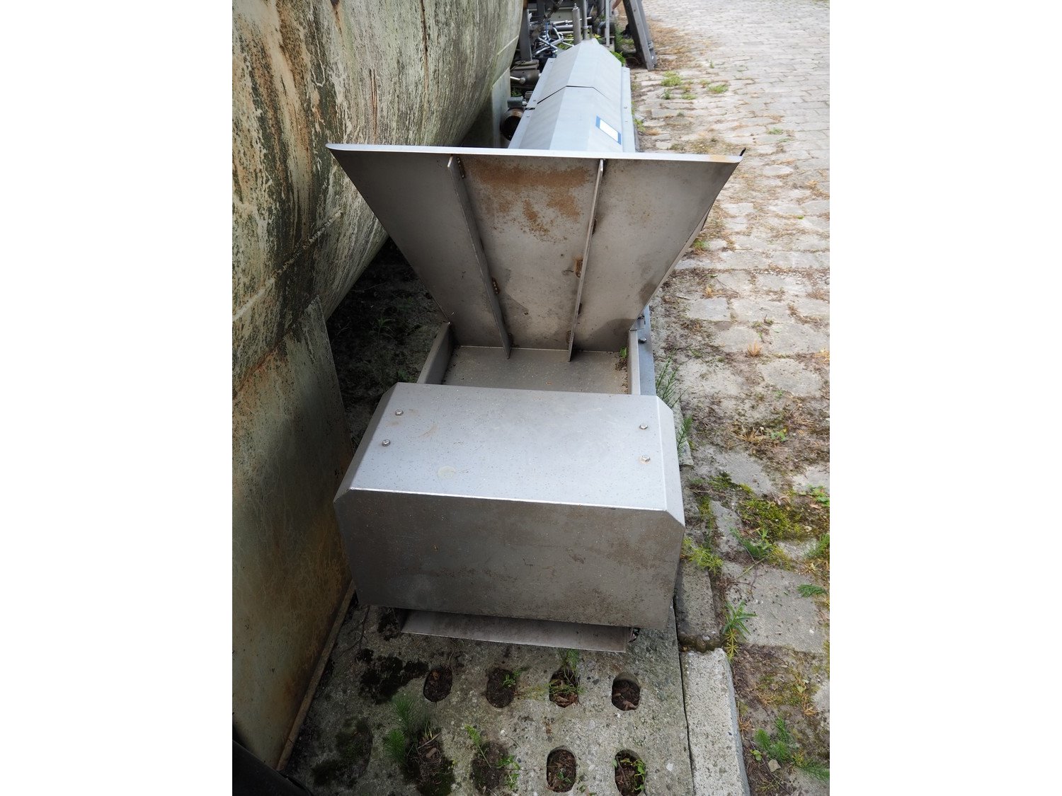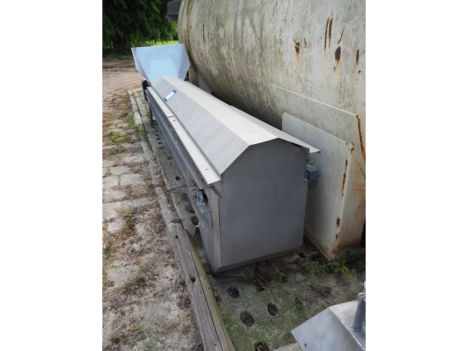 Elevating belt, plastic belt with dividers, belt width: 450 mm, divider height: 50 mm, distance between dividers: 255 mm, total dimensions: 4320 mm x 800 mm x 1250 mm. Missing legs.