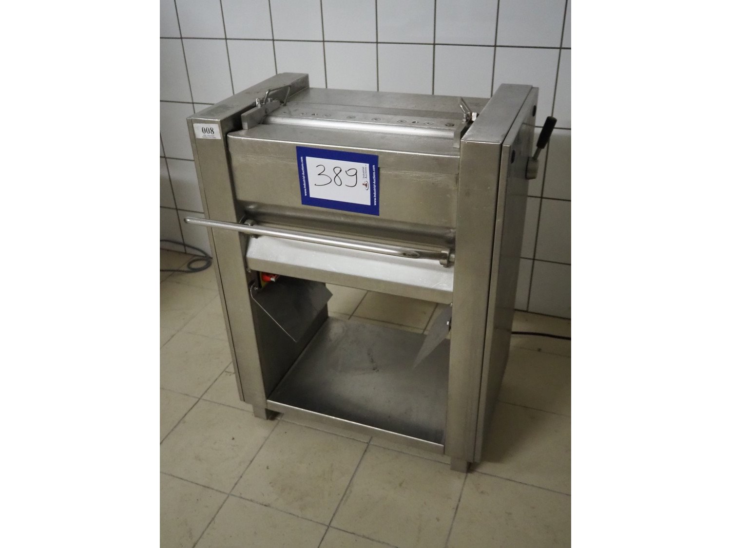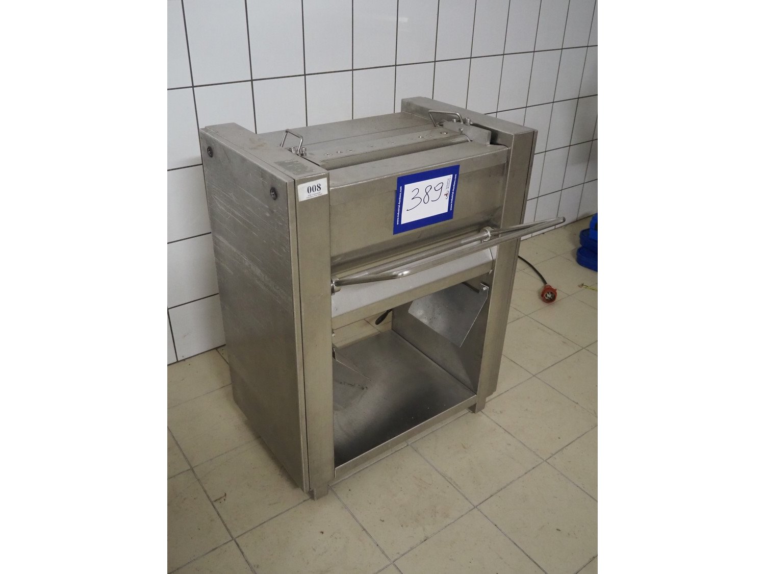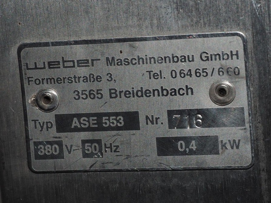 Weber mobile skinning machine, type: ASE 553, number: 716, 380 V, 50 Hz, 0.4 kW, working width: 500 mm, total dimensions: 820 mm x 700 mm x 1040 mm.