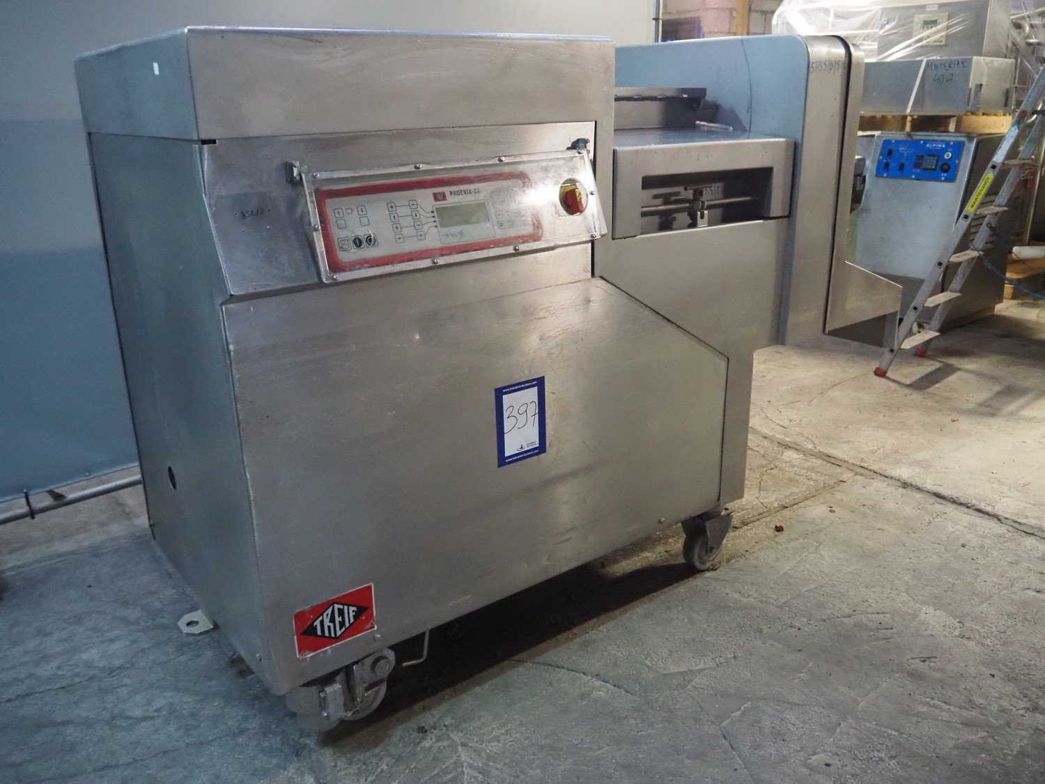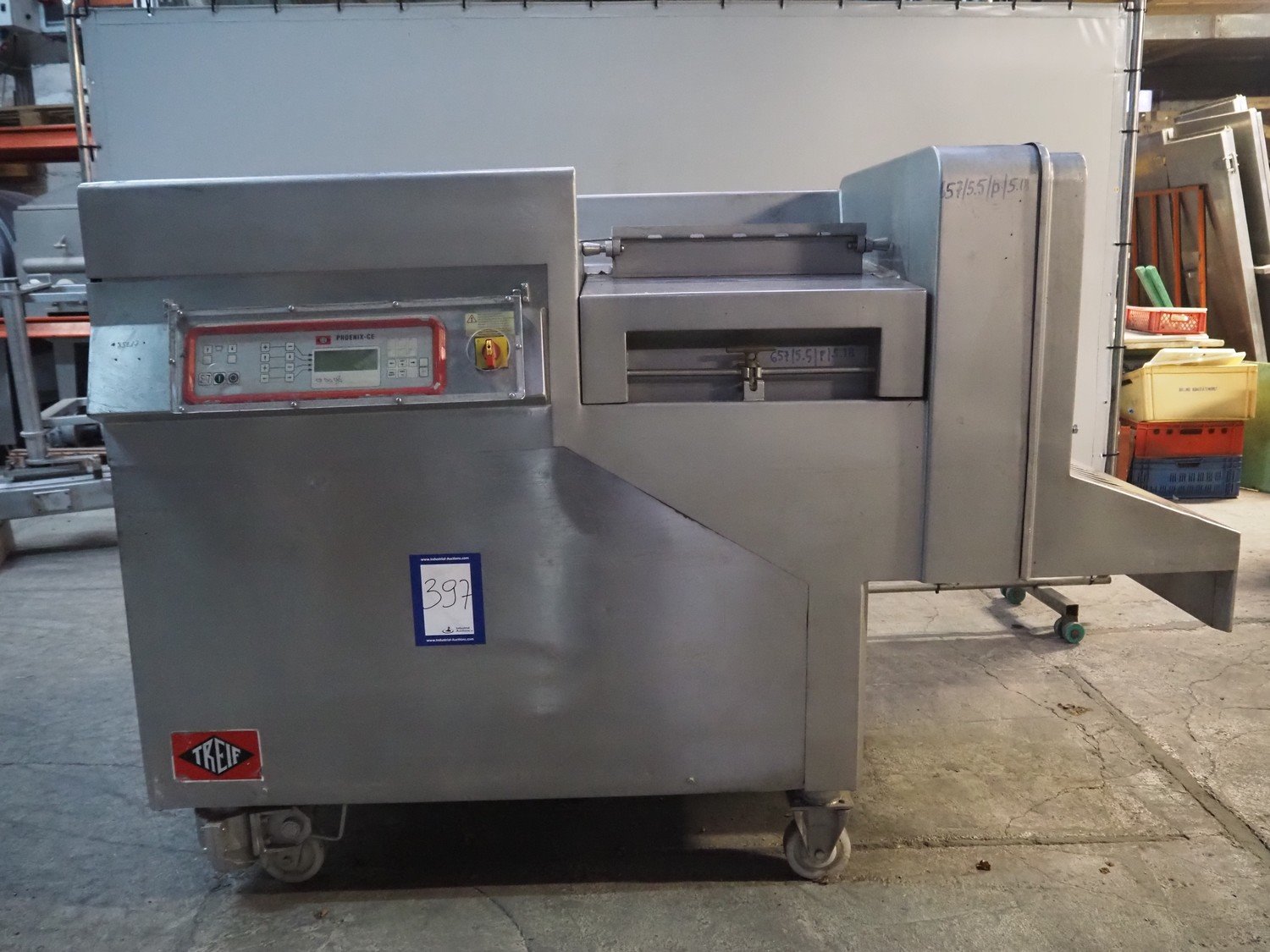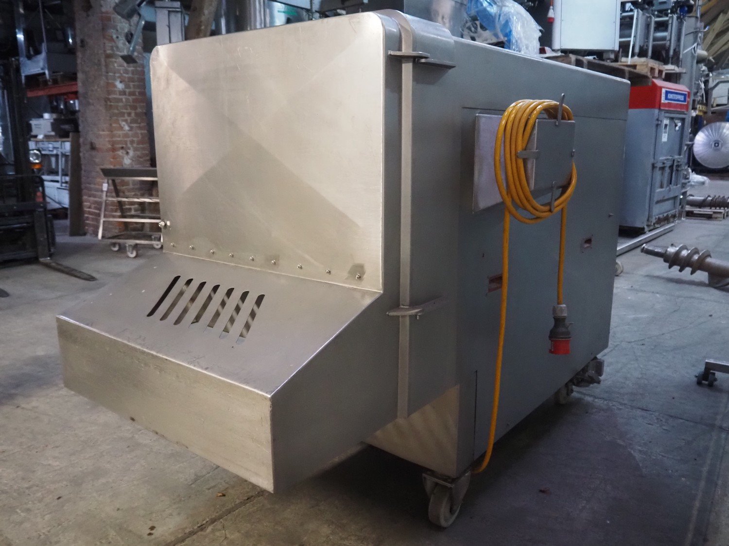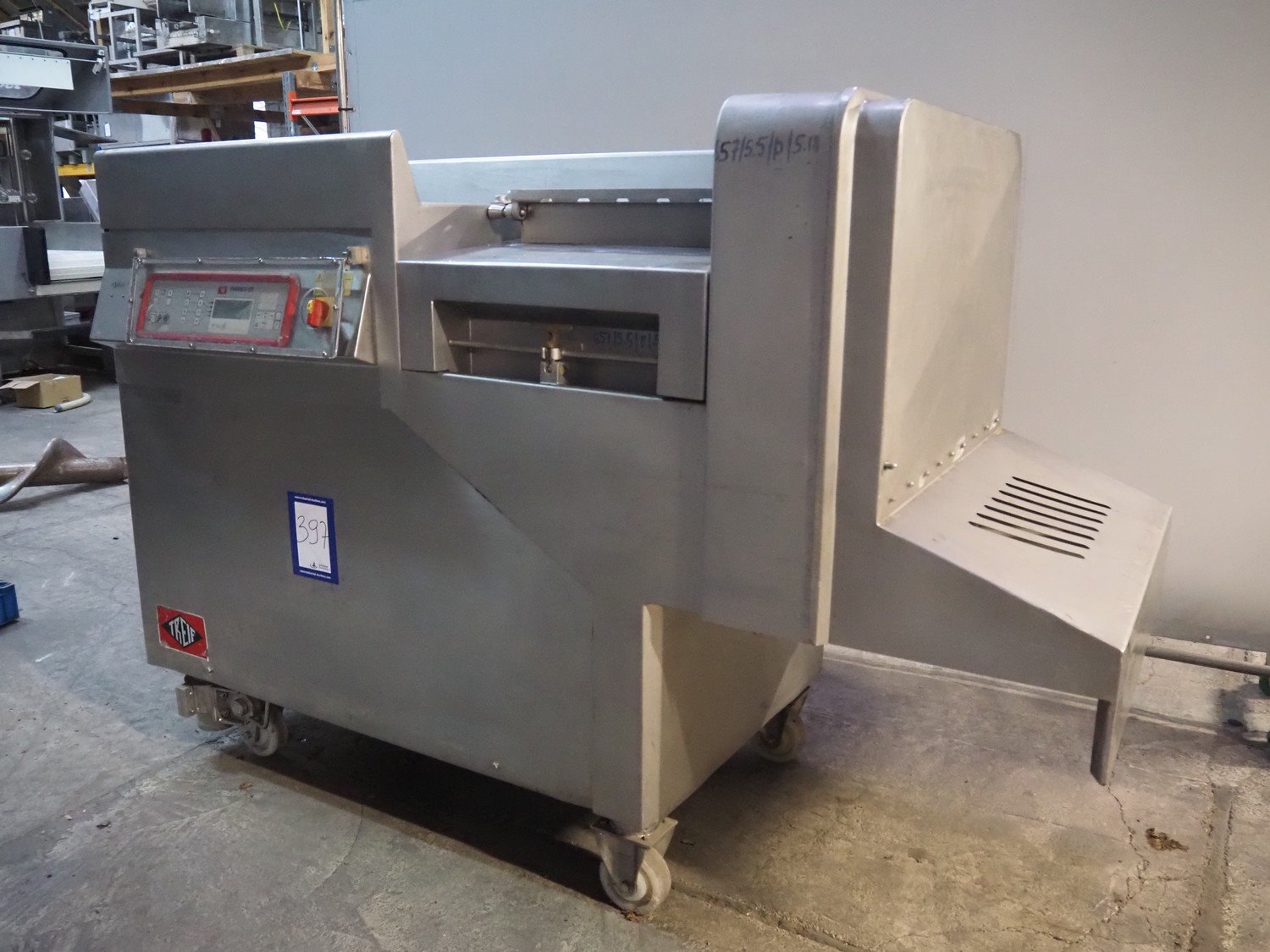 Treif mobile dicer, model: Phoenix-CE, chamber dimensions: 120 mm x 120 mm x 650 mm, distance between knives: 25 mm x 30 mm, total dimensions: 2350 mm x 960 mm x 1600 mm. Extra knife set, distance between knives: 10 mm and 20 mm. Without lifter.