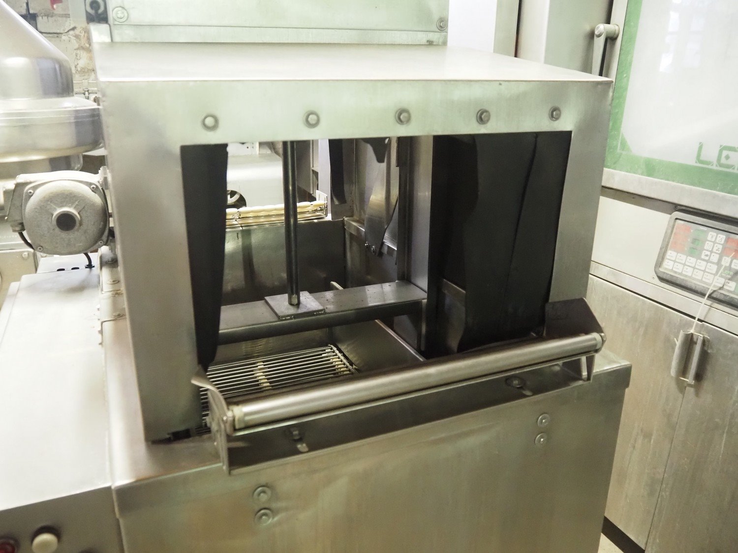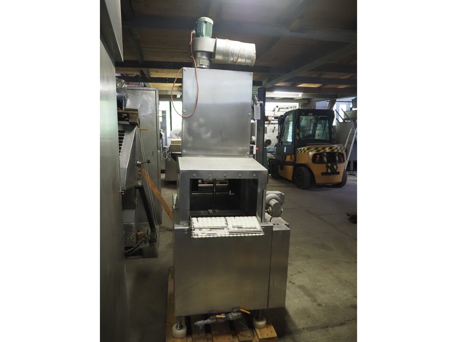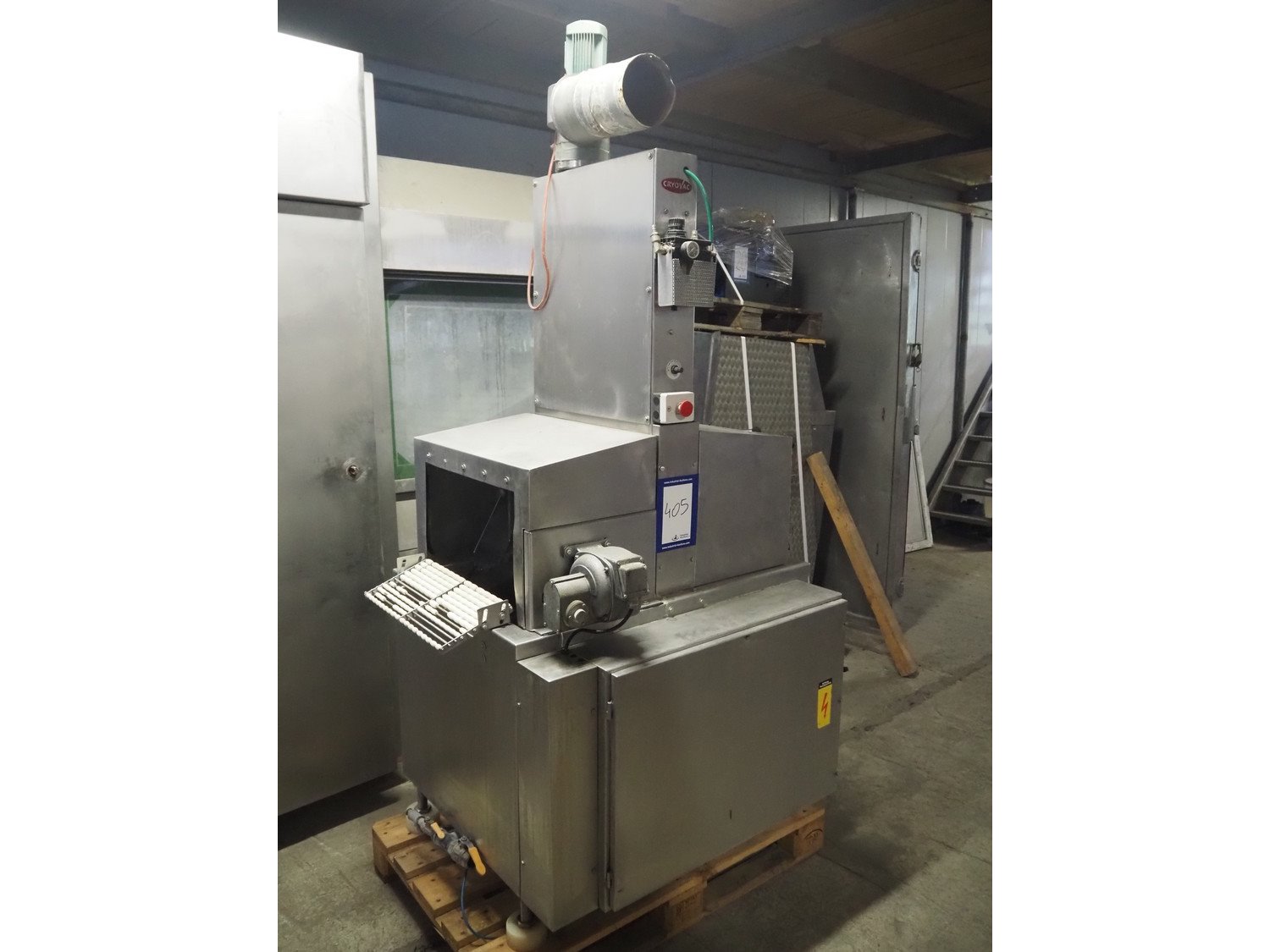 Cryovac dip tank, plastic rollers, roller width: 450 mm, s/s pin and chain conveyor, belt width: 450 mm, total dimensions: 1300 mm x 900 mm x 2350 mm.