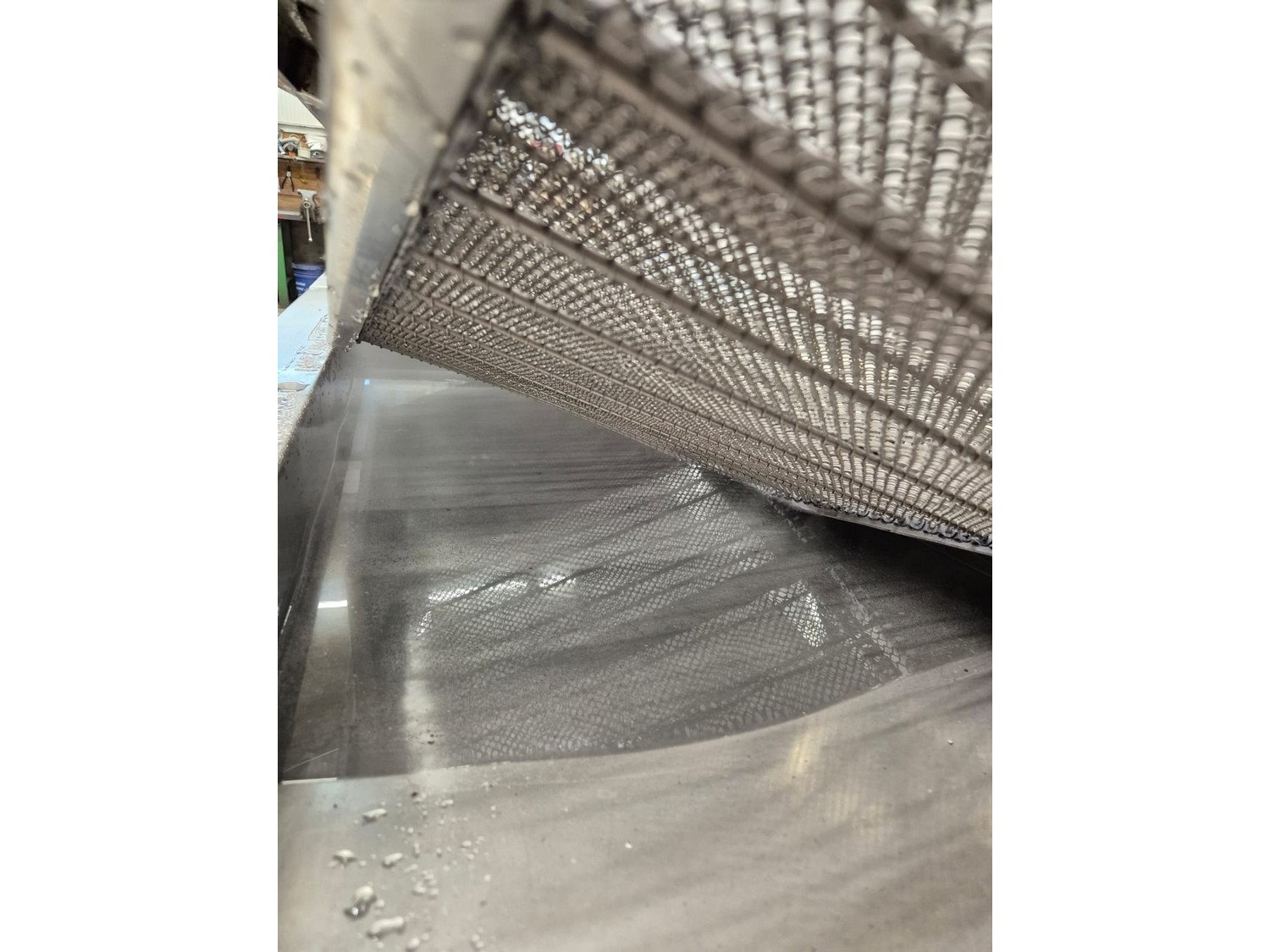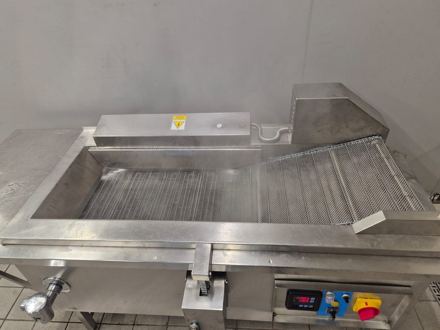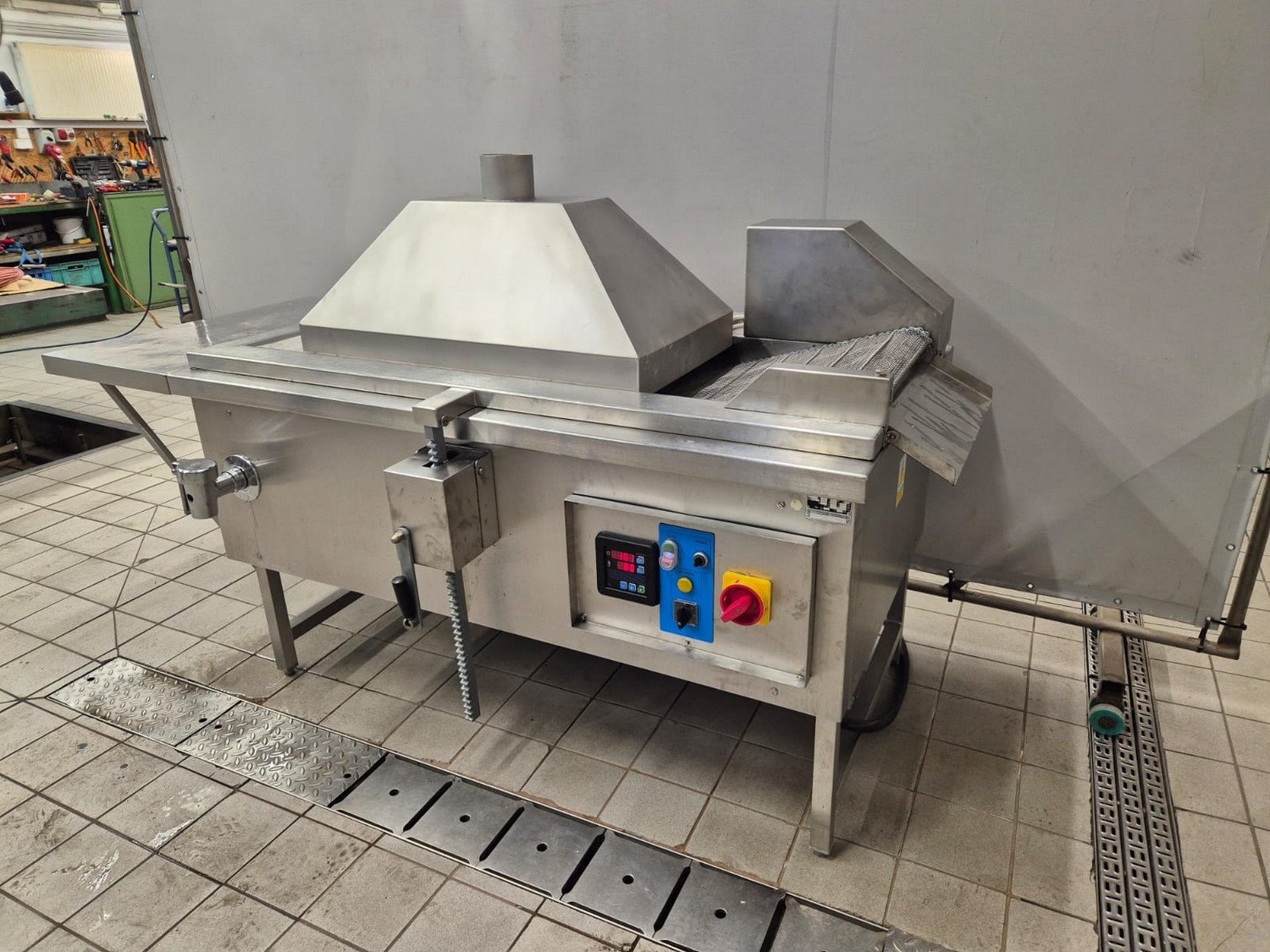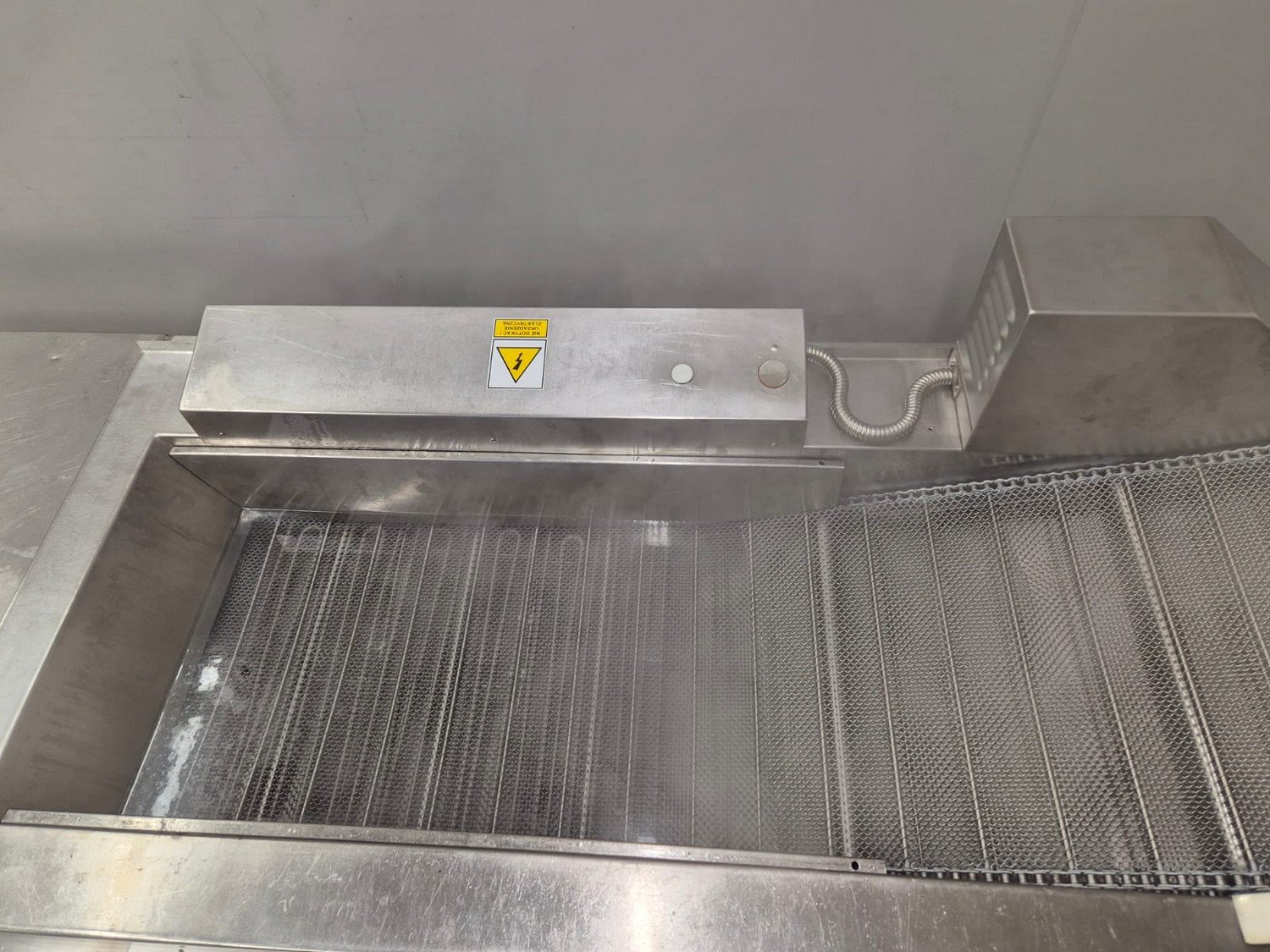 Küppersbusch continuous fryer, type: KGT 0009, 400 V, 3 Ph, 50 Hz, 39.8 kW, s/s mesh belt, belt width: 450 mm, total dimensions: 2250 mm x 1200 mm x 1100 mm. Overhauled by Servo.
