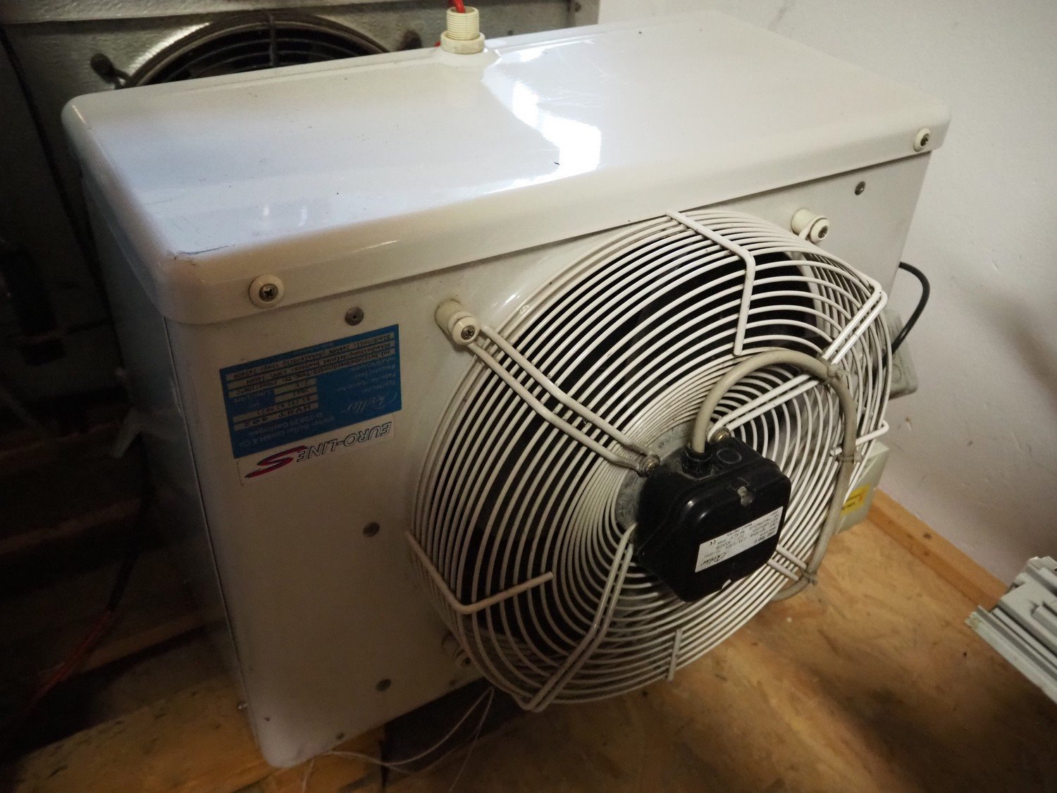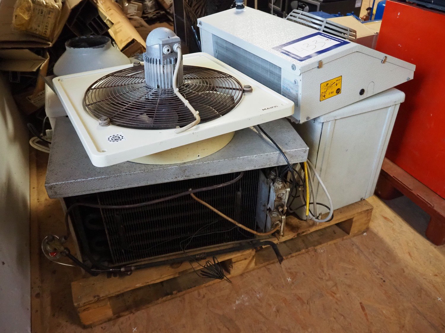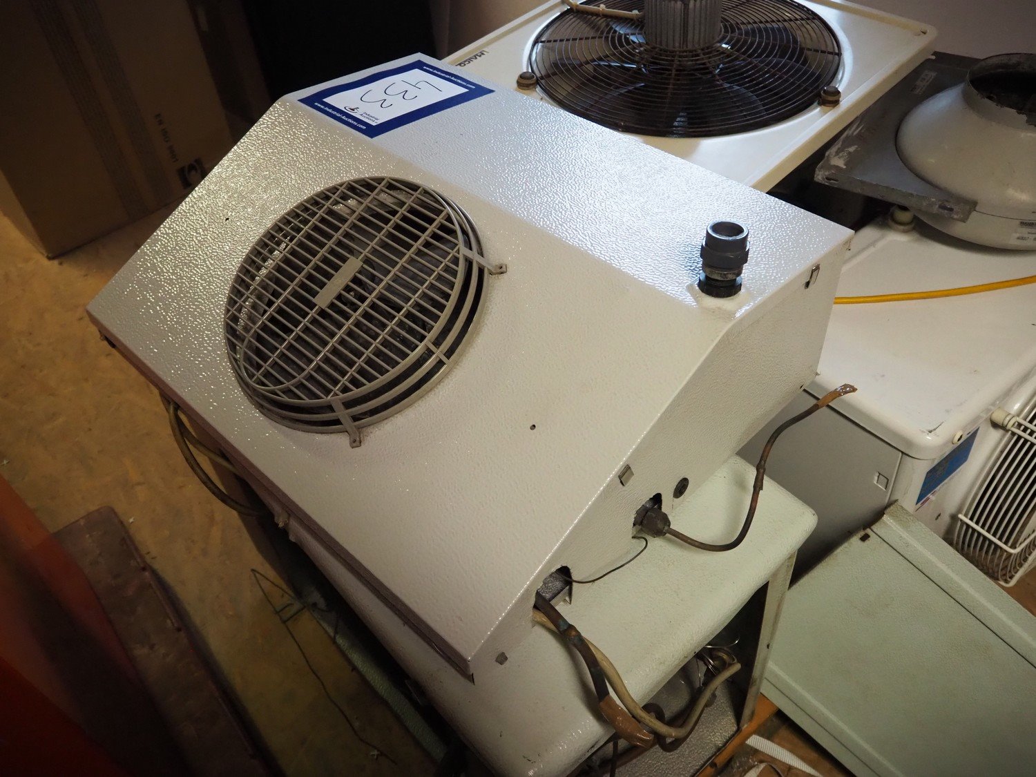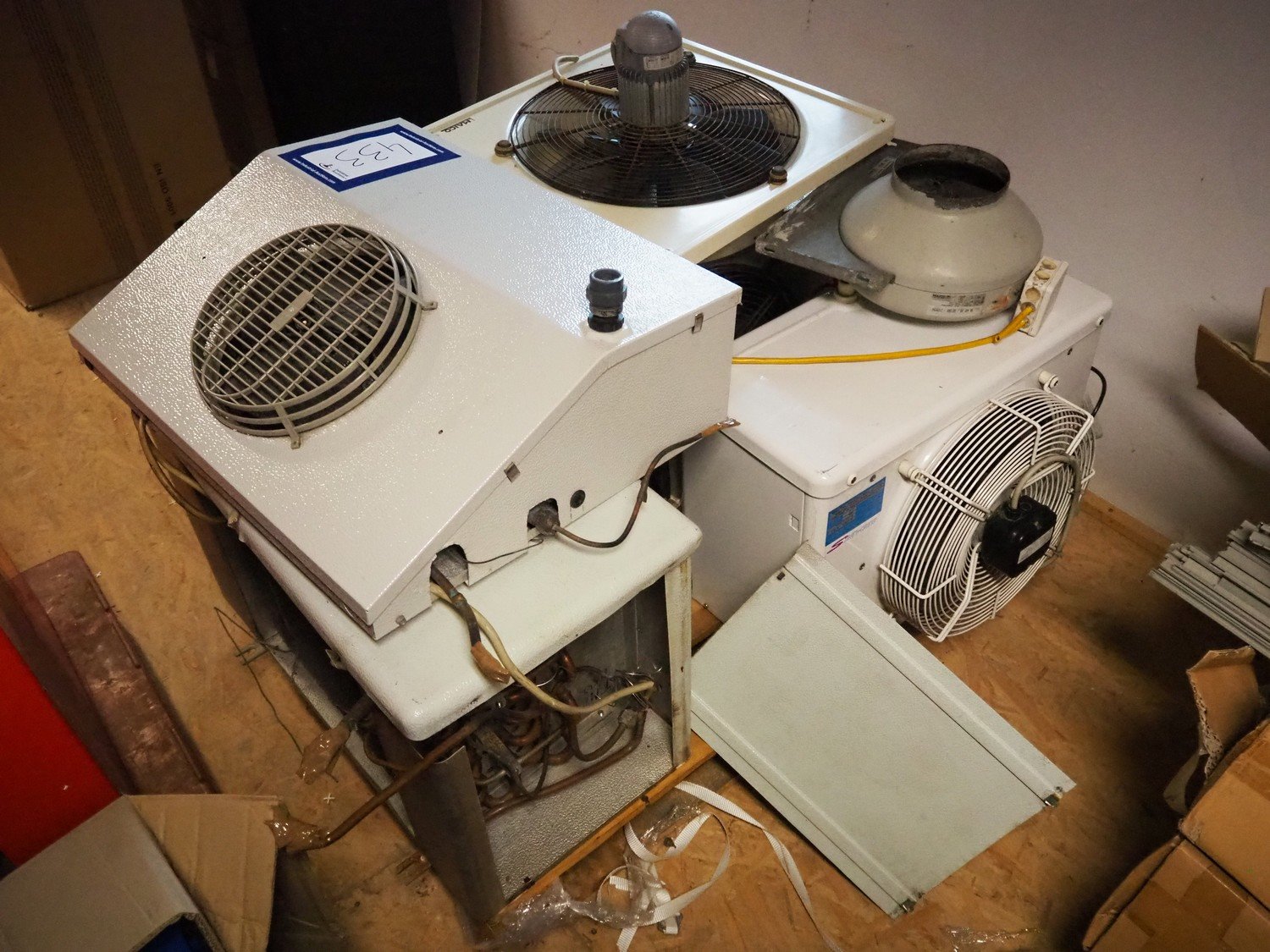 Various evaporators and fans, among other: Küba evaporator, type: DEAE 051C DECKEN-LUFTKÜHLER, Walter Roller GmbH & Co. Evaporator, model: HVST 402, various dimensions, among others: 700 mm x 540 mm x 250 mm and 760 mm x 400 mm x 500 mm.
