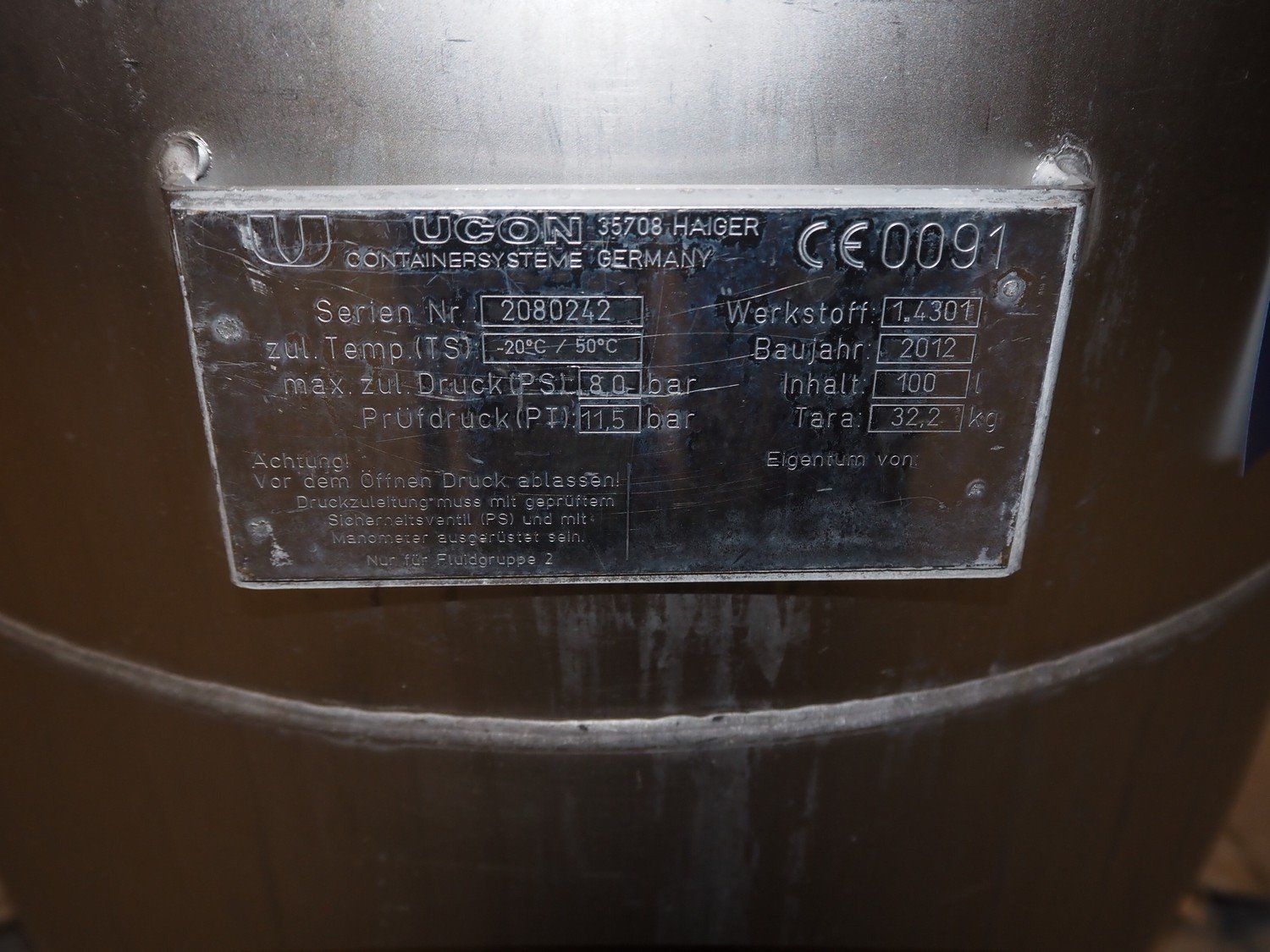 Ucon Containersysteme mobile foam unit, serial number: 2080242, year of construction: 2012, volume: 100 liter, weight: 32.2 kg, maximum pressure: 8.0 bar, temperature range: -20 °C / 50 °C, dimensions: Ø 650 mm x 1000 mm.