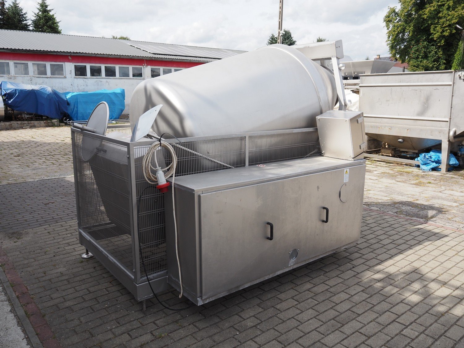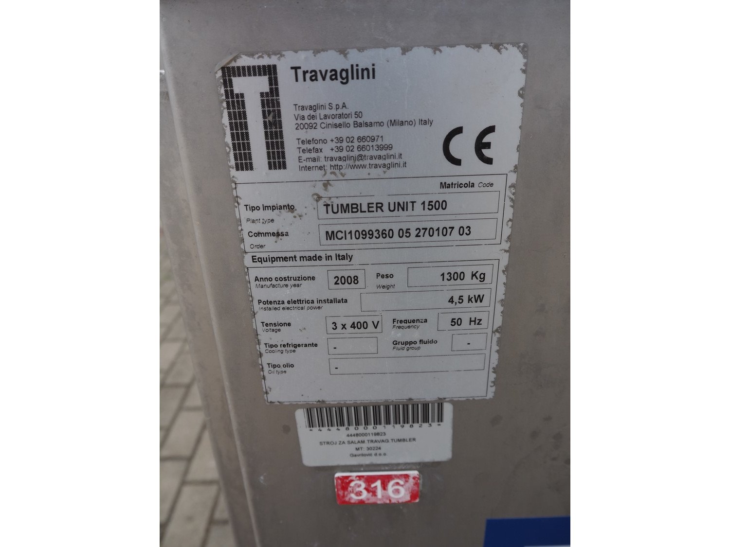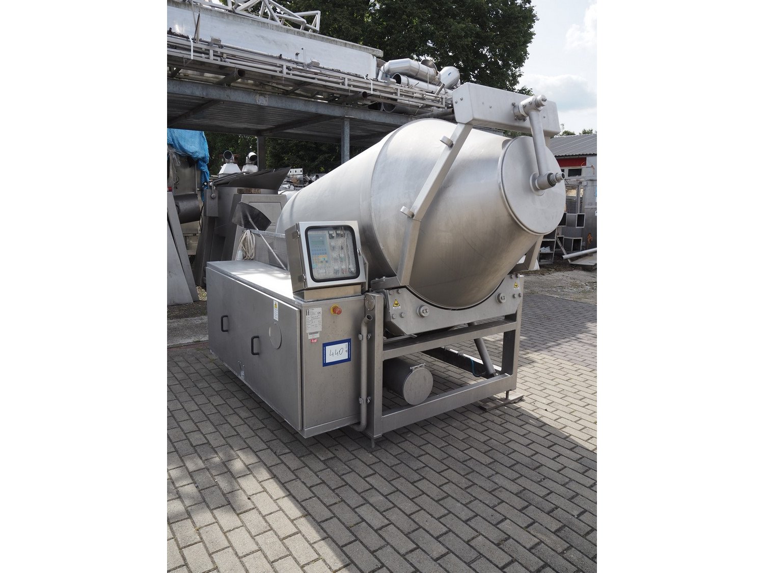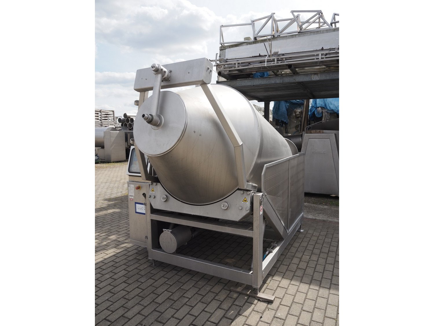 Travaglini S.p.A. vacuum tumbler, type: TUMBLER UNIT 1500, year of construction: 2008, 400 V, 3 Ph, 50 Hz, 4.5 kW, weight: 1300 kg, volume: 1500 liters, with Multivac vacuum pump, dimensions: 3100 mm x 1900 mm x 2200 mm.