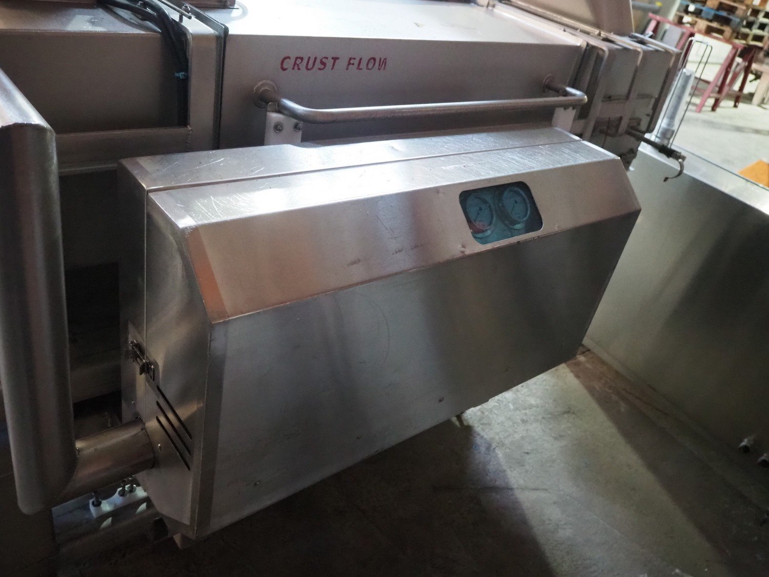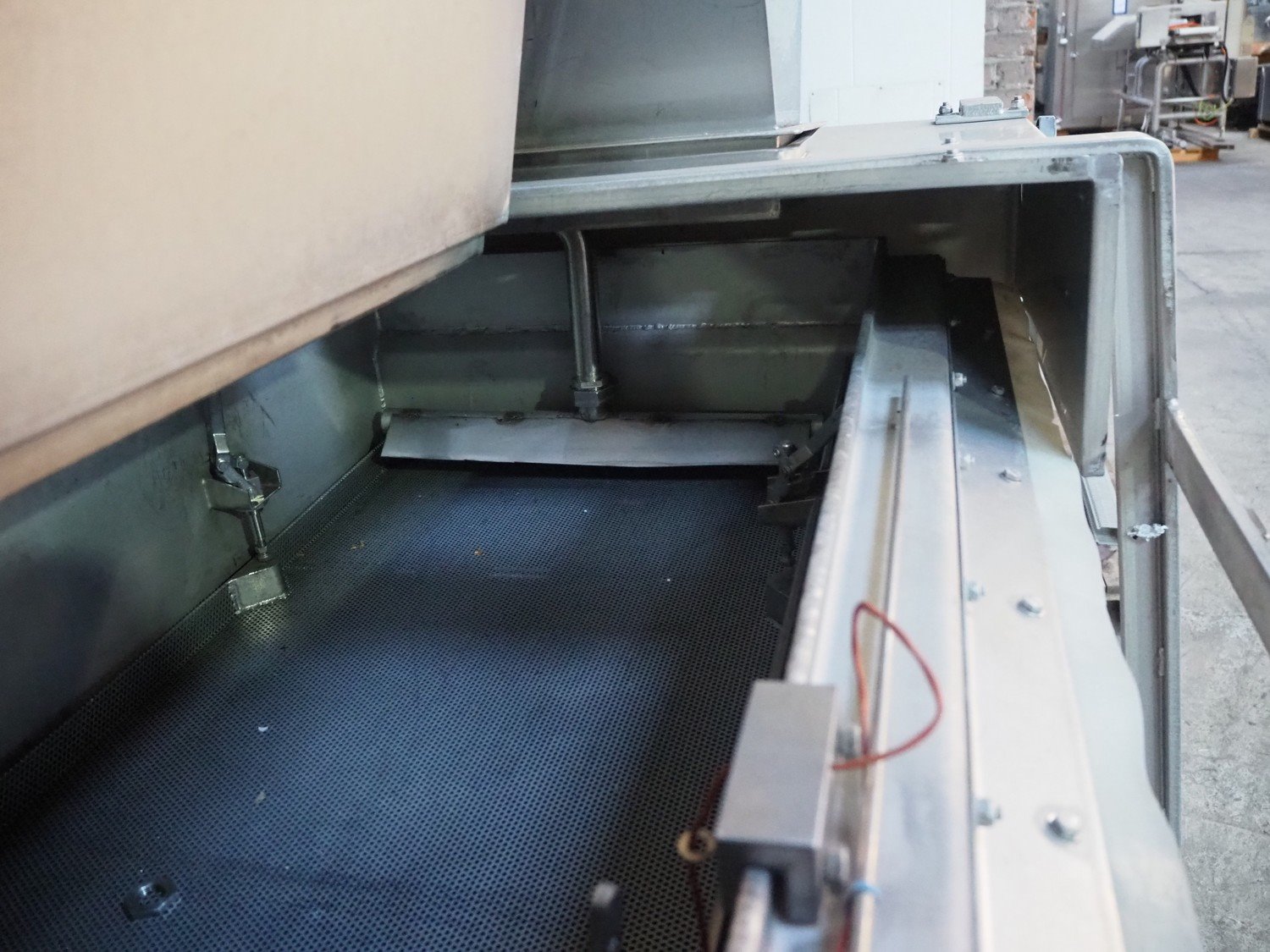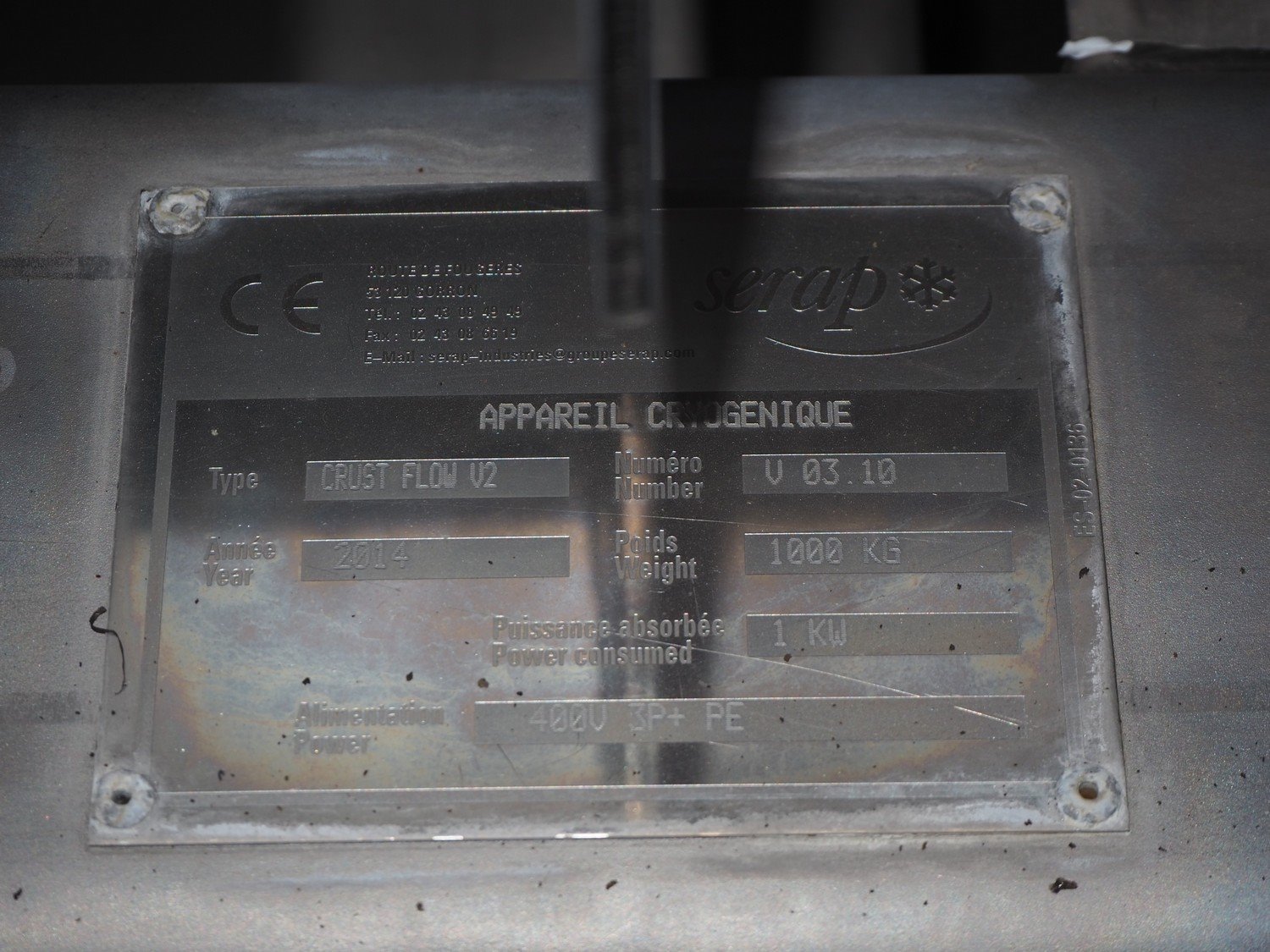 Serap shock freezing tunnel, type: crust flow V2, number: V 03.10, year of construction: 2014, 400 V, 3P+ PE, 1 kW, 1000 kg, s/s gutter, gutter width: 535 mm, total dimensions: 2180 mm x 1500 mm x 1800 mm.