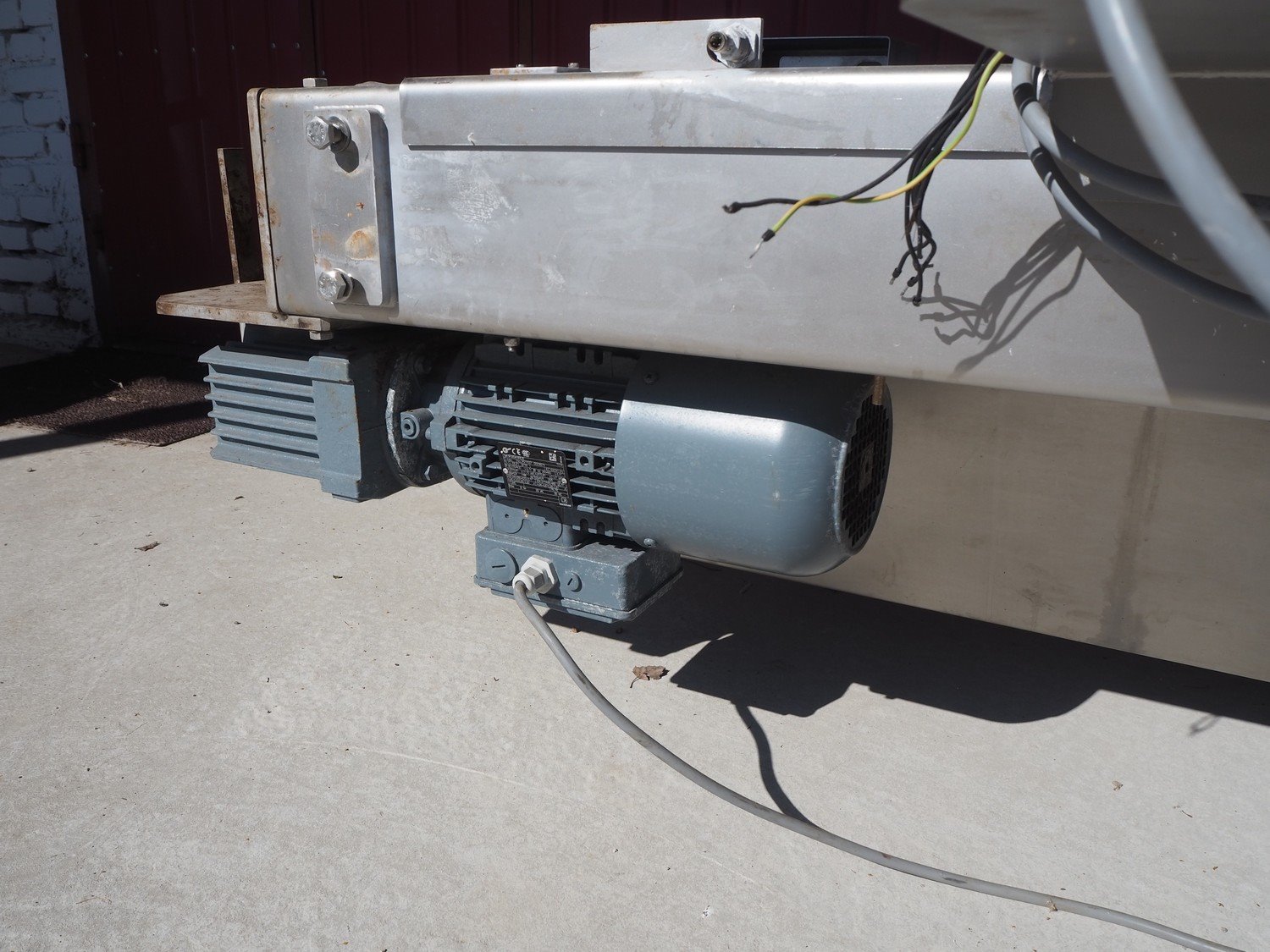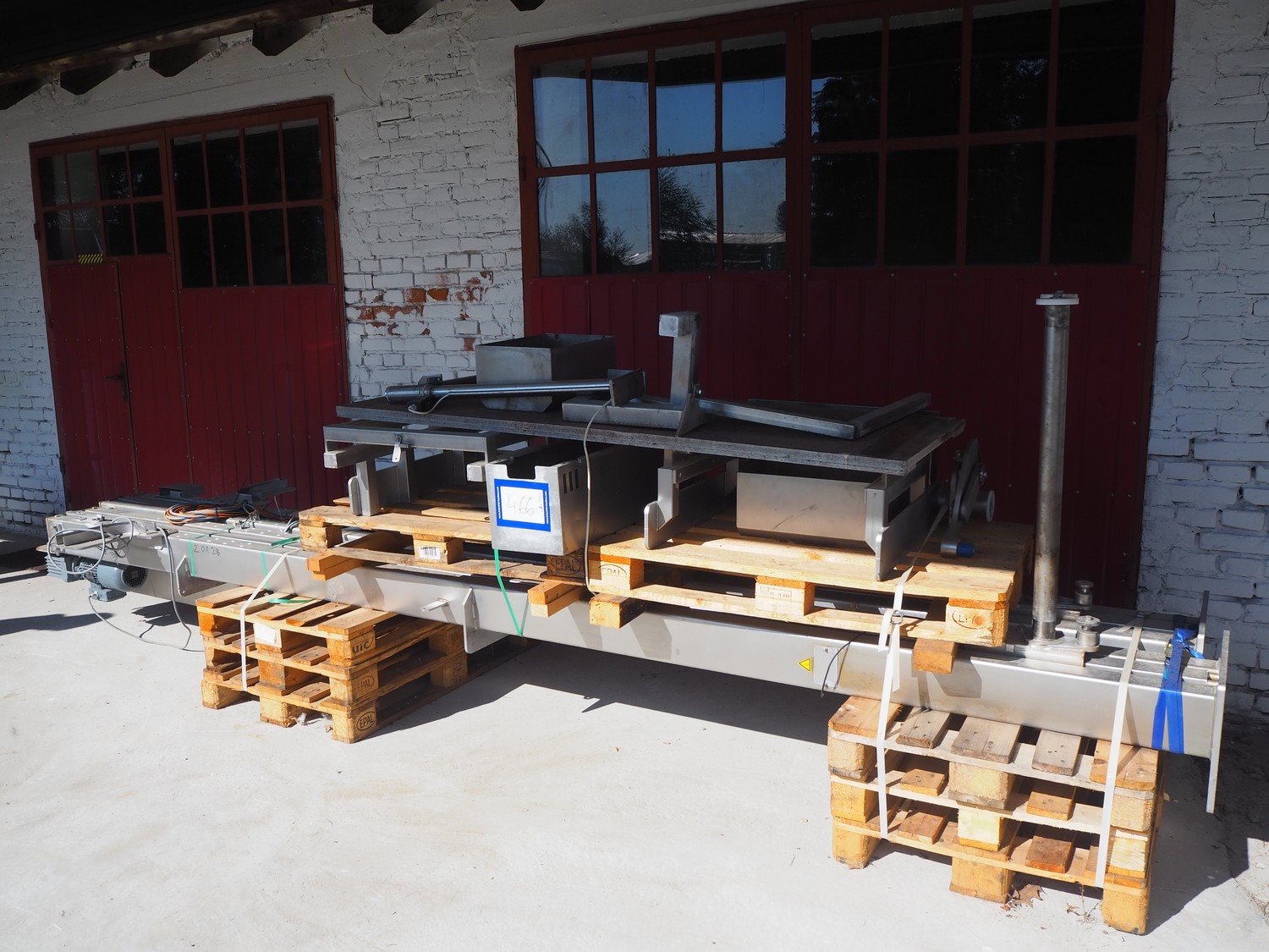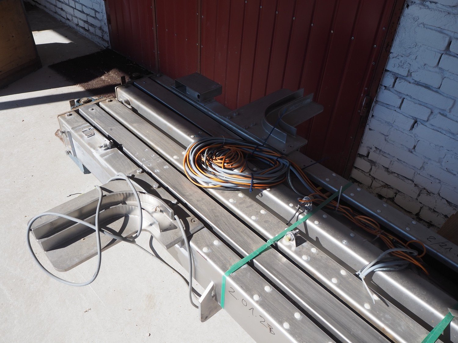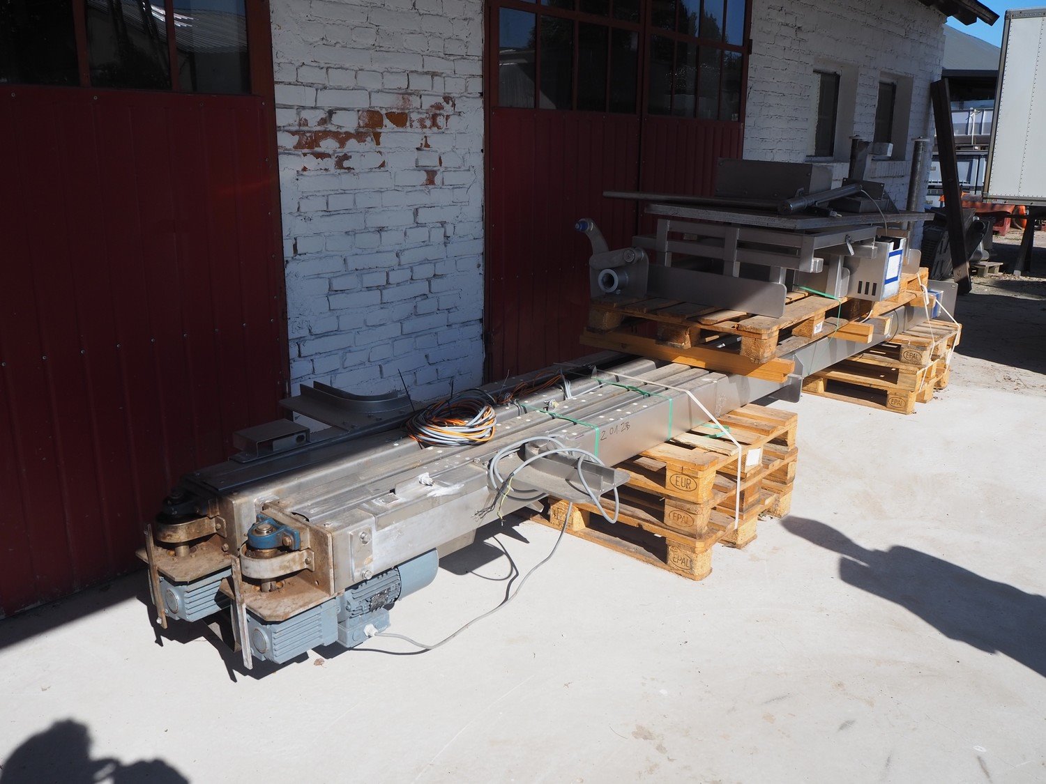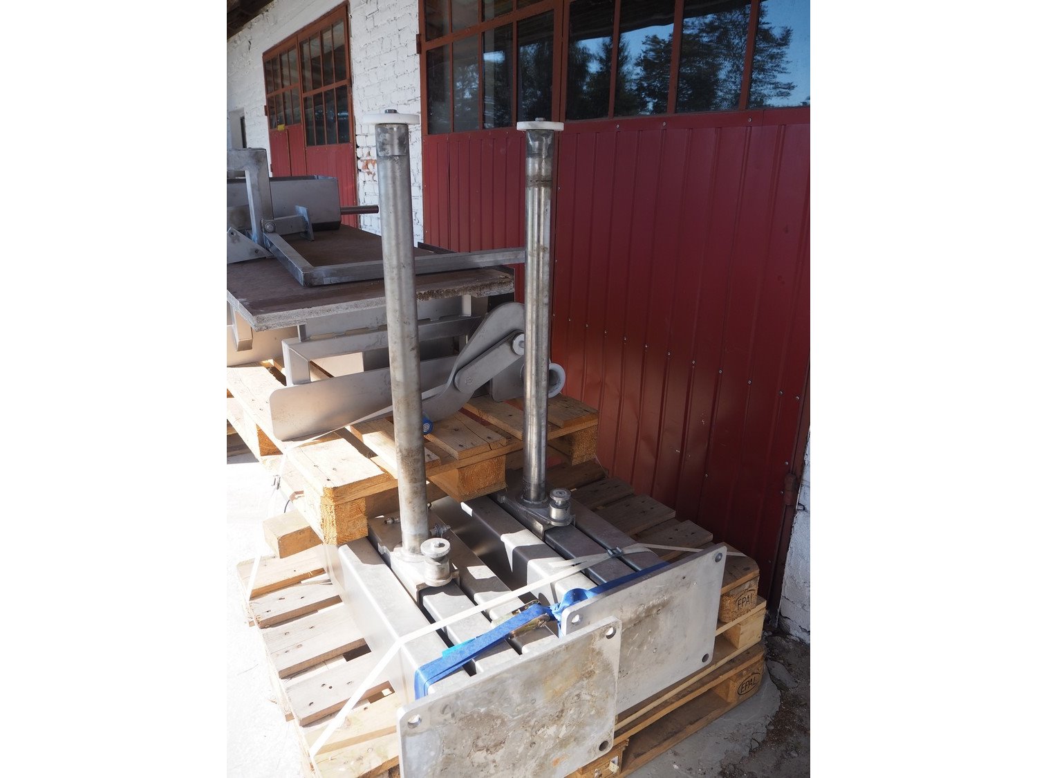 2 s/s Itec lifters for 200 liter meat bins, elevating height: 4150 mm, total dimensions: 5200 mm x 1250 mm x 1550 mm.