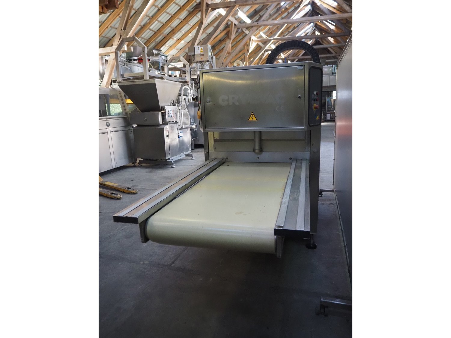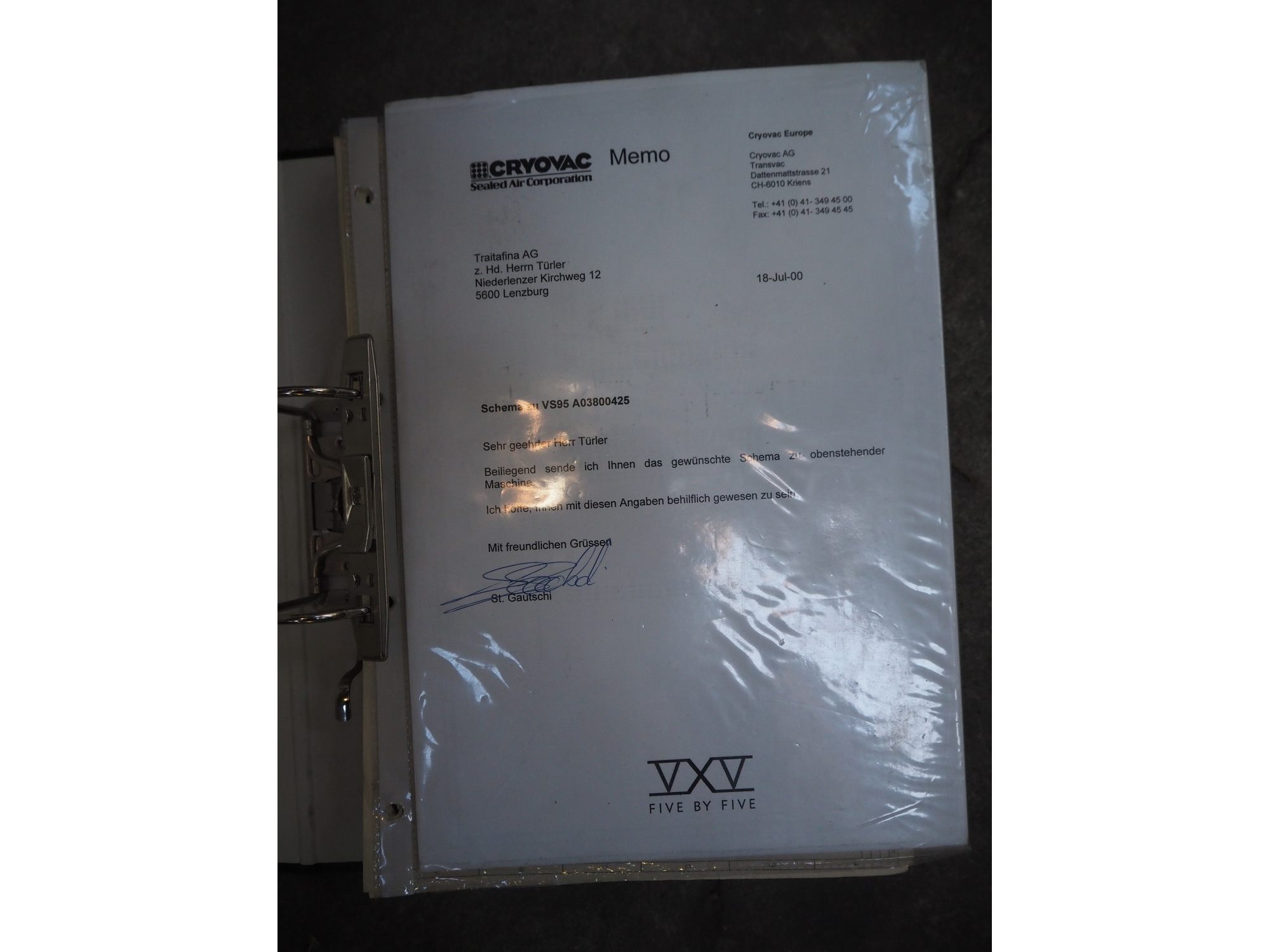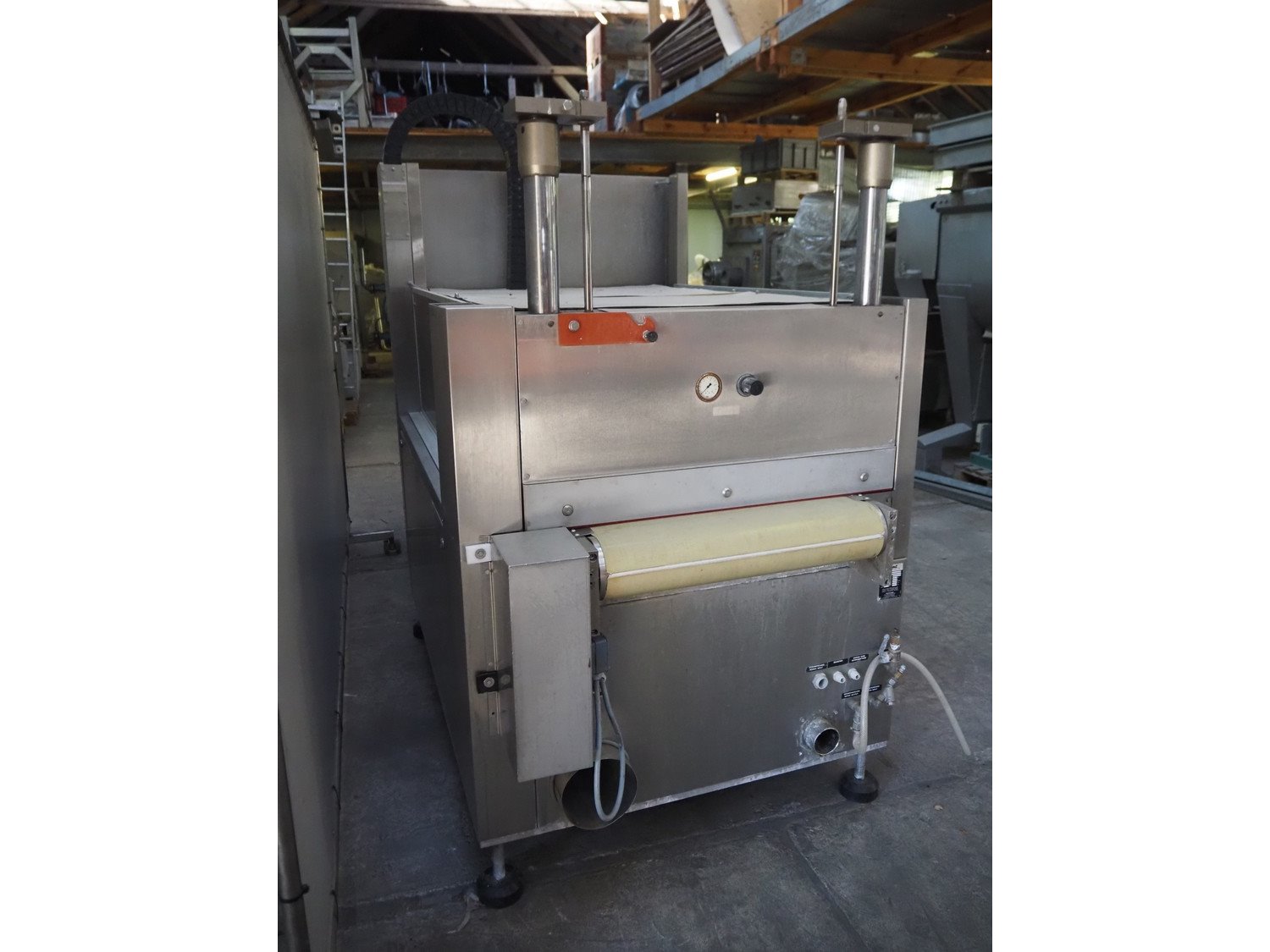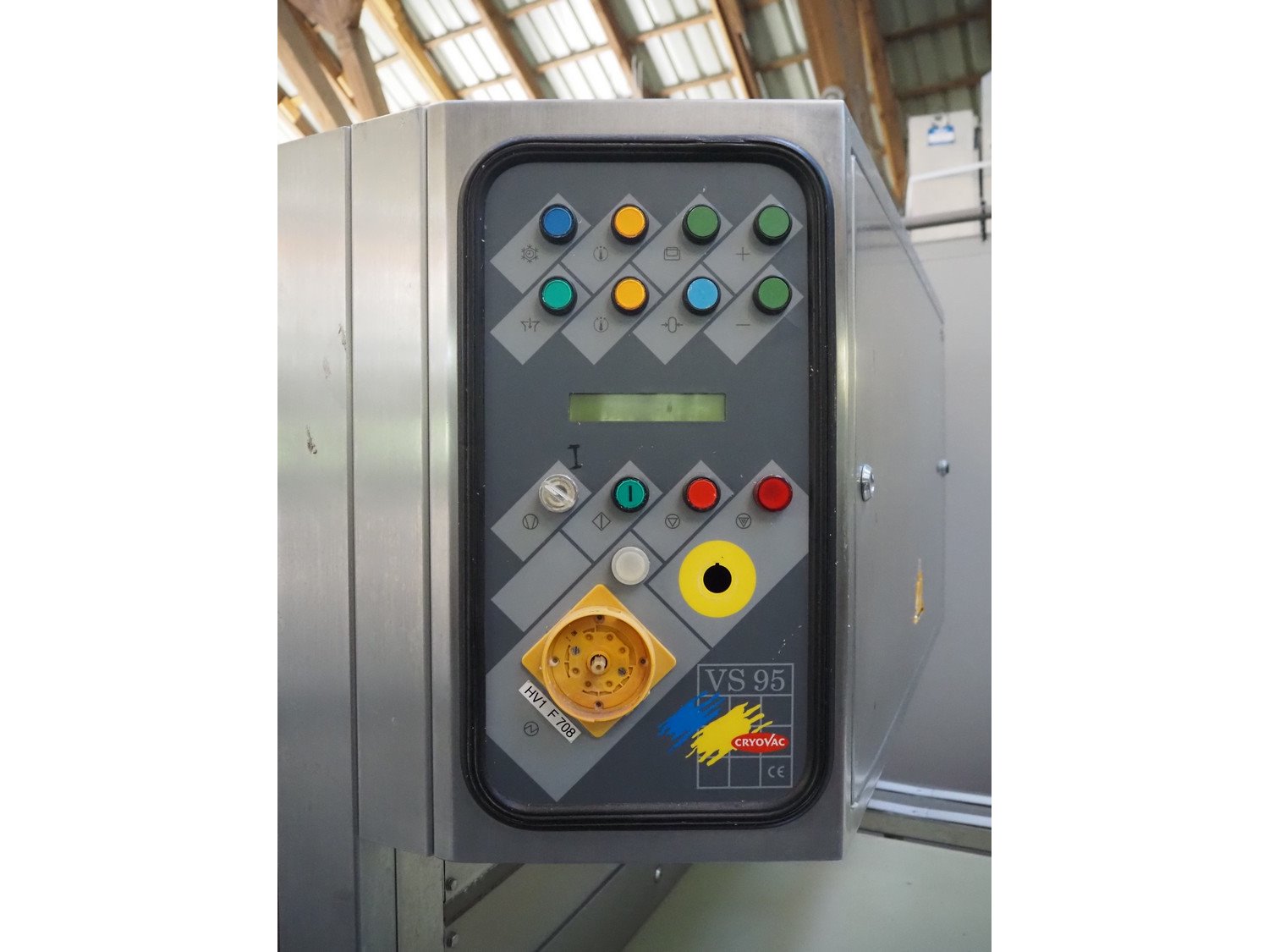 Cryovac belt vacuum machine, model: VS 95, serial number: A03800425, year of construction: 1997, 400 V, 3 Ph, 50 Hz, 17.5 kW, 4/6 bar, plastic belt, belt width: 730 mm, Busch vacuum pump, type: WV 1000 B 001 KDXX, serial number: C0508000392, total dimensions: 1900 mm x 880 mm x 1580 mm. Including crates with parts.