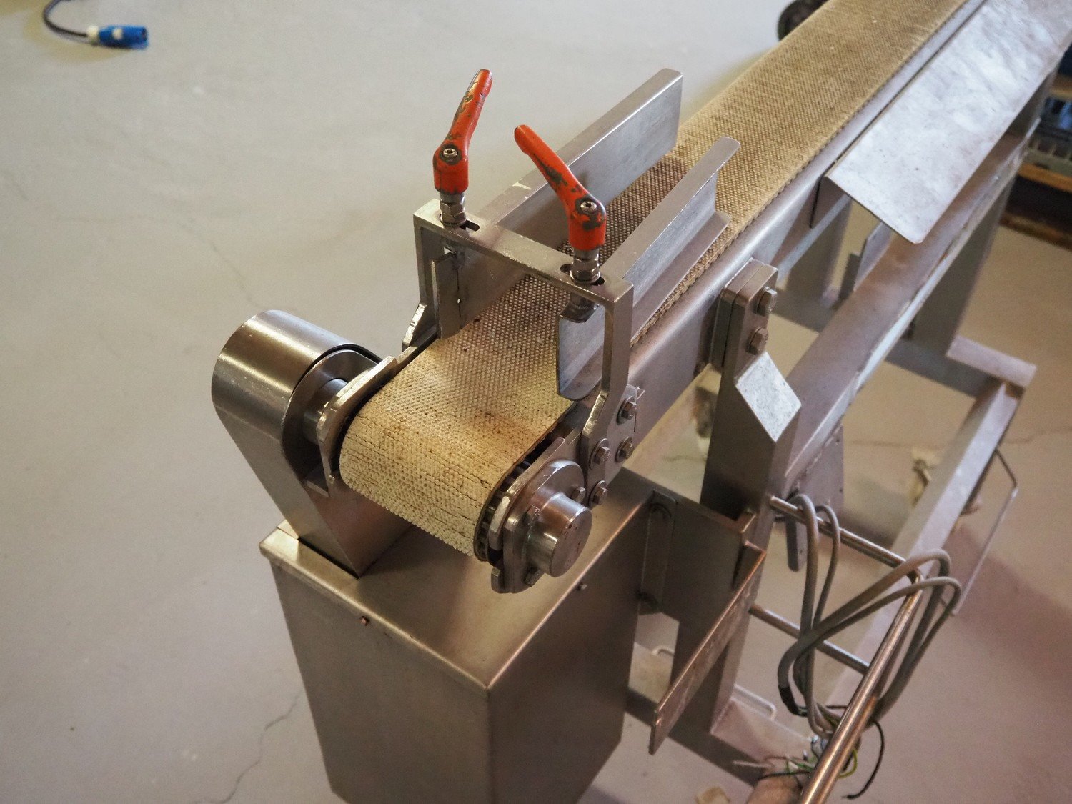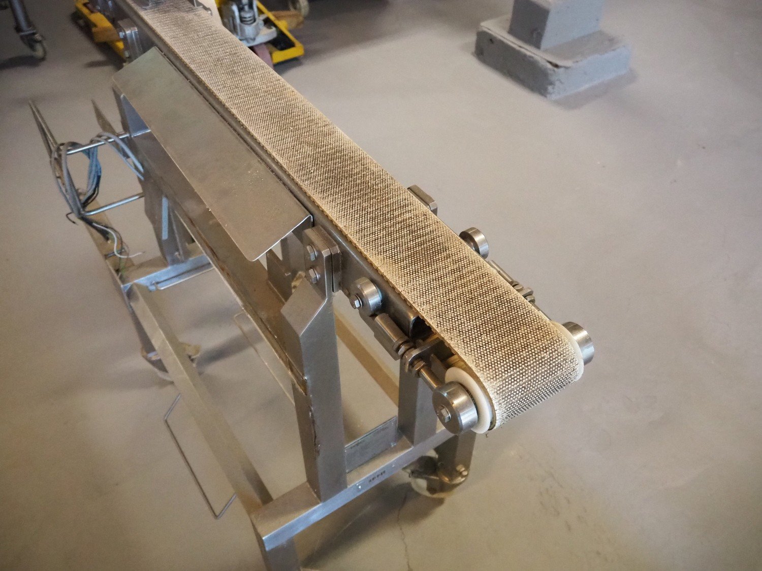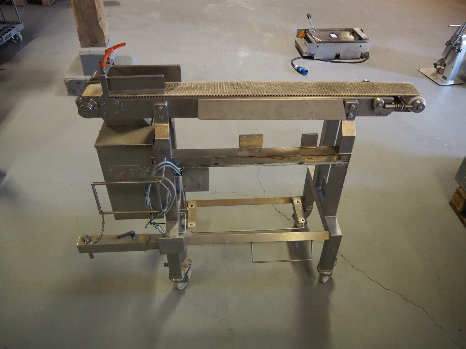 Innotec mobile transport belt, type: ISA_09, number: 020-009, year of construction: 2011, 400 V, 3 Ph, 50/60 Hz, 14 A, 4.5 kW, plastic belt, belt width: 100 mm, total dimensions: 1220 mm x 460 mm x 1050 mm.