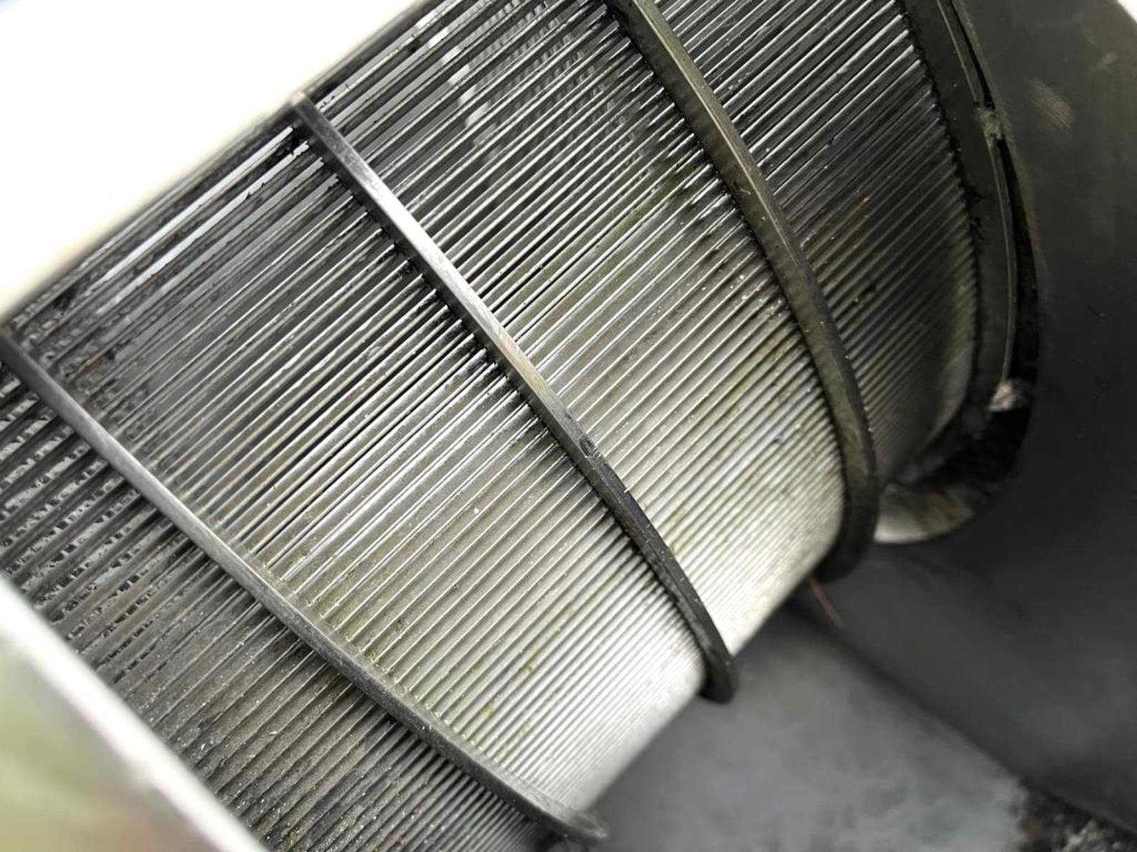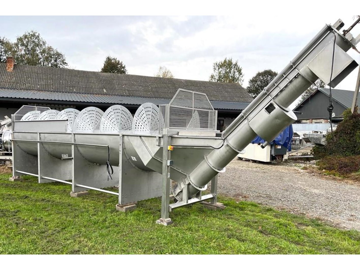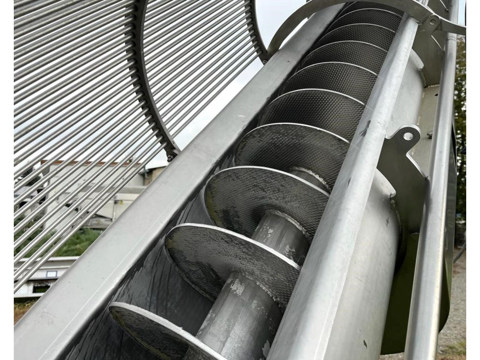 3X Technology defrosting screw with outfeed, screw diameter: 1450 mm, tier: 1010 mm, screw length: 6000 mm, inside dimensions: 6000 mm x 1450 mm x 700 mm, elevating screw diameter: 350 mm, tier: 120 mm, elevating height: 2300 mm, Alfa Laval heat exchanger, type: M6 MFG, total dimensions: 10300 mm x 2100 mm x 3150 mm.