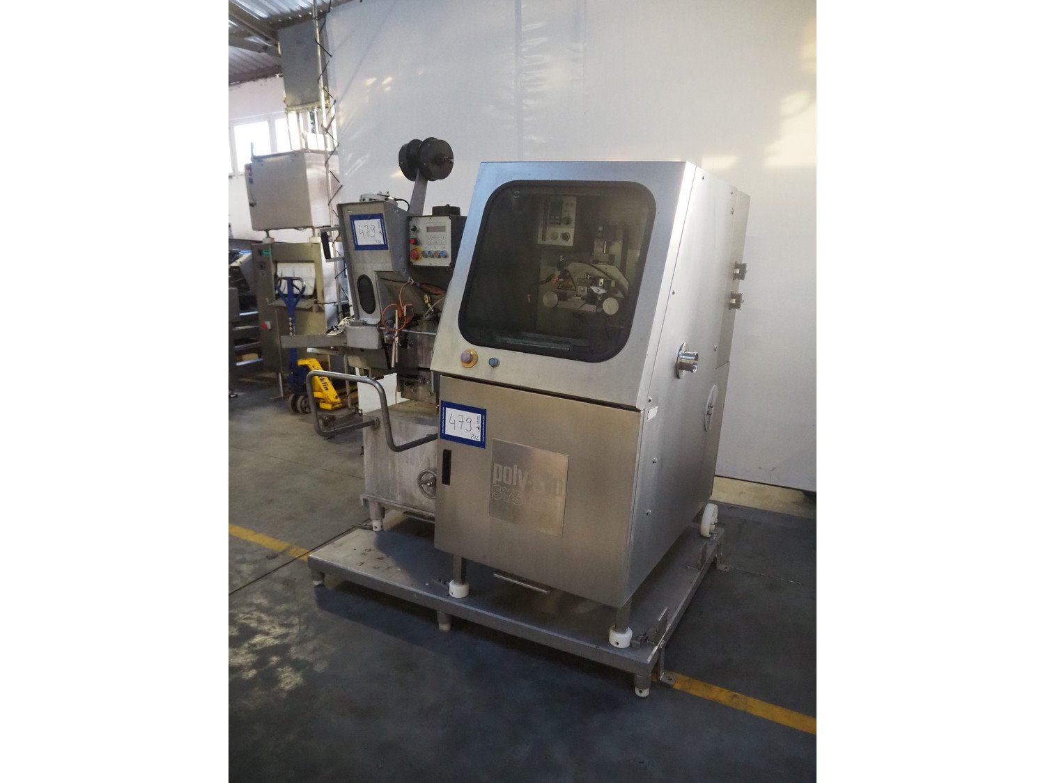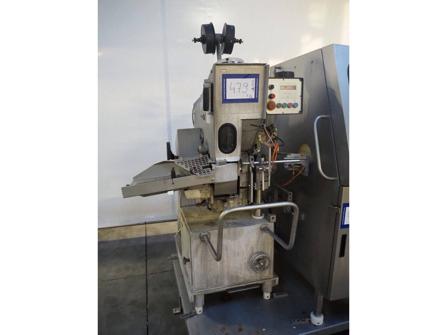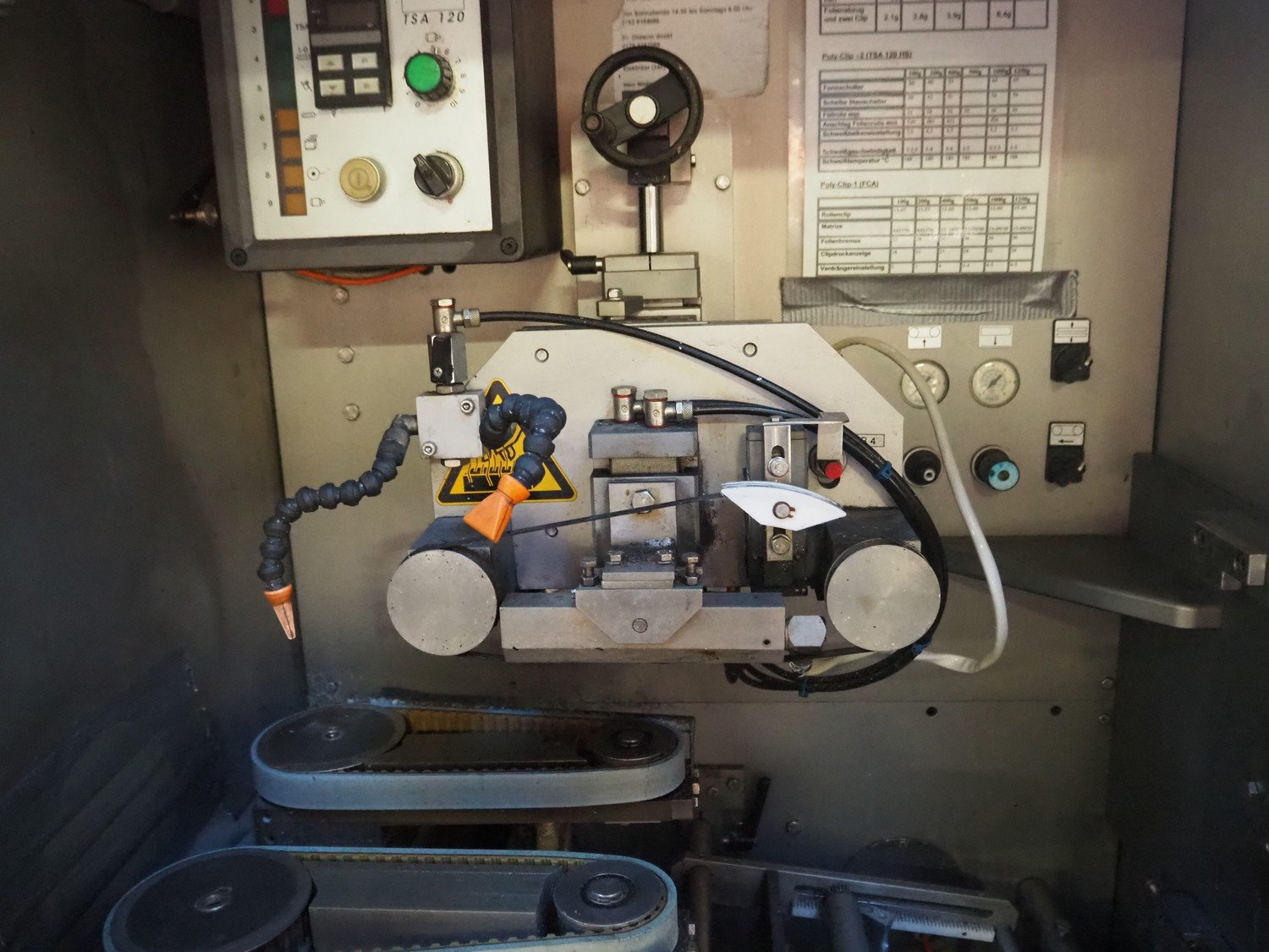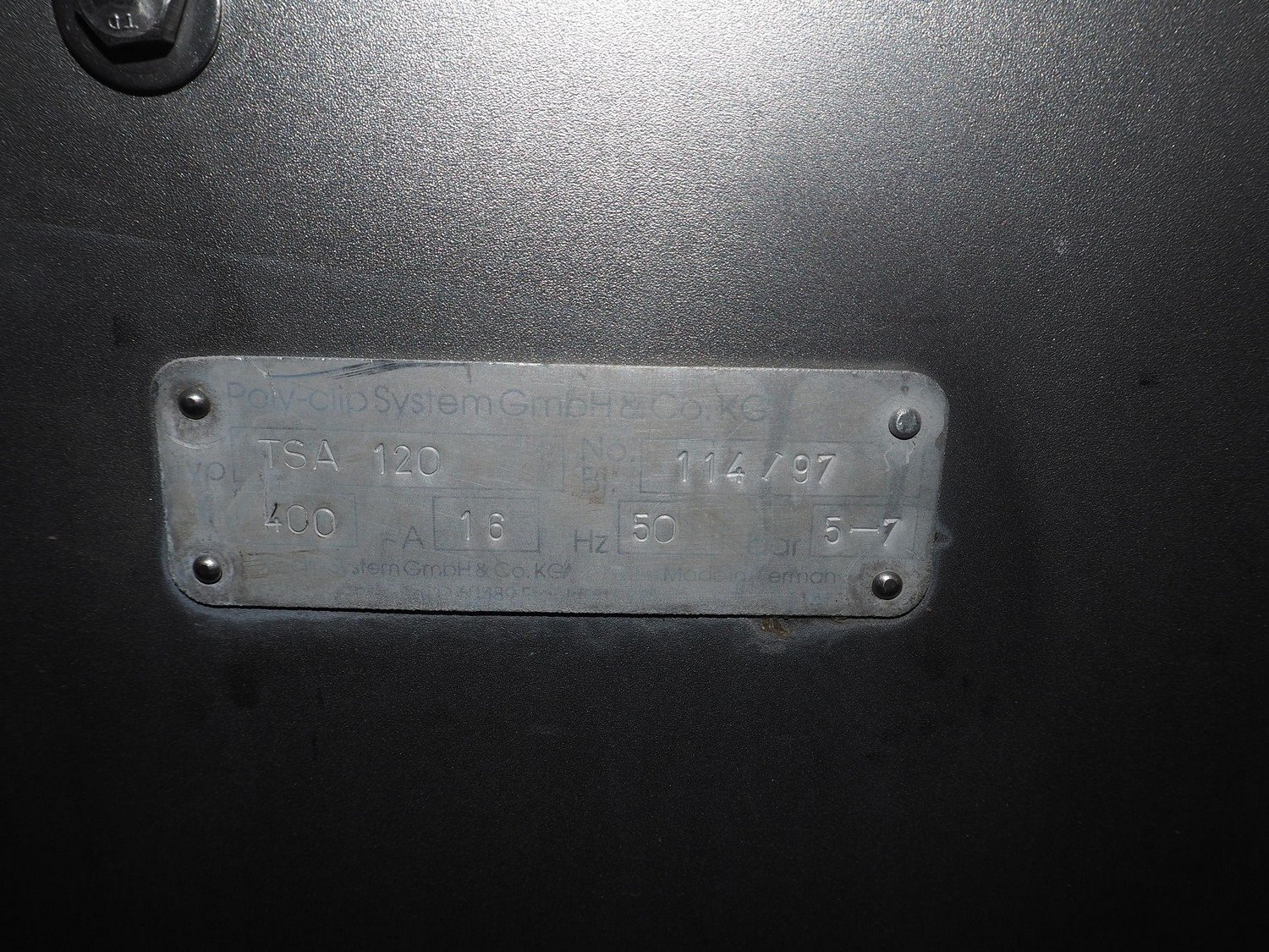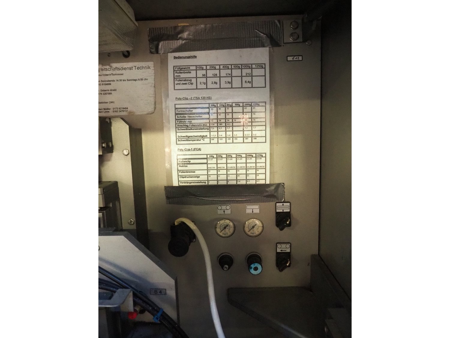 Poly-clip System GmbH Co. KG horizontal sealing and clipping machine, sealer type, type: TSA 120, seal length: 160 mm, clipper, type: FCA 3462, total dimensions: 1950 mm x 1450 mm x 1900 mm.
