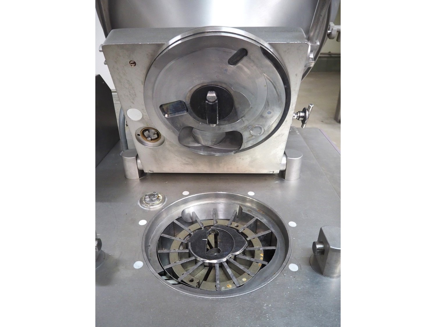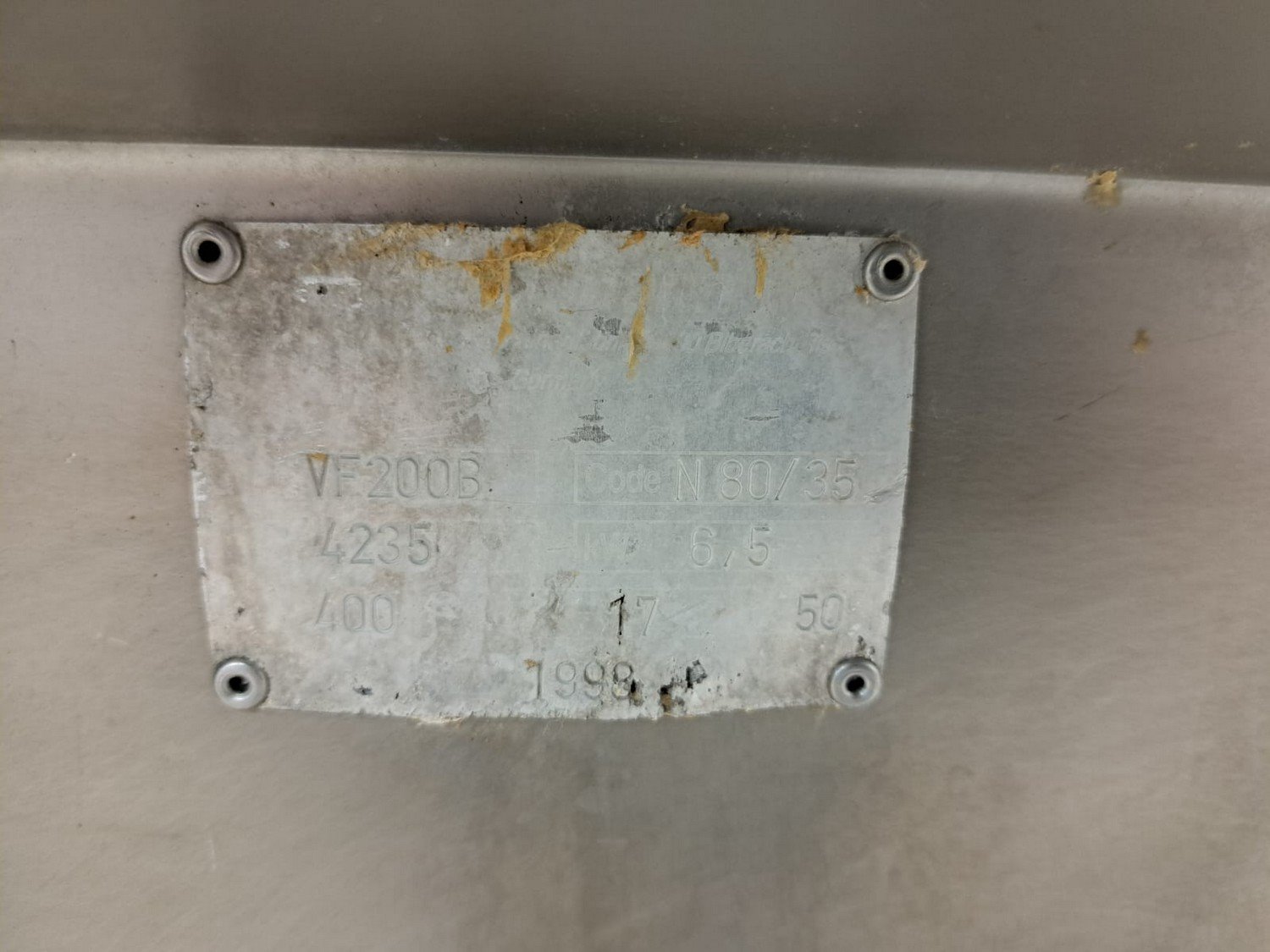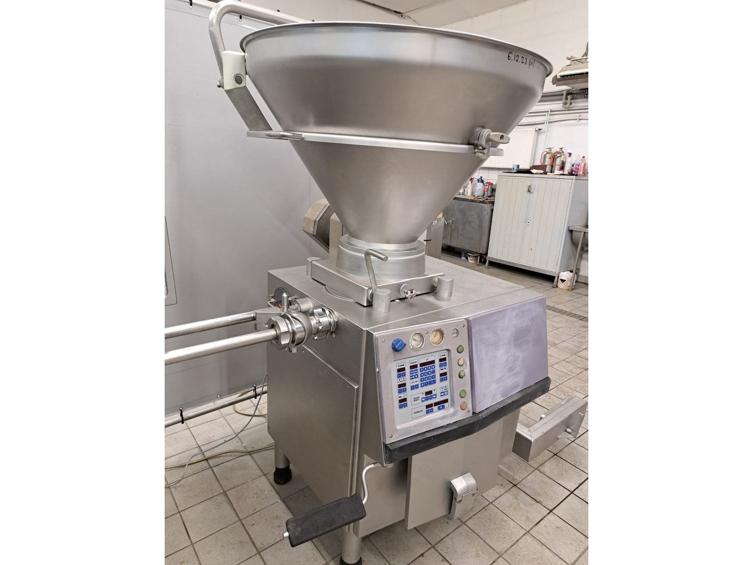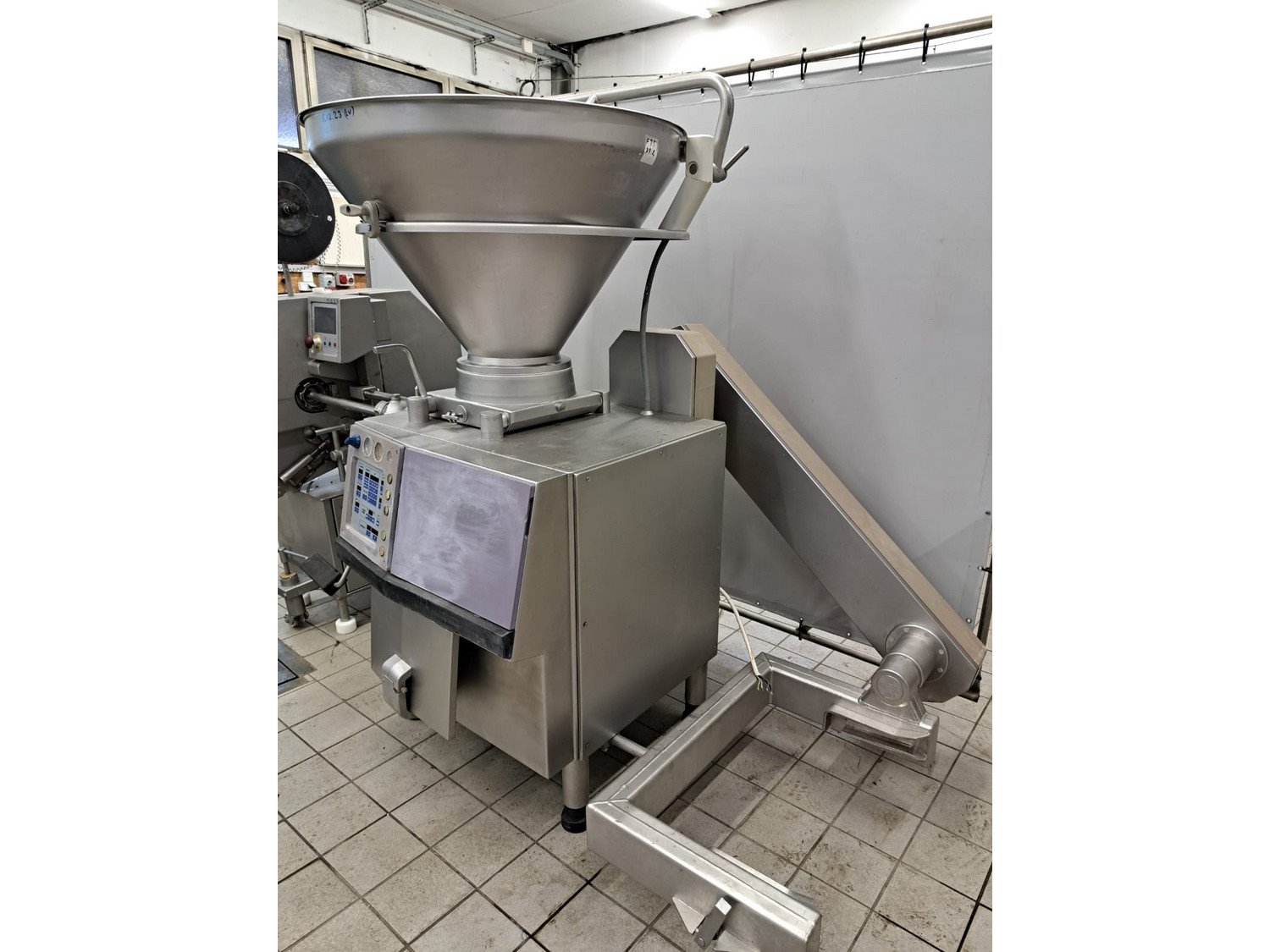 Handtmann vacuum filling machine with lifter for 200 liter meat bins, type: VF200B, number: 4235, year of construction: 1998, 400 V, 50 Hz, 17 A, 6.5 kW, with Becker vacuum pump, capacity: 16/19 m³ per hour, dimensions: 1900 mm x 1330 mm x 2200 mm.