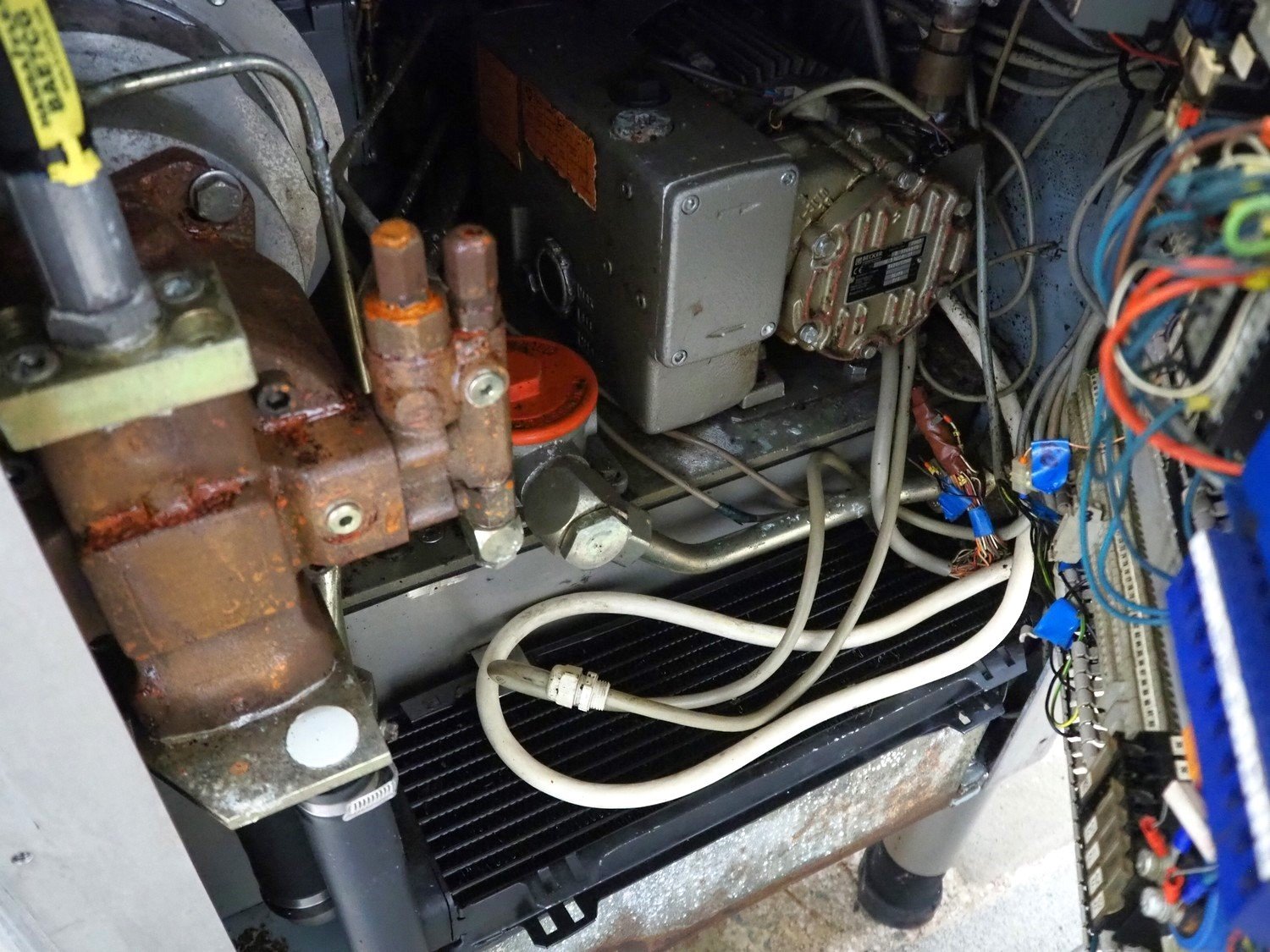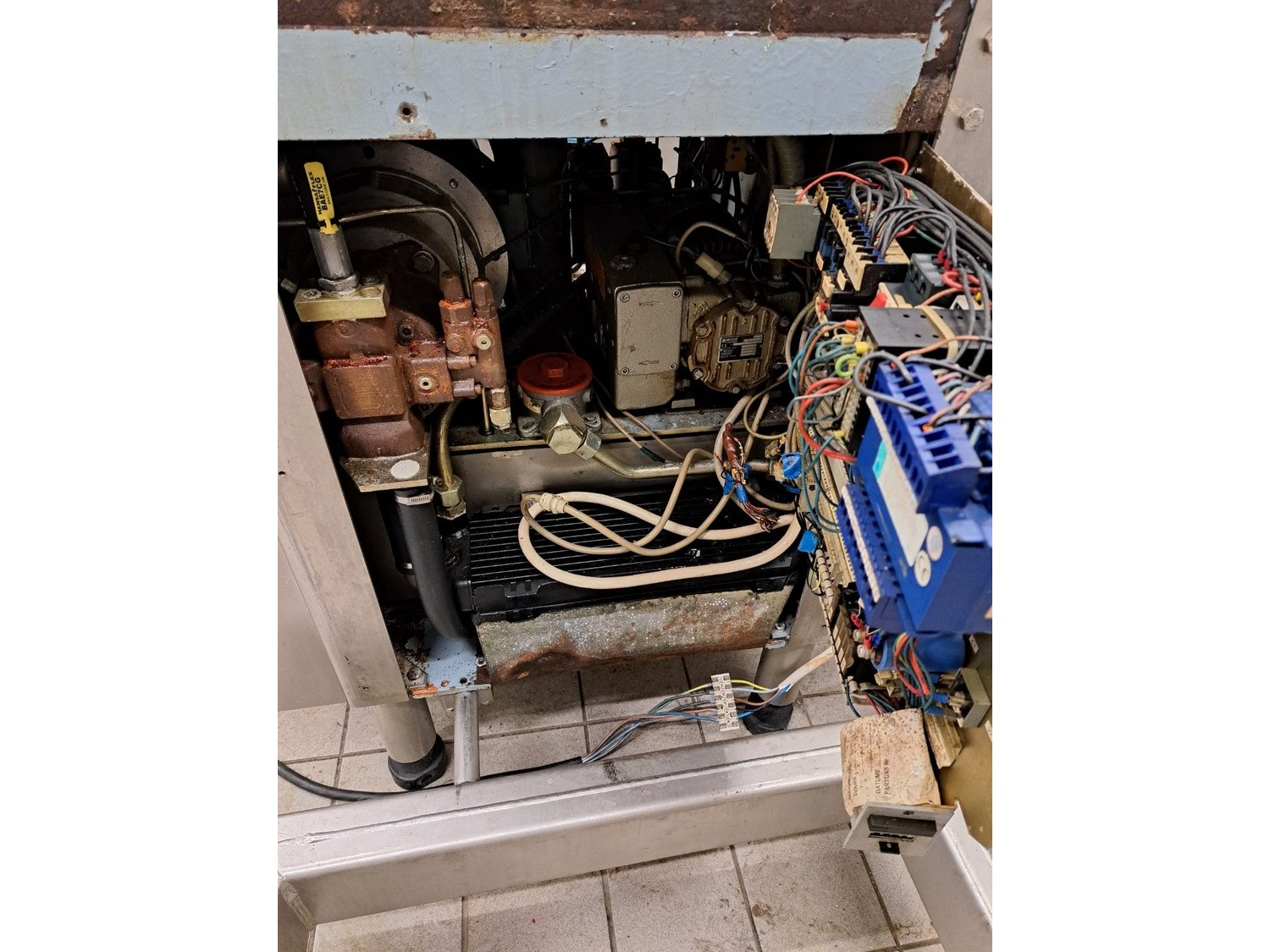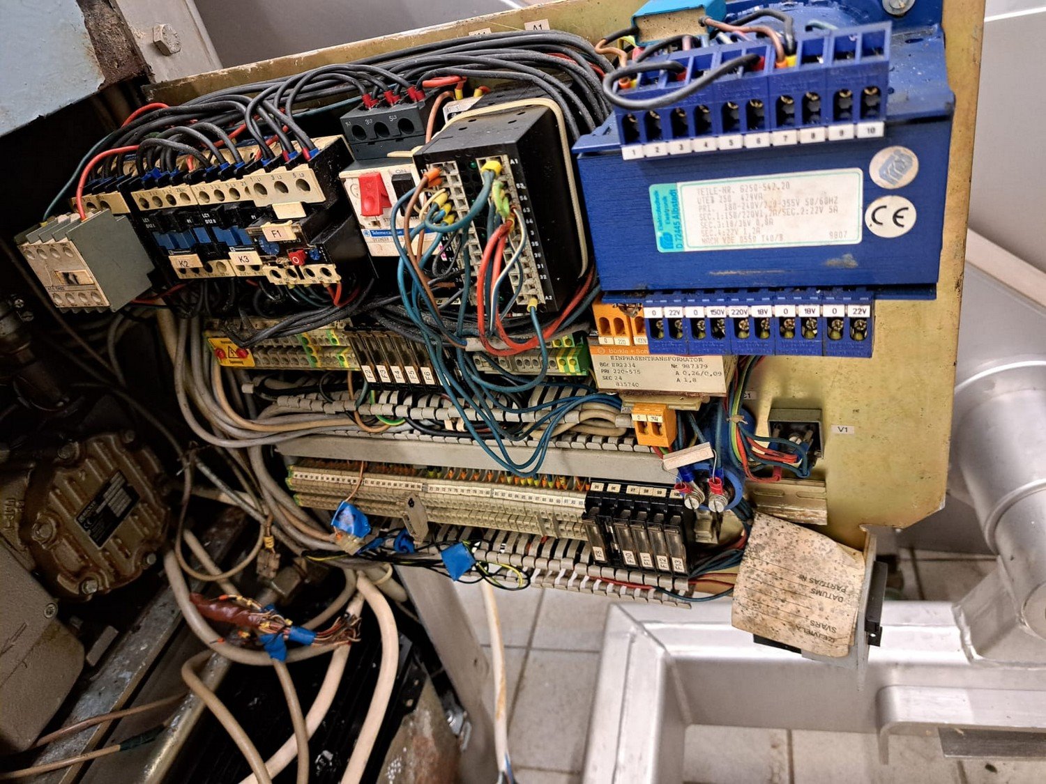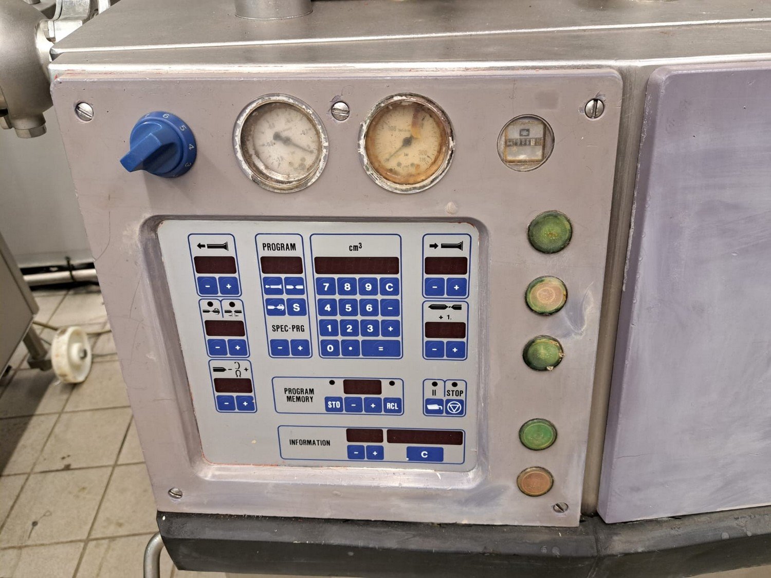 Handtmann vacuum filling machine with lifter for 200 liter meat bins, type: VF200B, number: 4235, year of construction: 1998, 400 V, 50 Hz, 17 A, 6.5 kW, with Becker vacuum pump, capacity: 16/19 m³ per hour, dimensions: 1900 mm x 1330 mm x 2200 mm.
