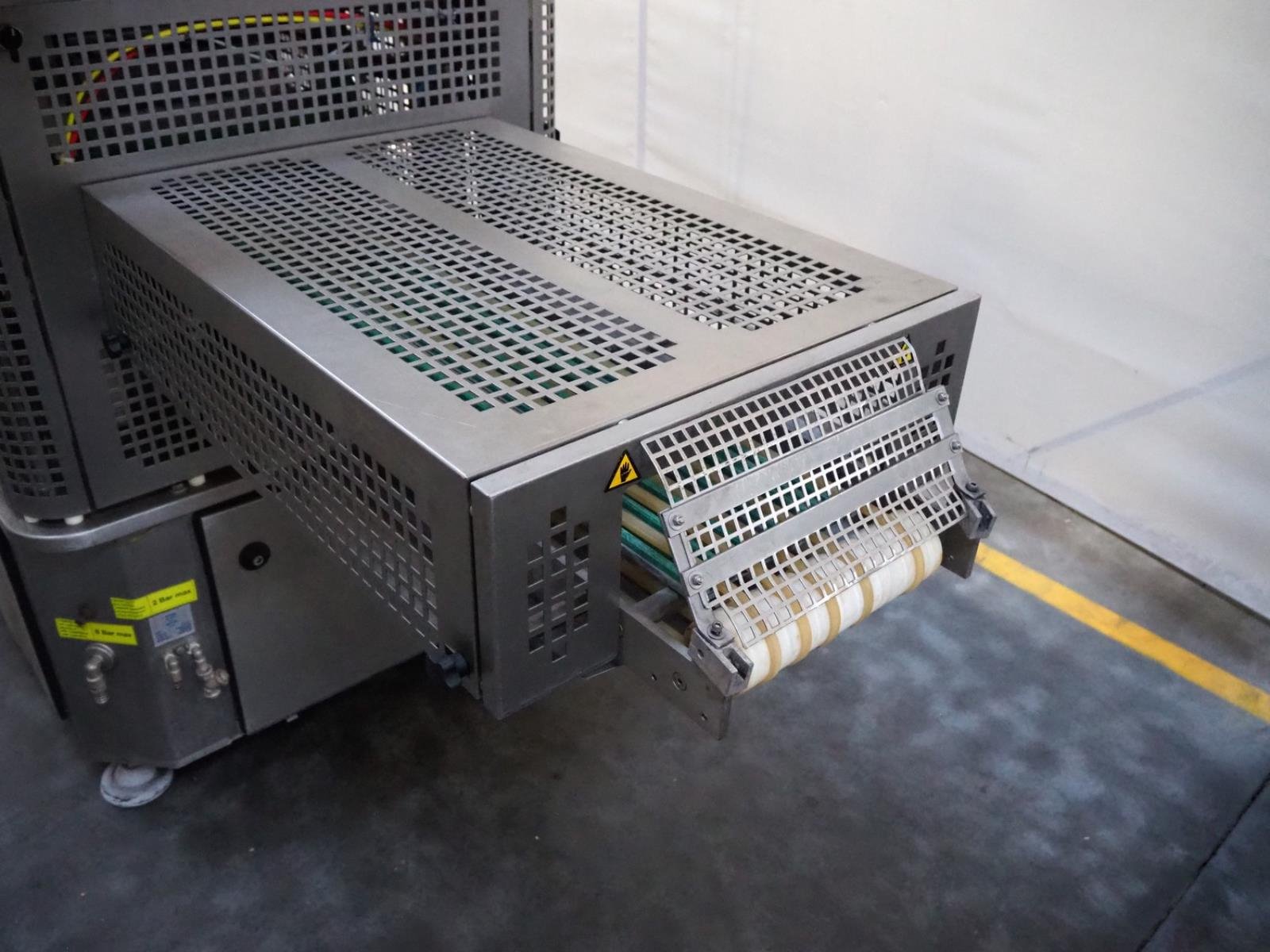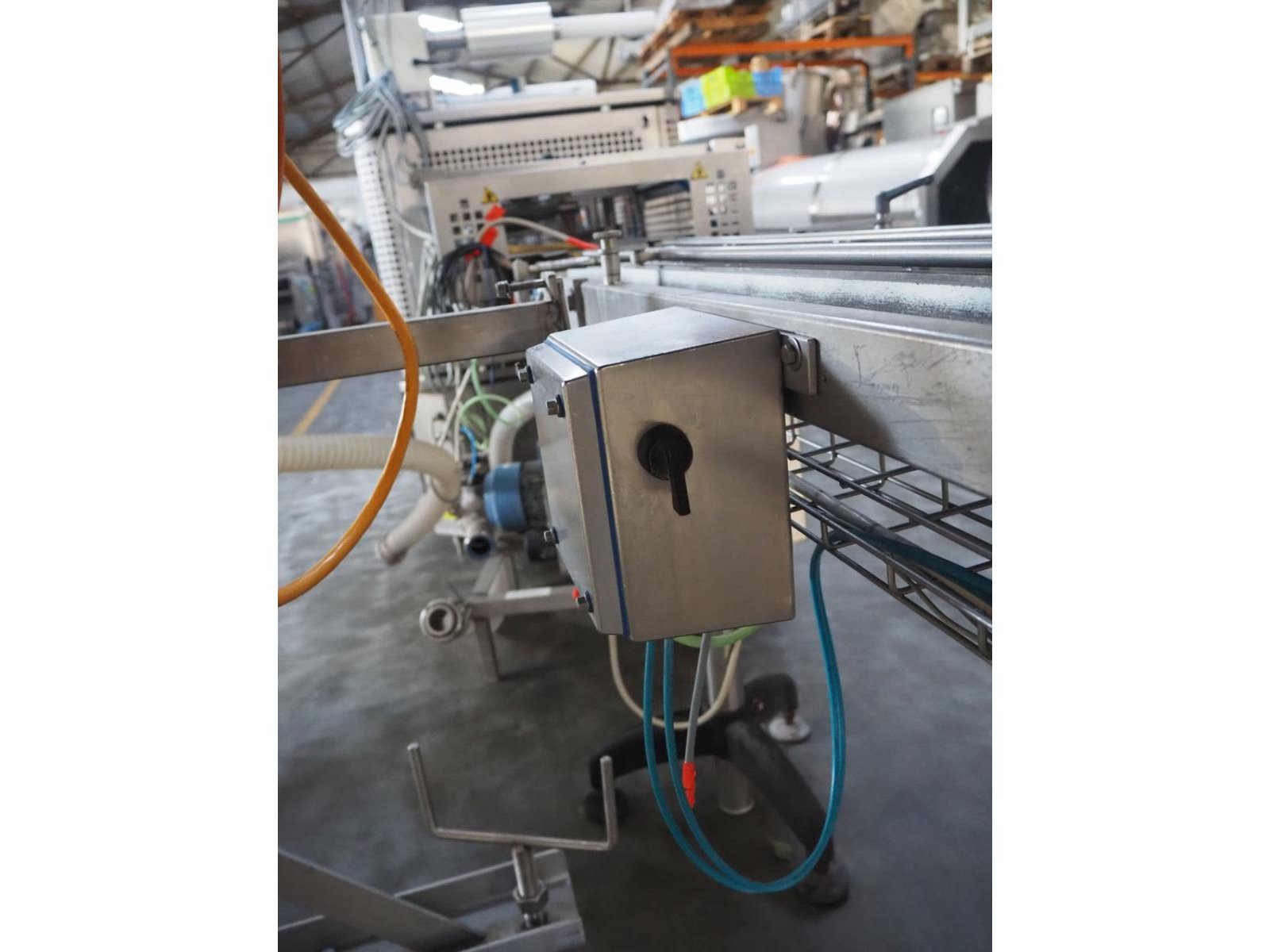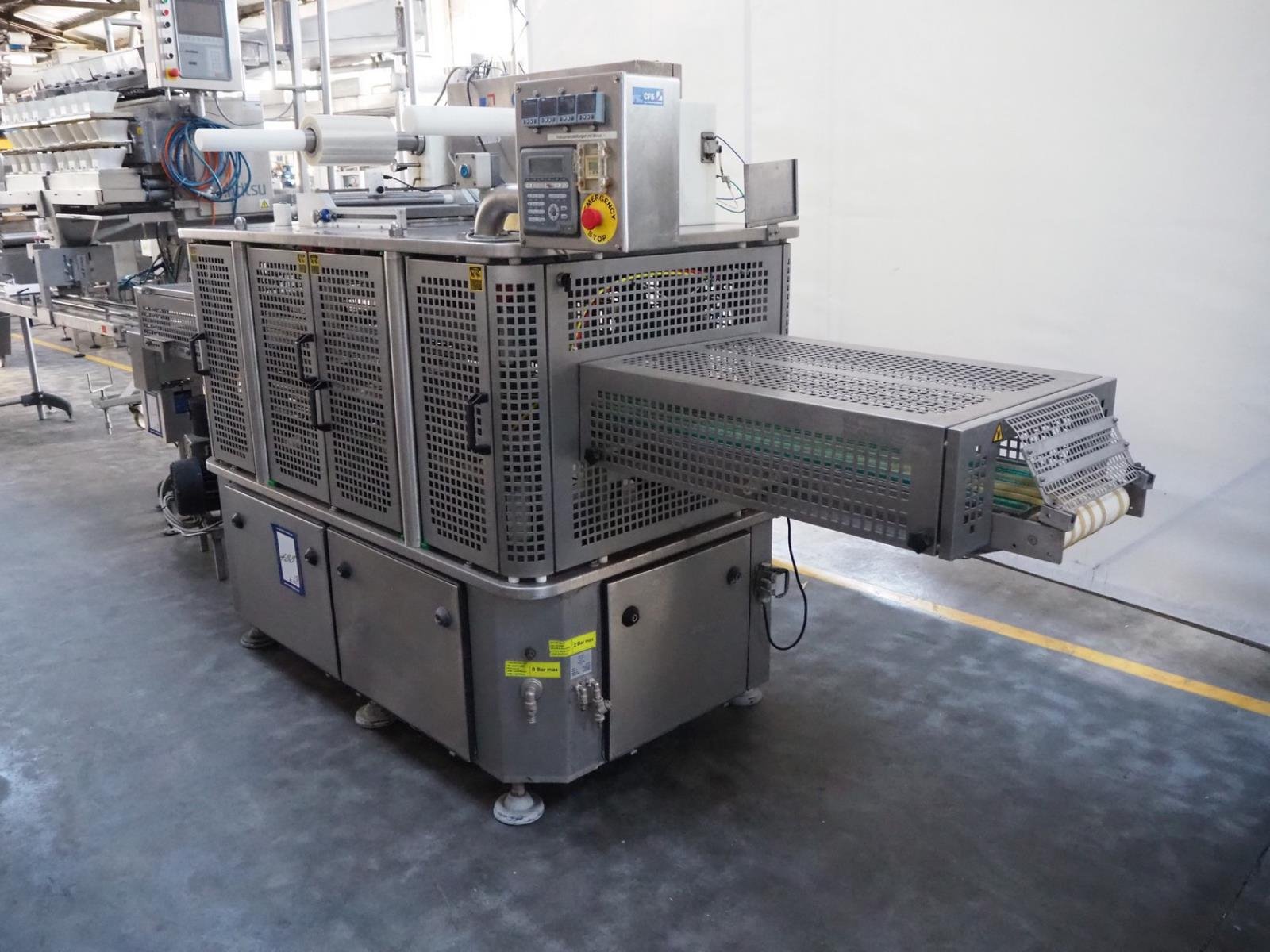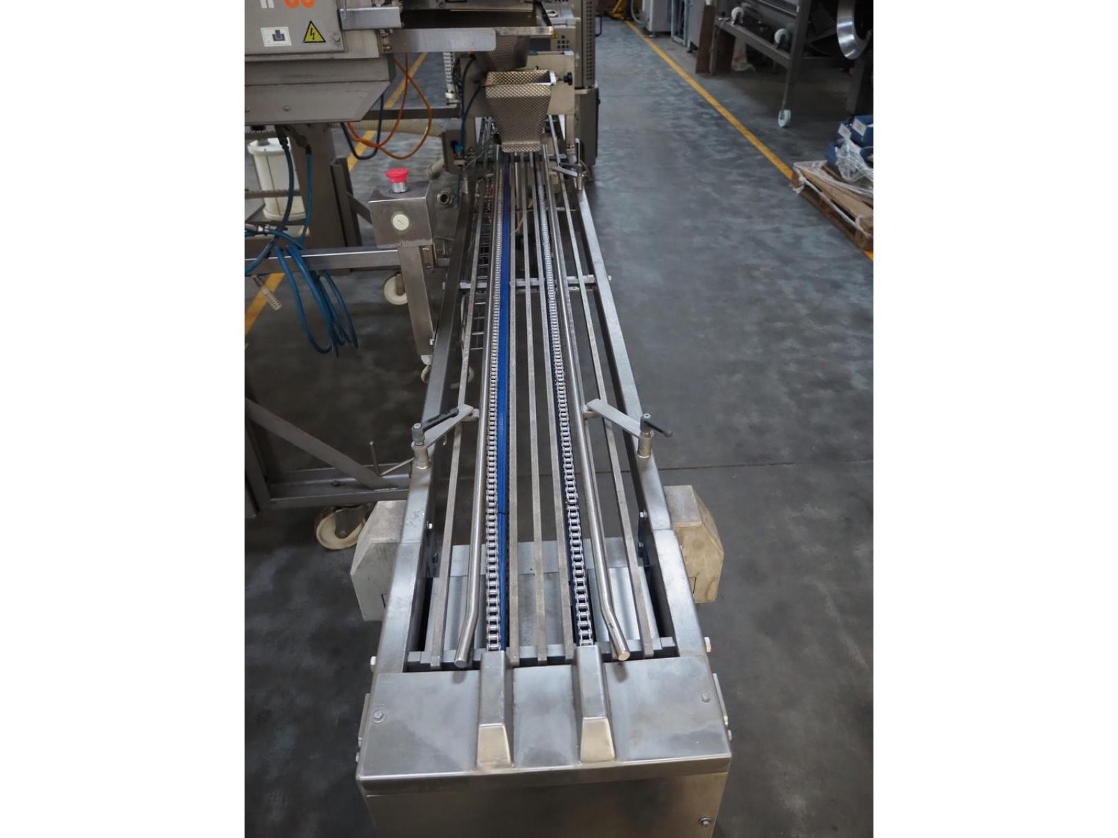 Anritsu/CFS mobile weighing and tray sealing line, consisting of: Anritsu 8 heads linear weigher with platform, type: KE7408AW, serial number: 460035067, year of construction: 2006, 200-240 VAC, 50/60 Hz, d= 0.1 g, capacity: 1-1000 g, maximum speed: 40 pieces per minute, s/s gutter, gutter width: 85 mm, total dimensions linear weigher: 2280 mm x 1880 mm x 2550 mm. Infeed belt, s/s frame, chain belt with dividers, distance between dividers: 295 mm, dividers height: 15 mm, belt width: 130 mm, total dimensions infeed belt: 3500 mm x 550 mm x 1210 mm. CFS traysealer, type: STAR2S, number: 695-113C, year of construction: 2005, 400 V, 3 Ph, 50 Hz, 14.5 A, 10 kW, weight: 1500 kg, infeed belt width: 150 mm, film width: 260 mm, dimensions dyes: (3x) 145 mm x 110 mm, total dimensions traysealer: 3800 mm x 1100 mm x 1850 mm. Vacuum pump Pallet with parts.