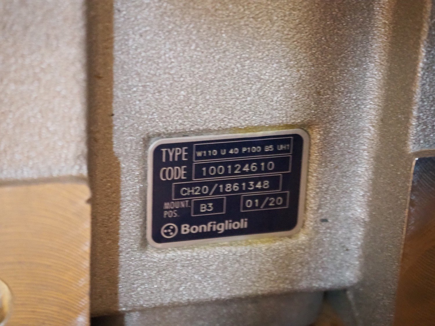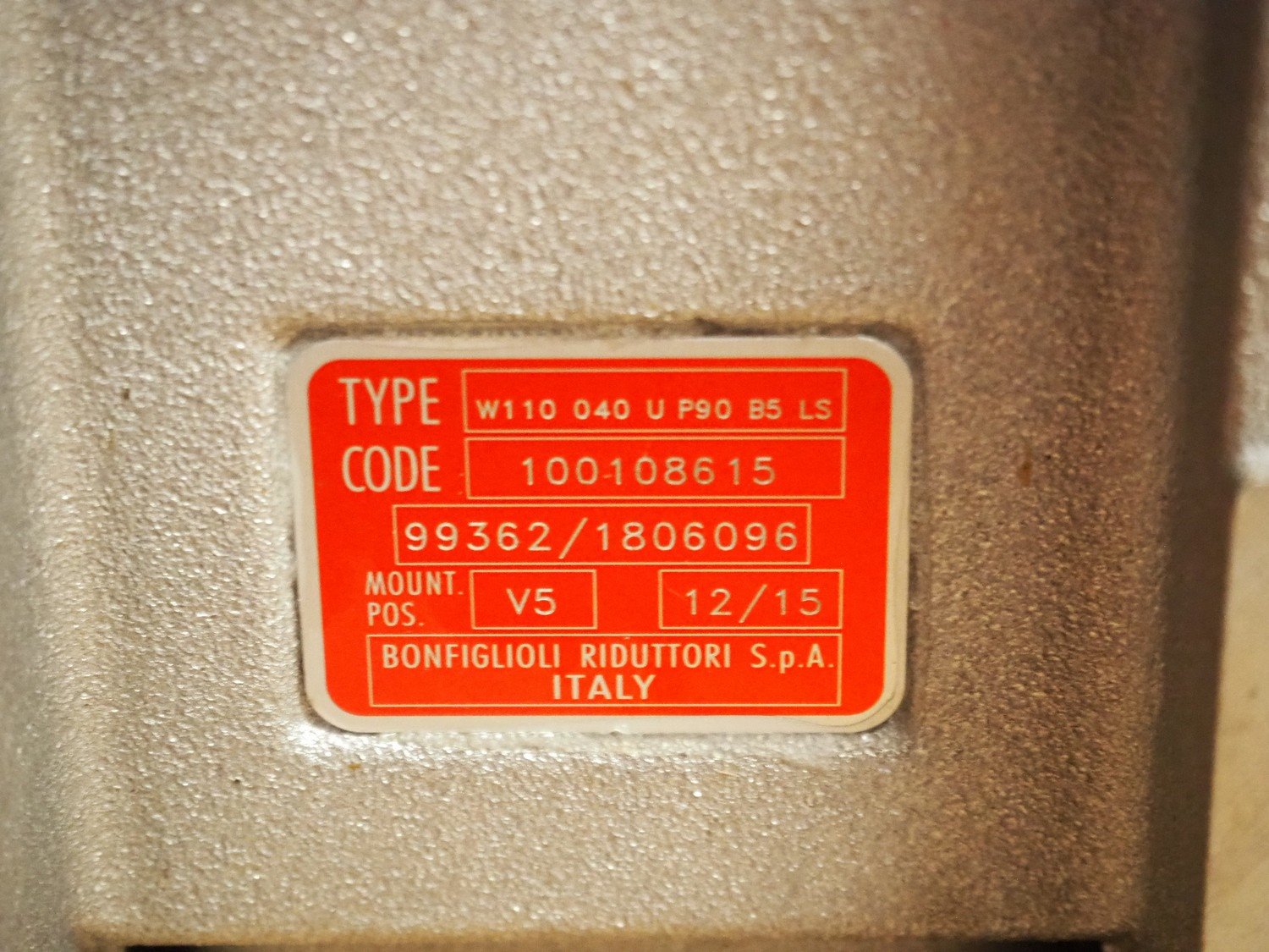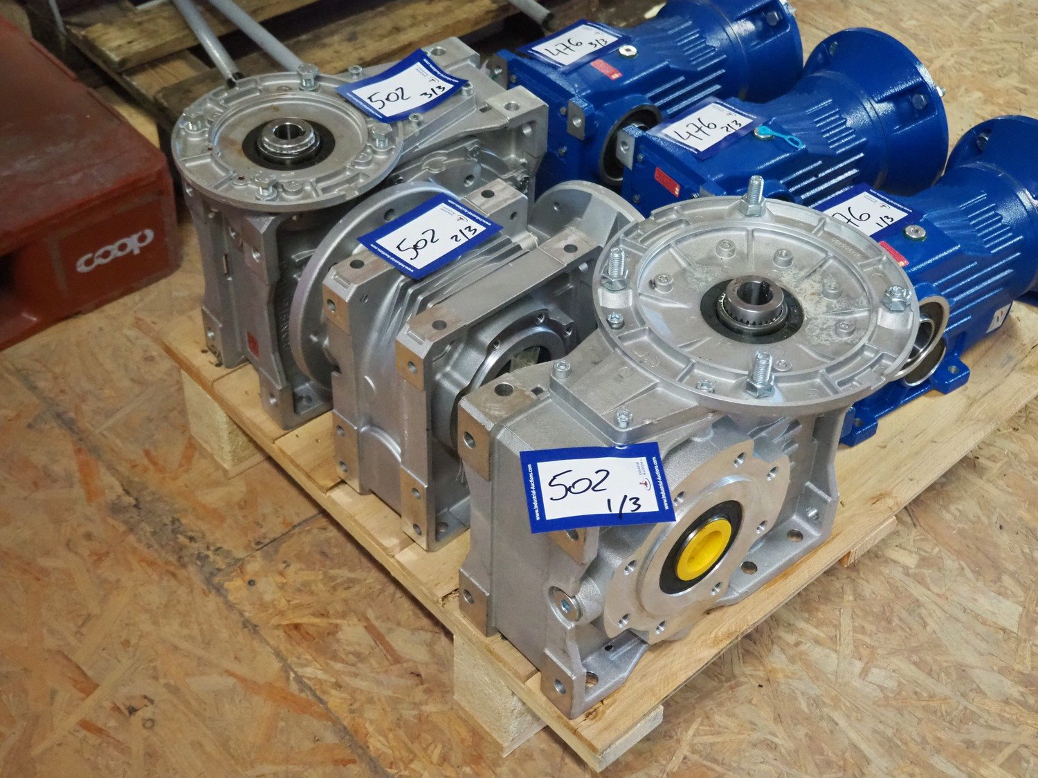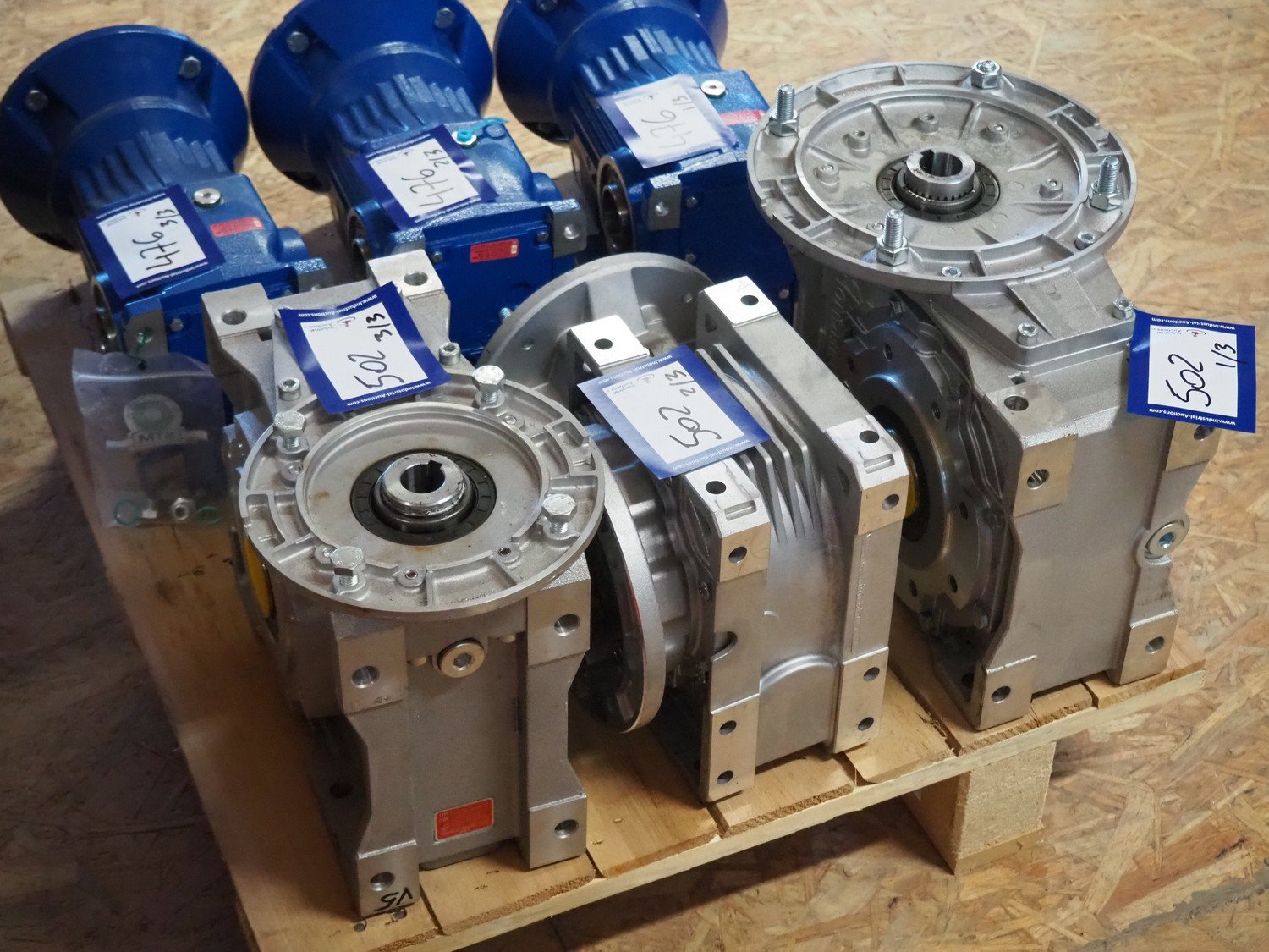 2 Bonfiglioli gears, type: W110 U 40 P100 B5 UH1, and W110 040 U P90 B5 LS, dimensions: (2x) 360 mm x 250 mm x 300 mm 1 UIKER gear, type: WR86 UFC2 60 P90 B5, dimensions: 300 mm x 200 mm x 250 mm.