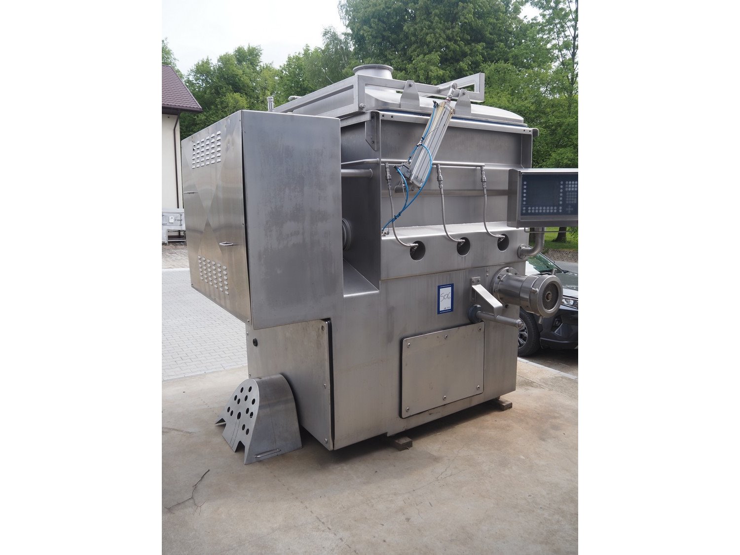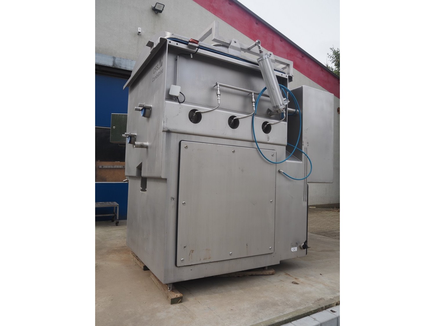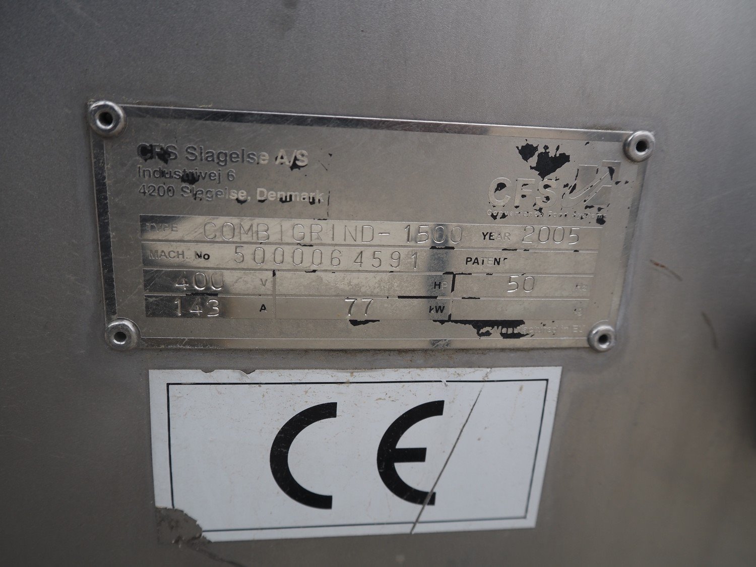 CFS Slagelse A/S double shaft mixer-grinder with nitrogen injection, type: Combigrind-1500, machine number: 5000064591, year of construction: 2005, 400 V, 50 Hz, 143 A, 77 kW, plate diameter: 200 mm, total dimensions: 2300 mm x 2050 mm x 2700 mm.