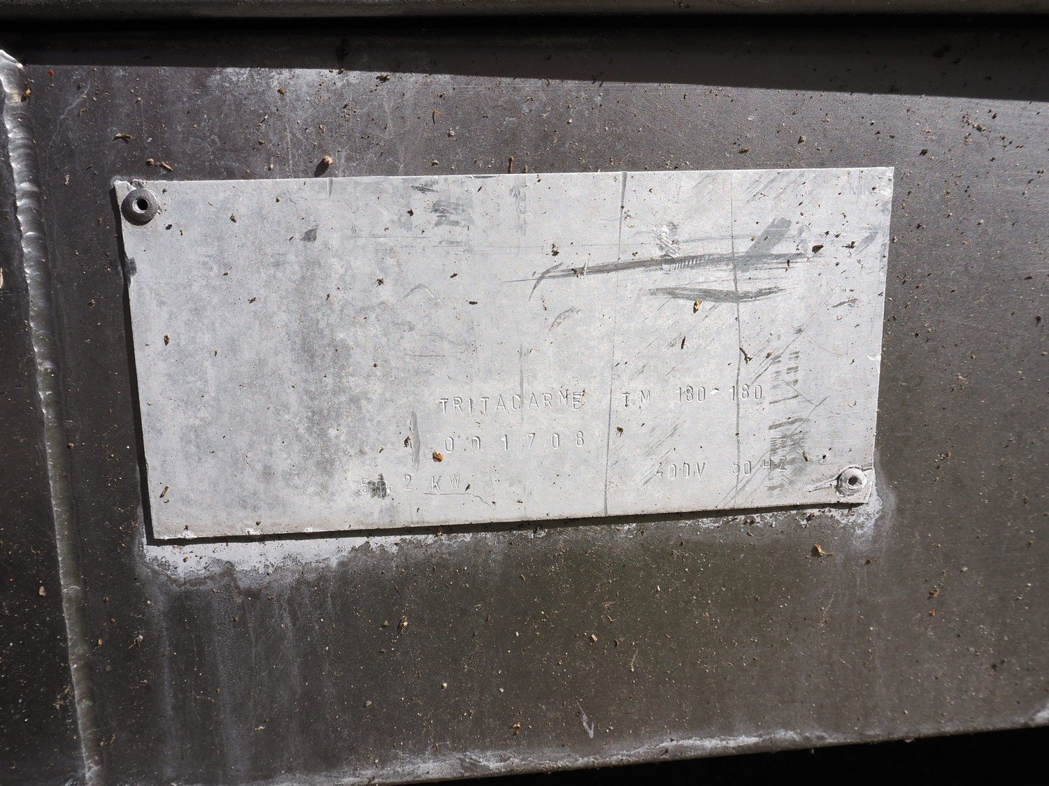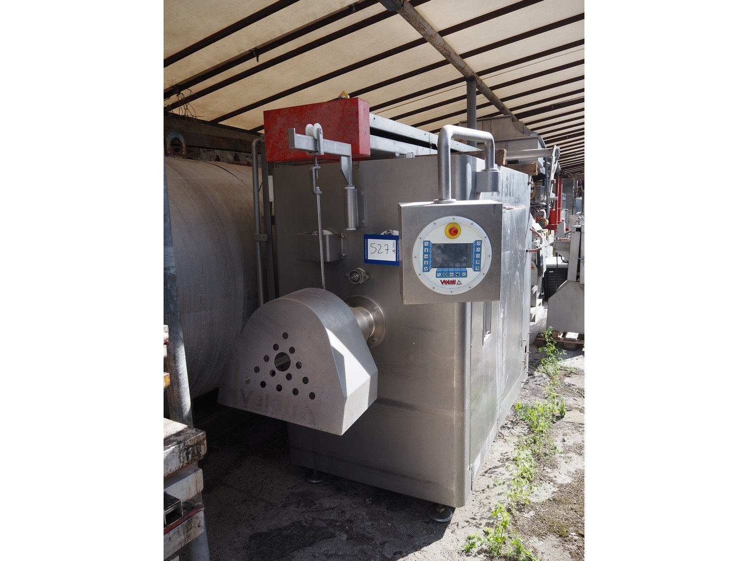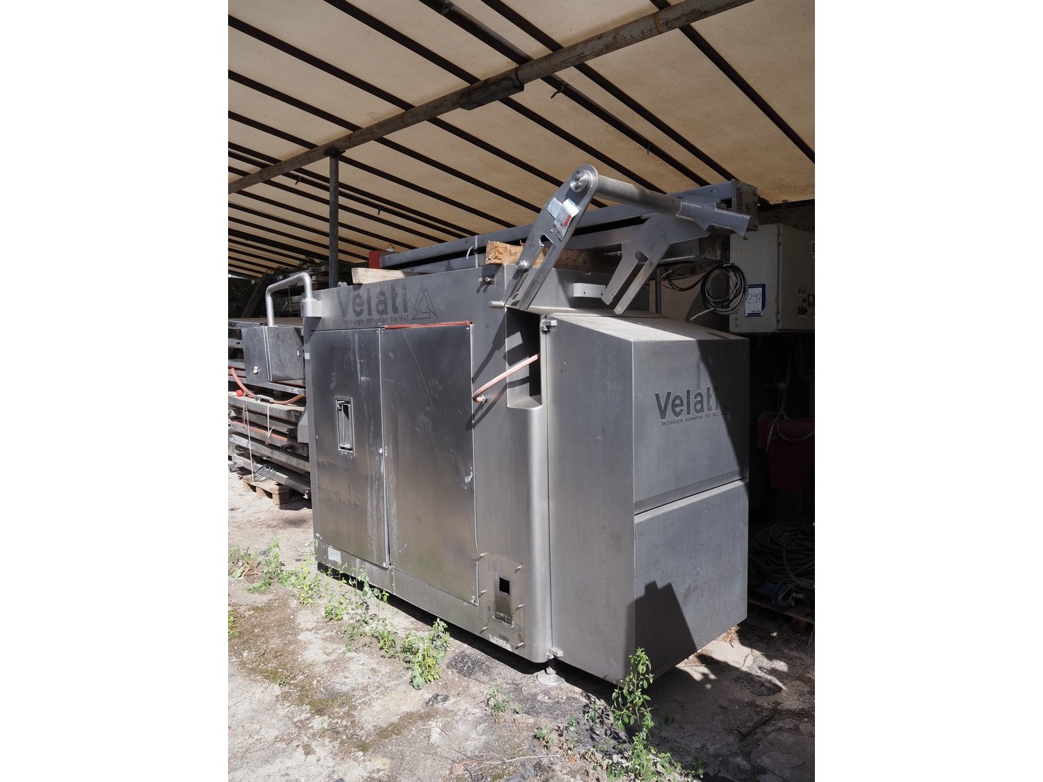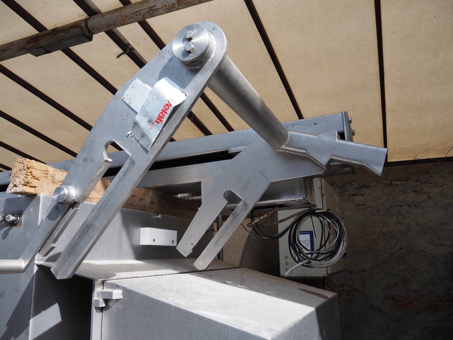 Velati paddle-mixer grinder with lifter for 200 liter meat bins, type: Tritacarne TM 180-180, serial number: 001708, 400 V, 50 Hz, diameter plate: 180 mm, lifting height lifter: 2200 mm, dimensions grinder: 3700 mm x 2000 mm x 2200 mm, dimensions lifter: 1400 mm x 400 mm x 2800 mm.