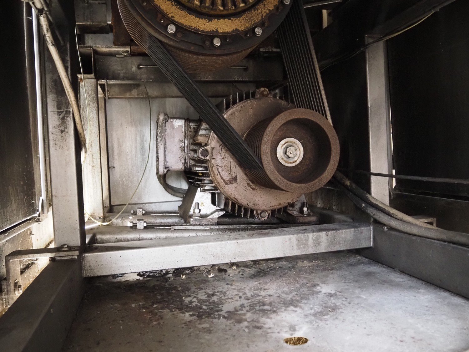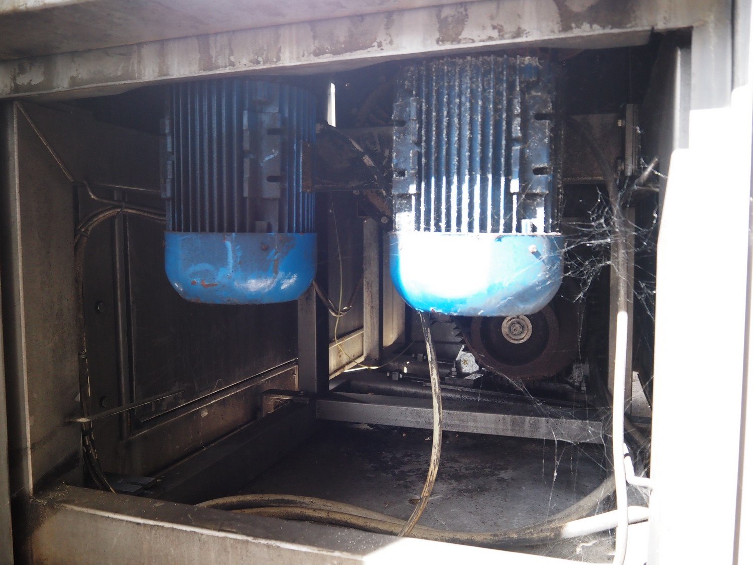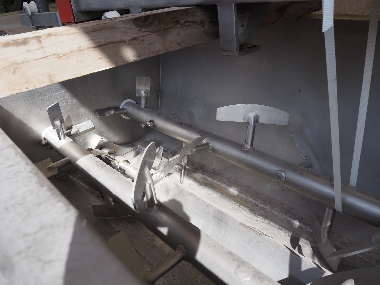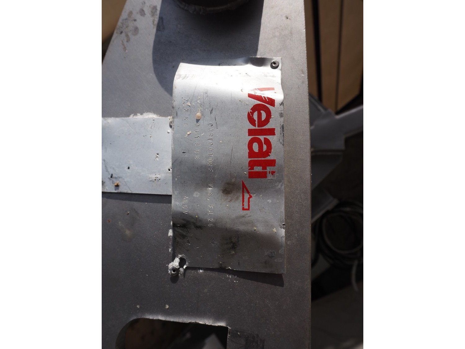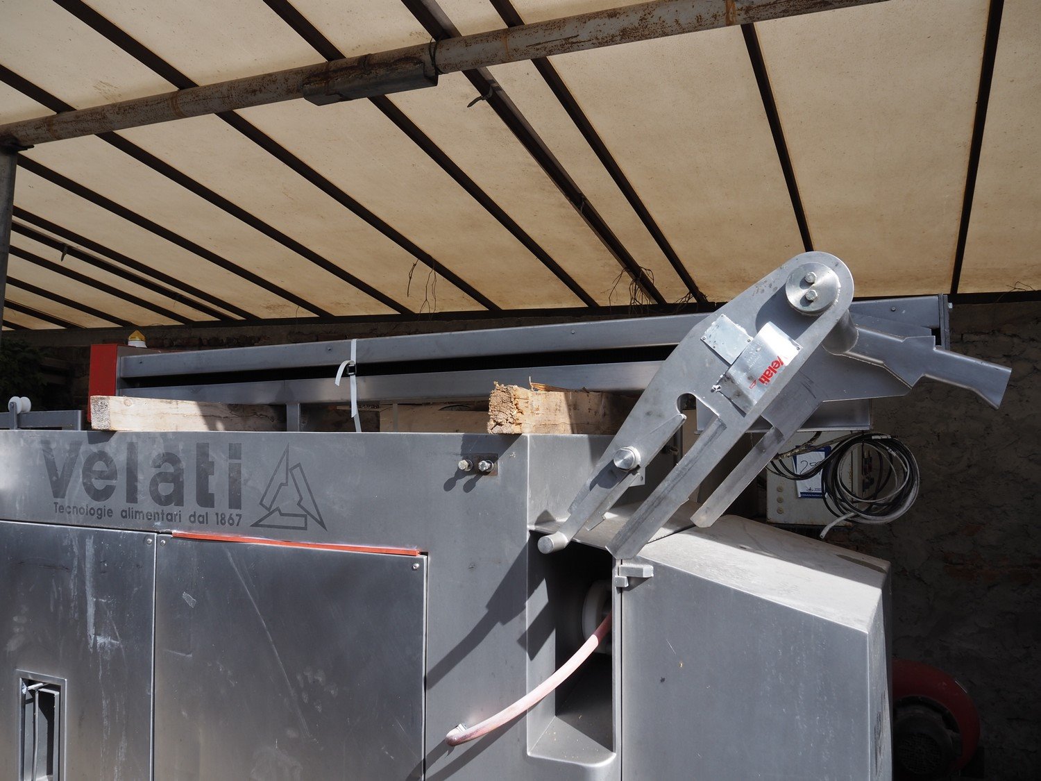 Velati paddle-mixer grinder with lifter for 200 liter meat bins, type: Tritacarne TM 180-180, serial number: 001708, 400 V, 50 Hz, diameter plate: 180 mm, lifting height lifter: 2200 mm, dimensions grinder: 3700 mm x 2000 mm x 2200 mm, dimensions lifter: 1400 mm x 400 mm x 2800 mm.