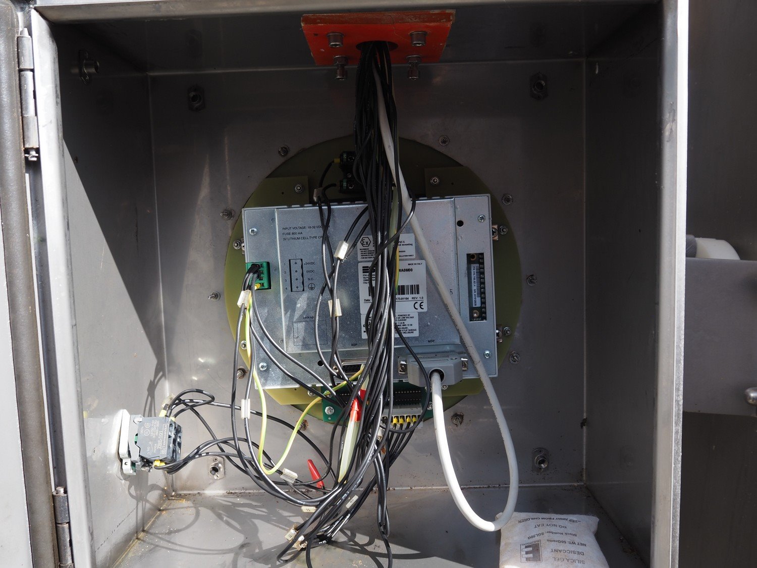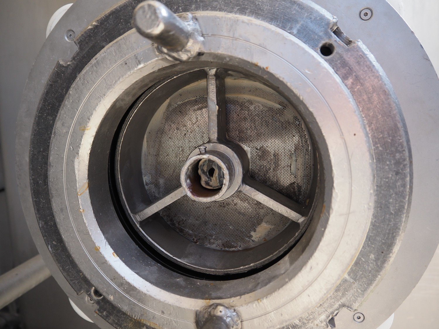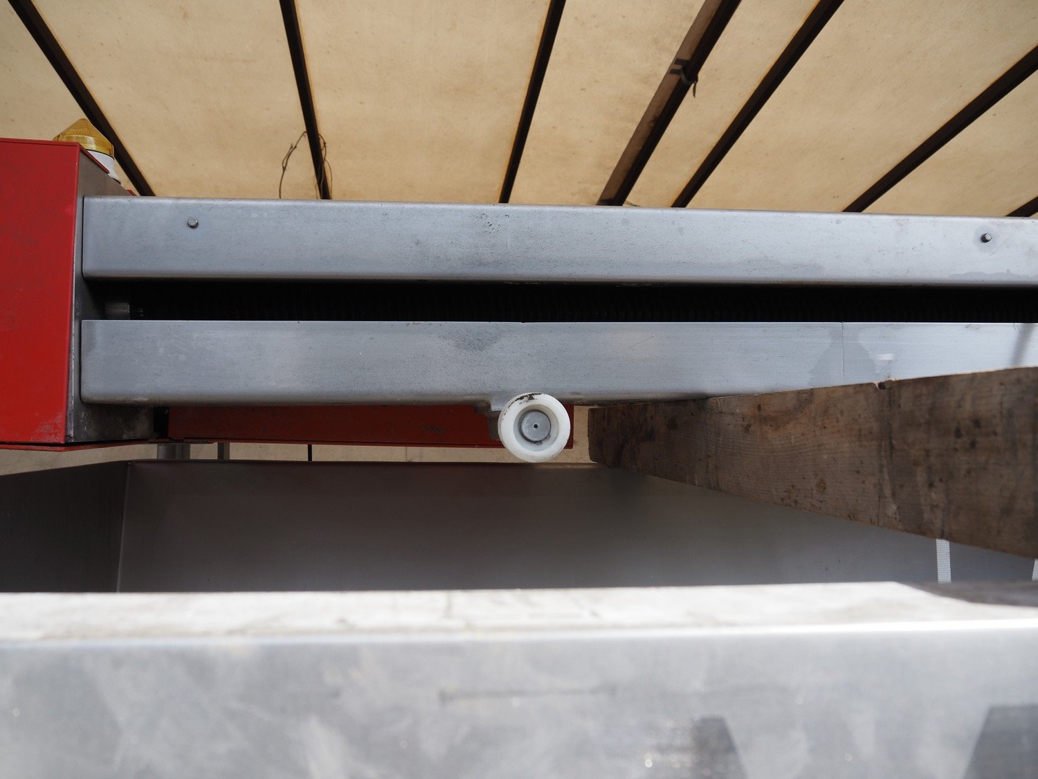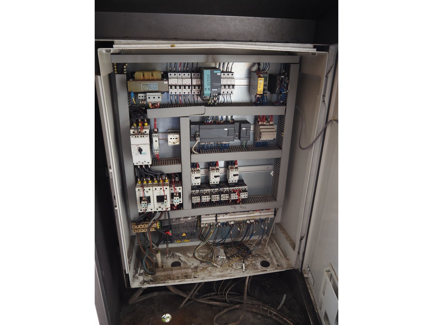 Velati paddle-mixer grinder with lifter for 200 liter meat bins, type: Tritacarne TM 180-180, serial number: 001708, 400 V, 50 Hz, diameter plate: 180 mm, lifting height lifter: 2200 mm, dimensions grinder: 3700 mm x 2000 mm x 2200 mm, dimensions lifter: 1400 mm x 400 mm x 2800 mm.
