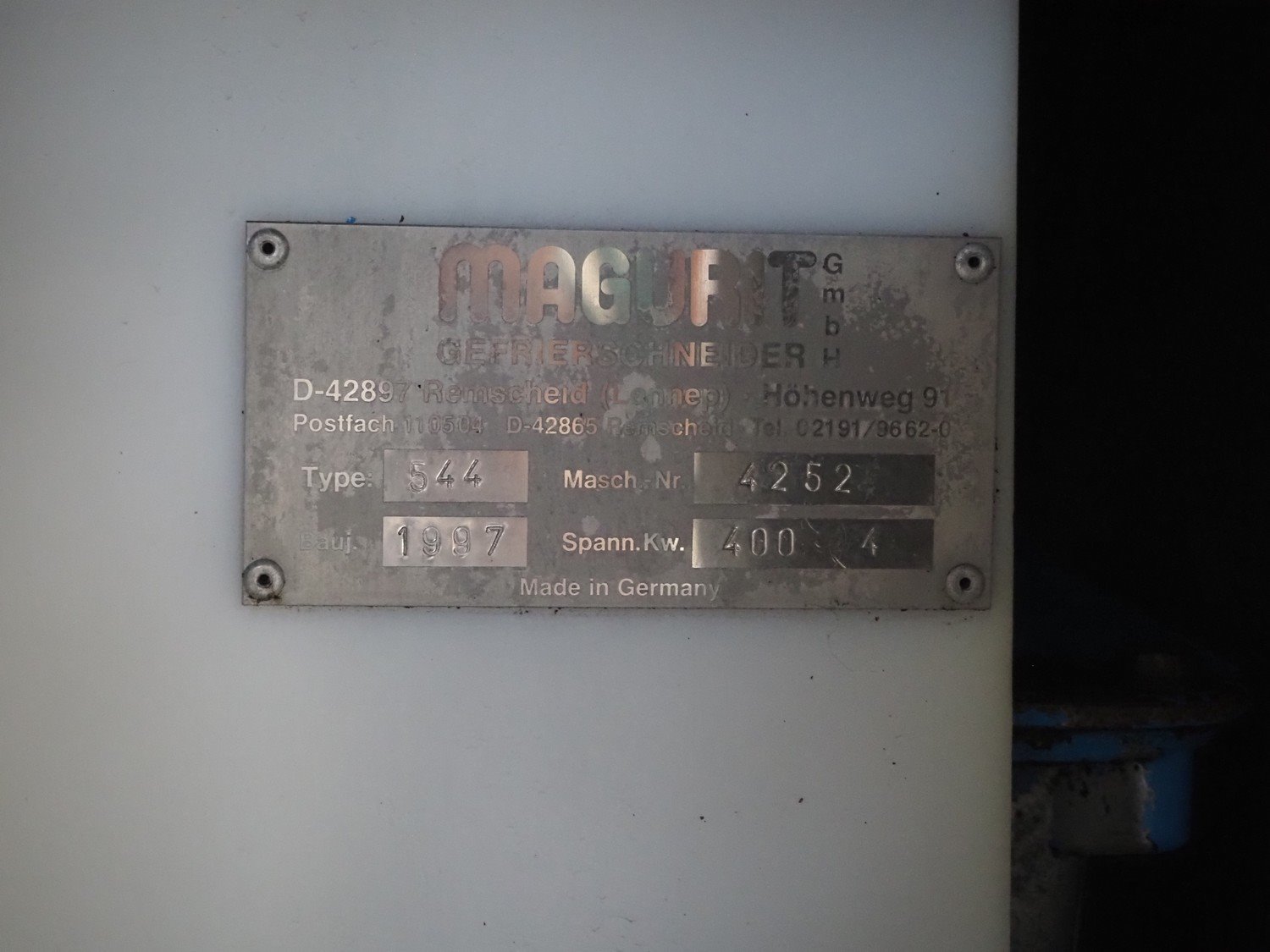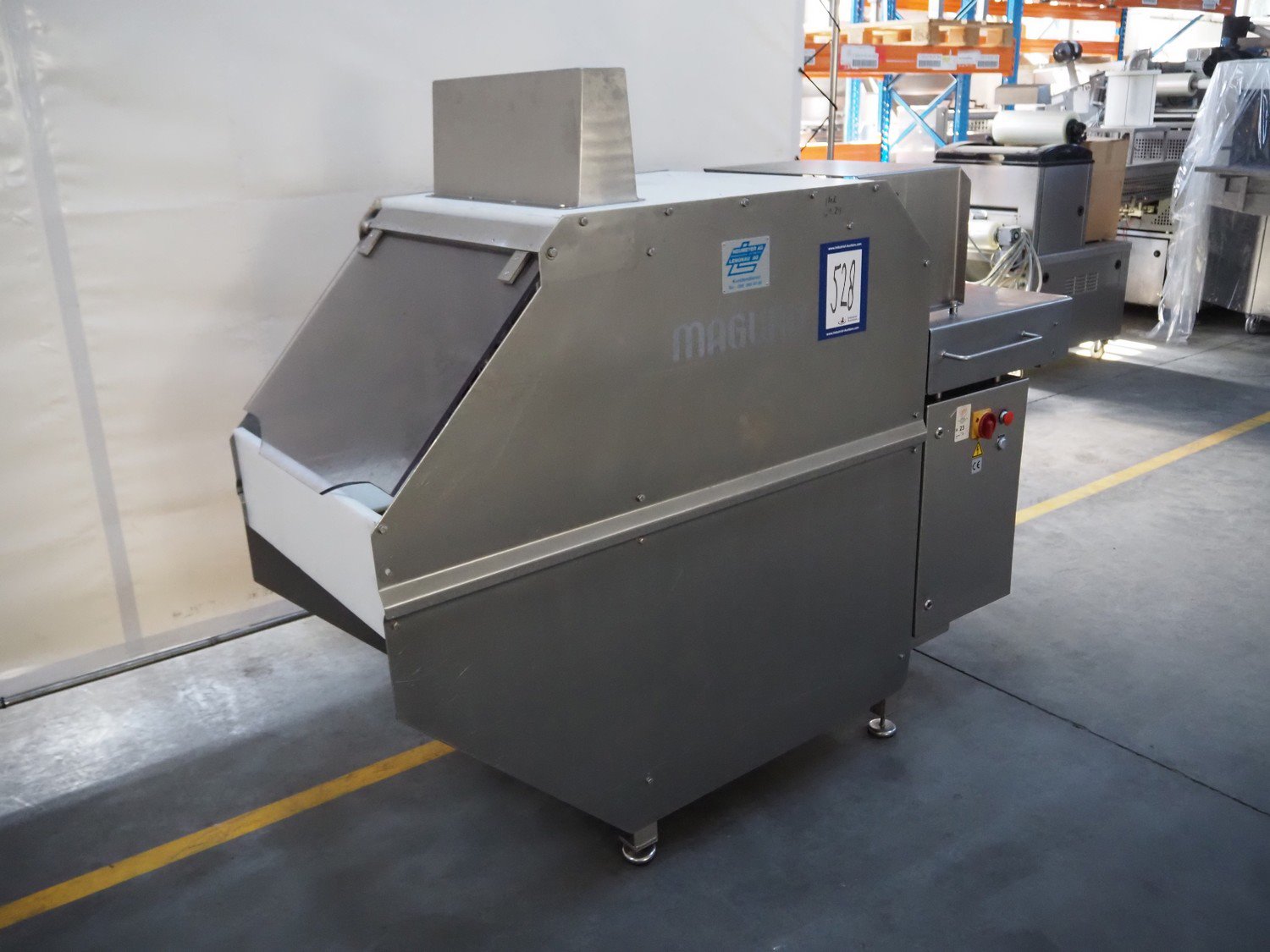 Magurit frozen block cutter, type: 544, serial number: 4252, year of construction: 1997, 400 V, 4 kW, working width: 520 mm, clearance: 480 mm x 315 mm, total dimensions: 1935 mm x 800 mm x 1600 mm.
