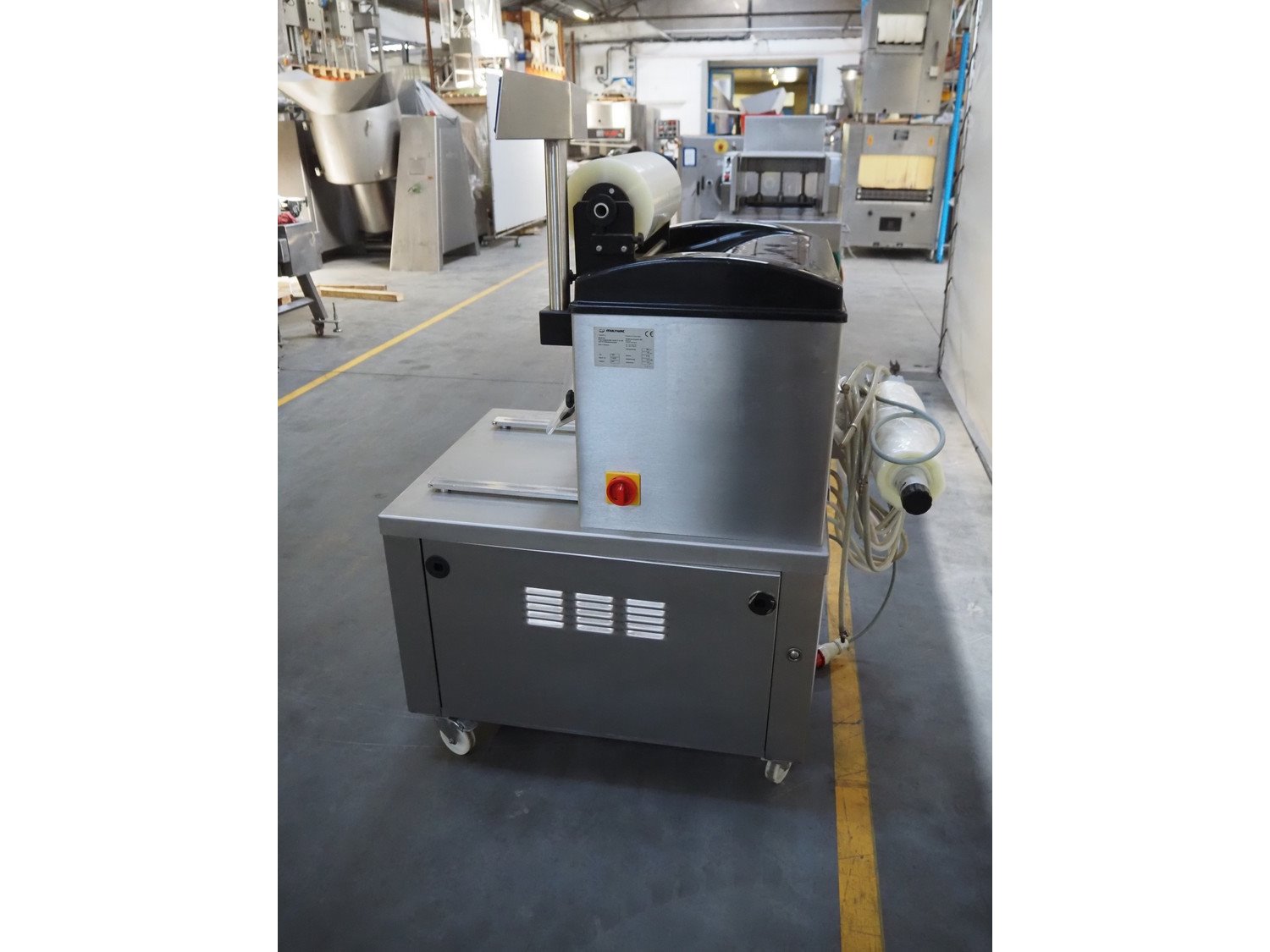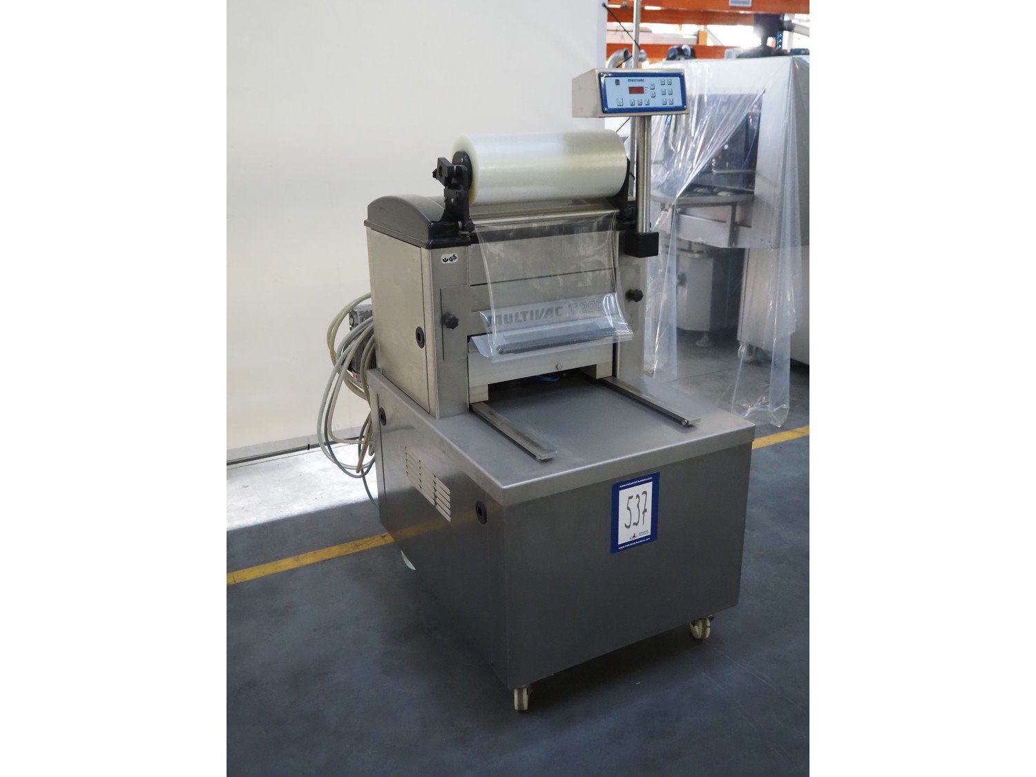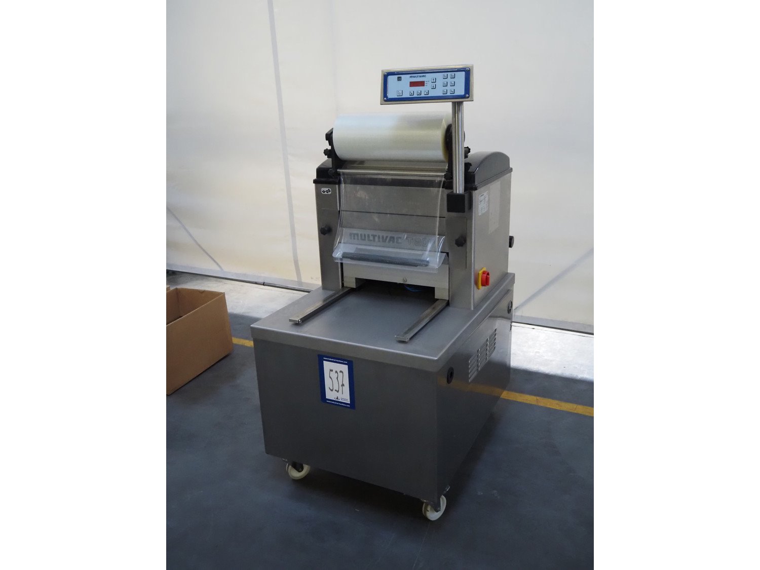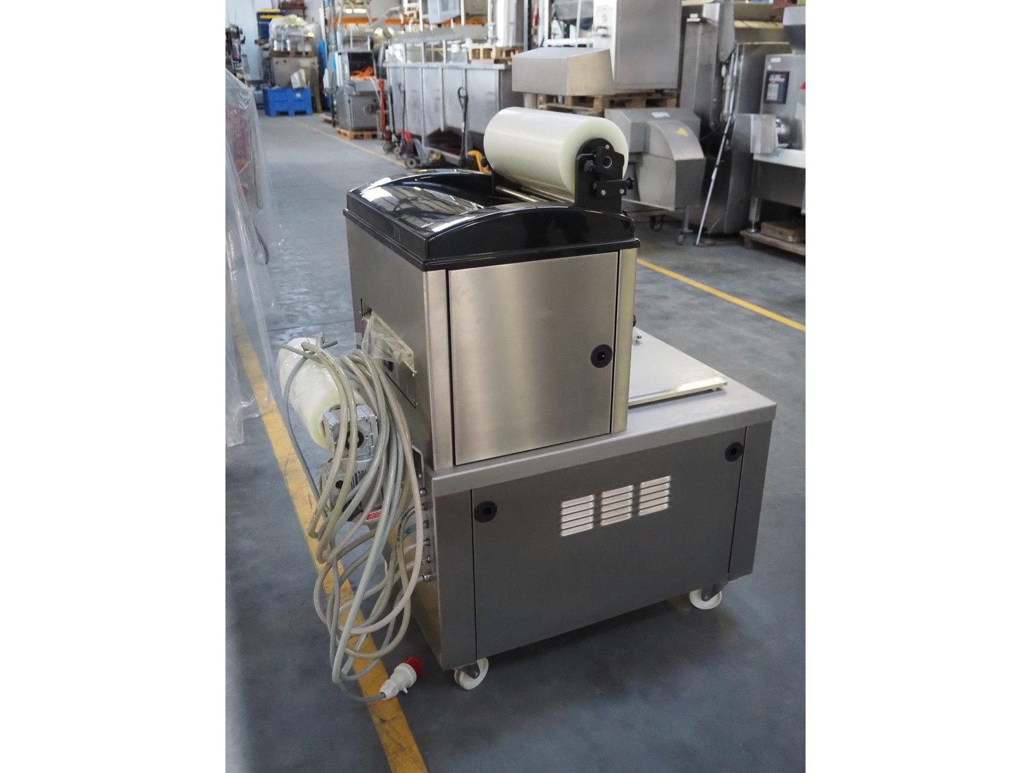 Multivac mobile traysealer, type: T200, serial number: 116029, year of construction: 2007, 400 V, 3 Ph, 50 Hz, 11 A, 4.5 kW, dye: 175 mm x 125 mm, film width: 450 mm, Busch vacuum pump, type: RA 0063 E 5Z1, number: 060105047, capacity: 63 m³ per hour, total dimensions: 1250 mm x 760 mm x 1620 mm. Including box with extra top dye and with parts.