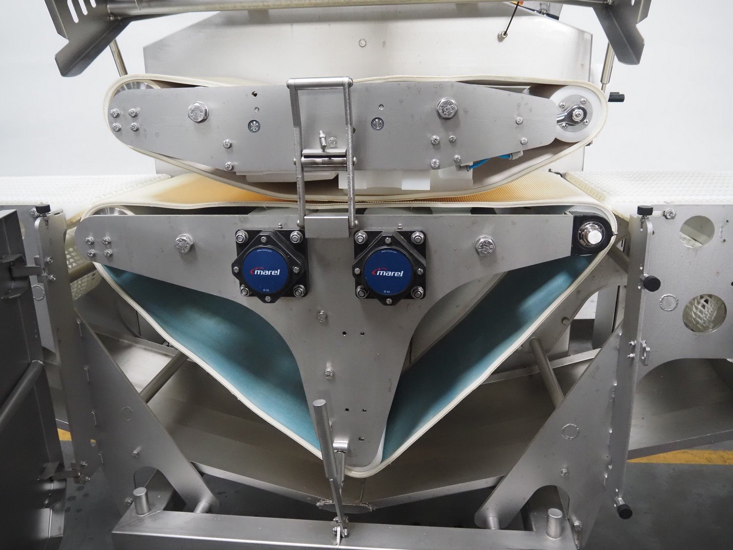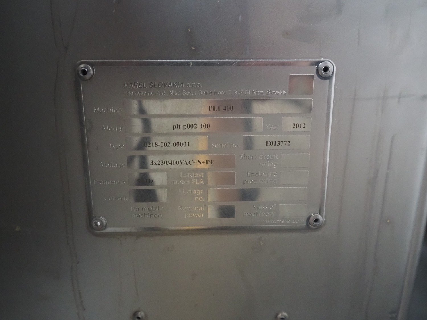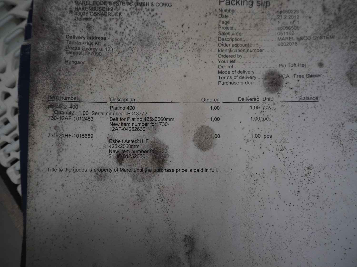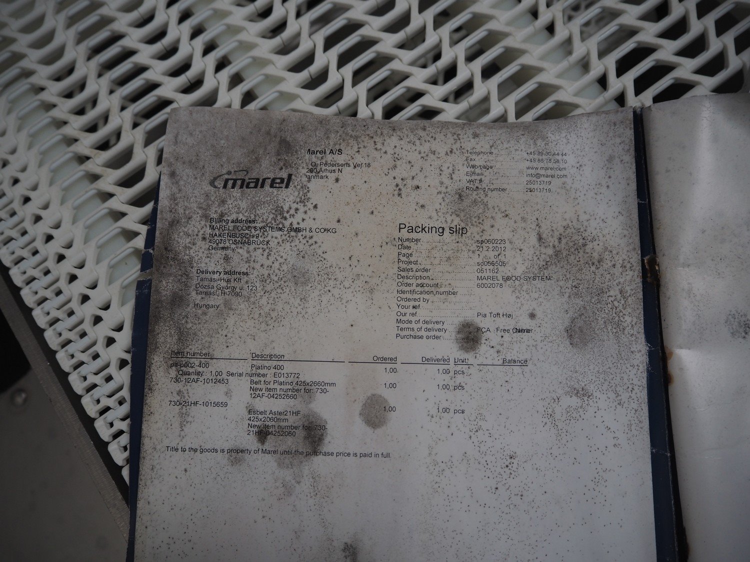Marel flattener, model: plt-p002-400, type: 0218-002-00001, serial number: E013772, year of construction: 2012, 230/400 V, 3 Ph, 50 Hz, plastic mesh belt, belt width: 405 mm and 430 mm, total dimensions: 2260 mm x 1040 mm x 1480. Including 4 extra belts.