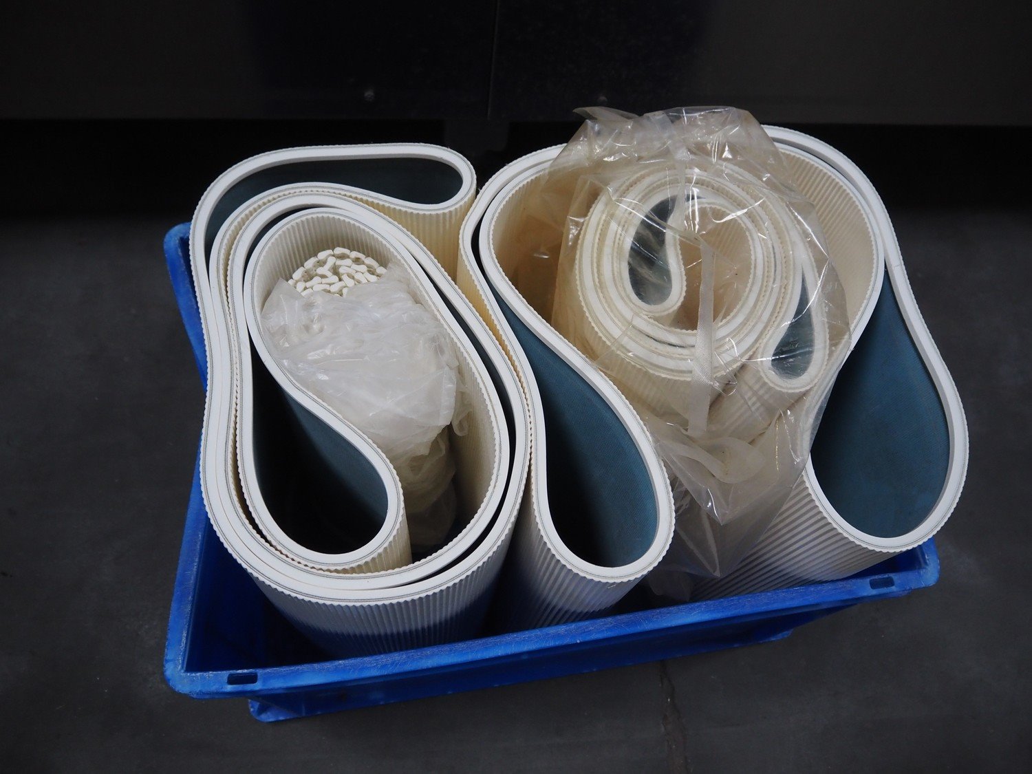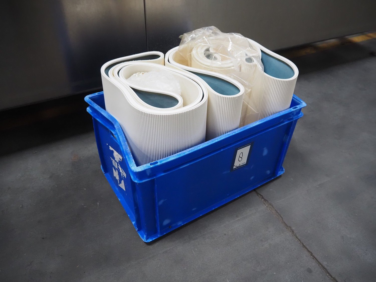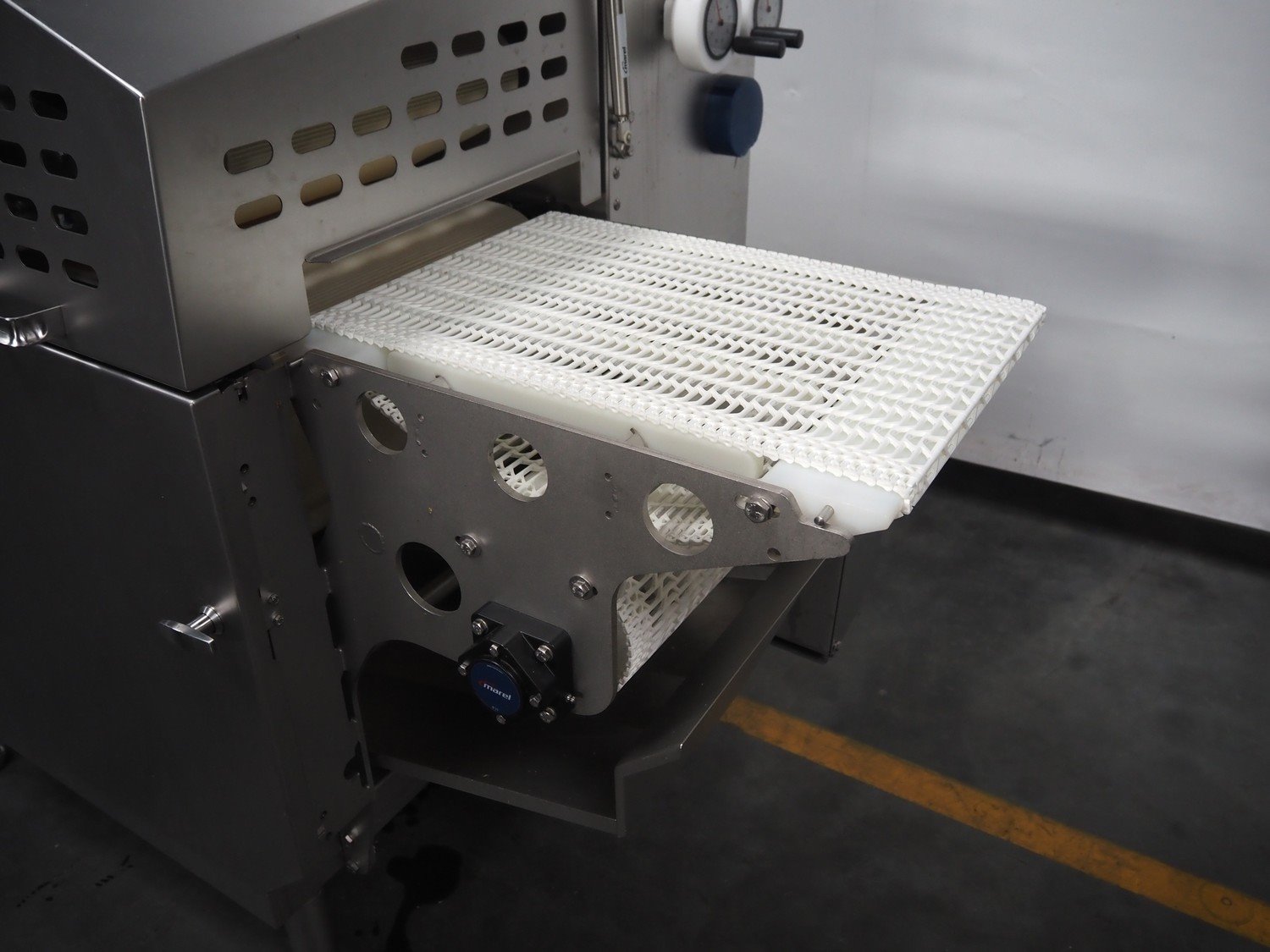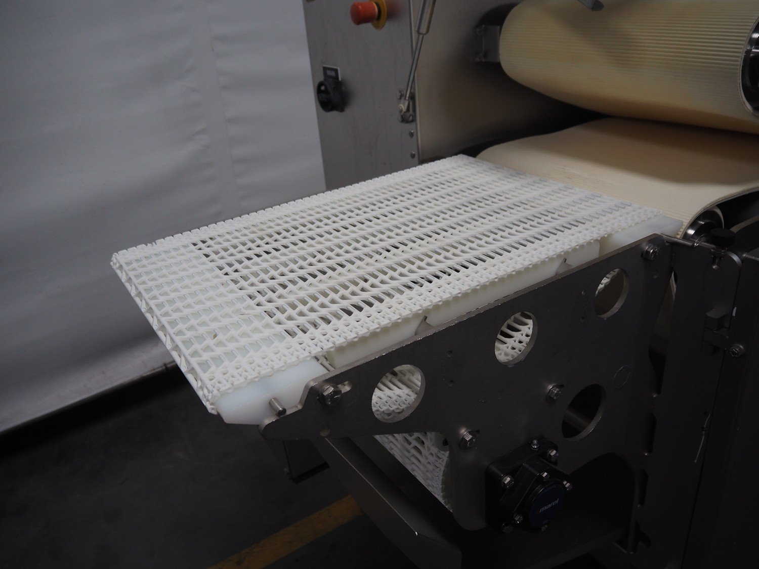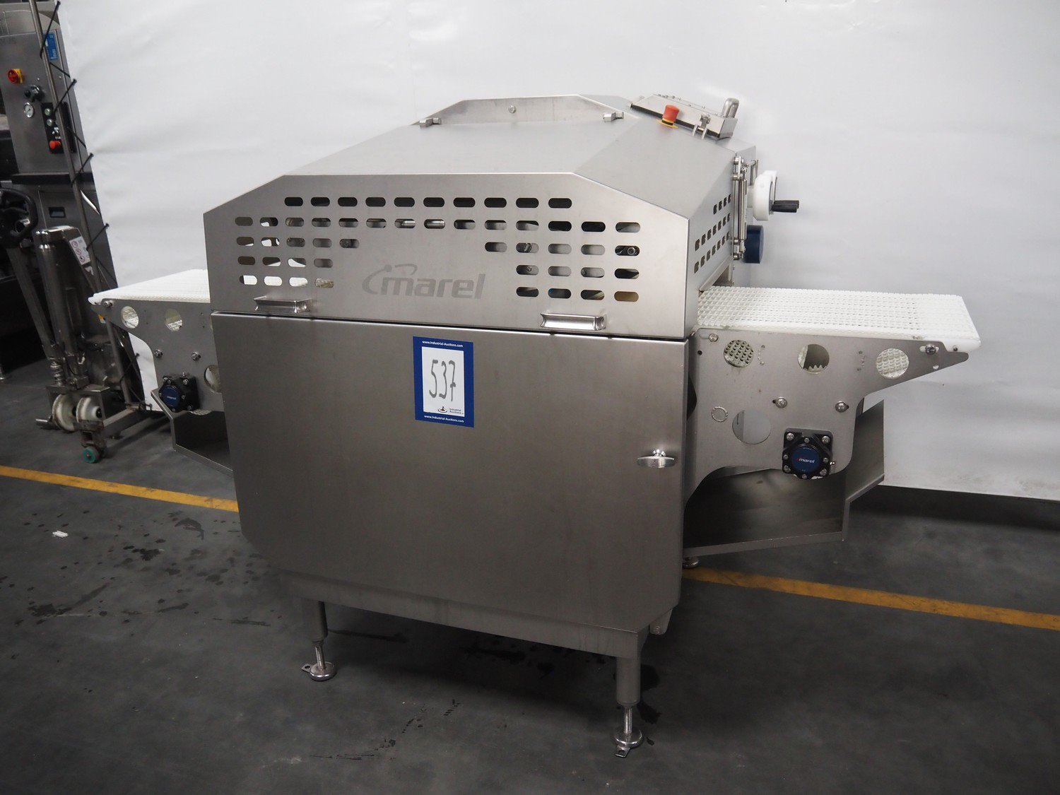 Marel flattener, model: plt-p002-400, type: 0218-002-00001, serial number: E013772, year of construction: 2012, 230/400 V, 3 Ph, 50 Hz, plastic mesh belt, belt width: 405 mm and 430 mm, total dimensions: 2260 mm x 1040 mm x 1480. Including 4 extra belts.