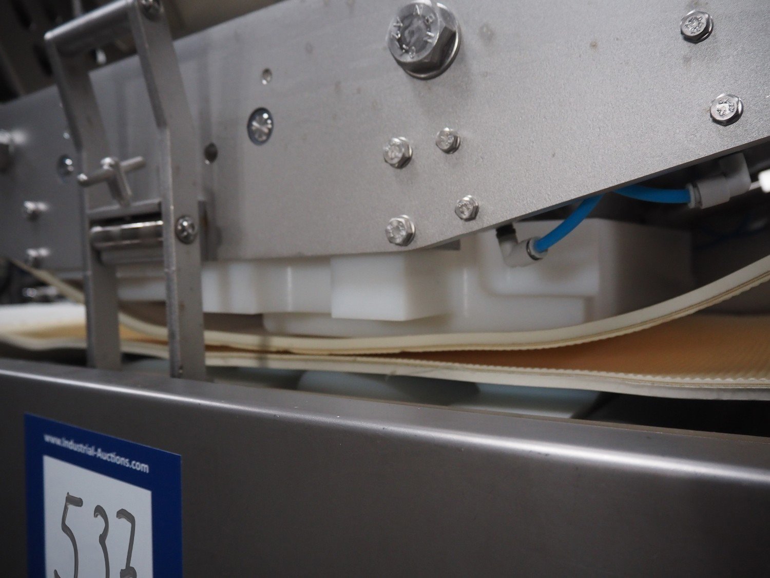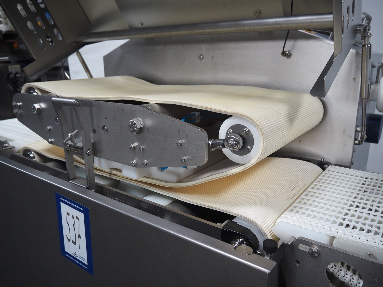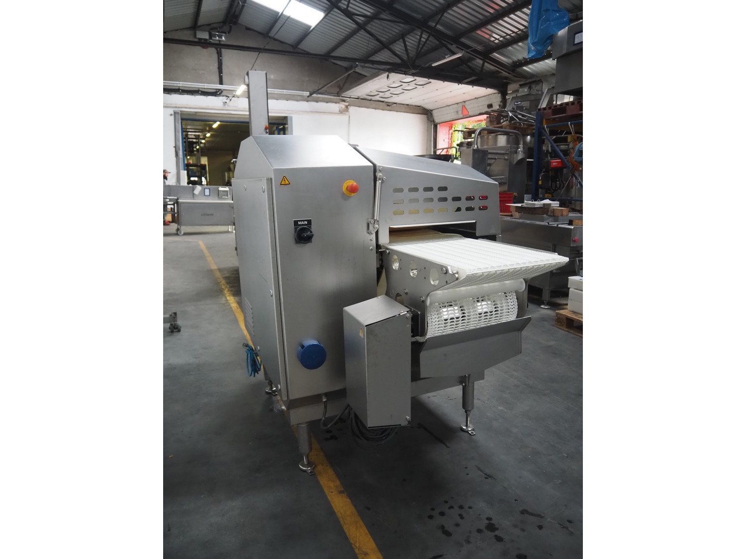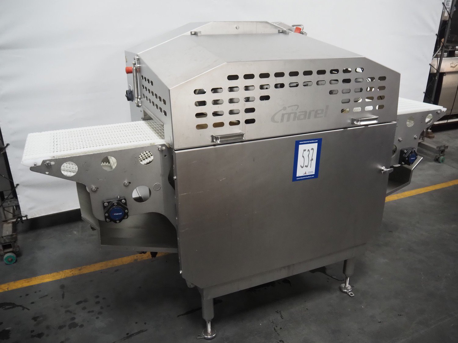 Marel flattener, model: plt-p002-400, type: 0218-002-00001, serial number: E013772, year of construction: 2012, 230/400 V, 3 Ph, 50 Hz, plastic mesh belt, belt width: 405 mm and 430 mm, total dimensions: 2260 mm x 1040 mm x 1480. Including 4 extra belts.