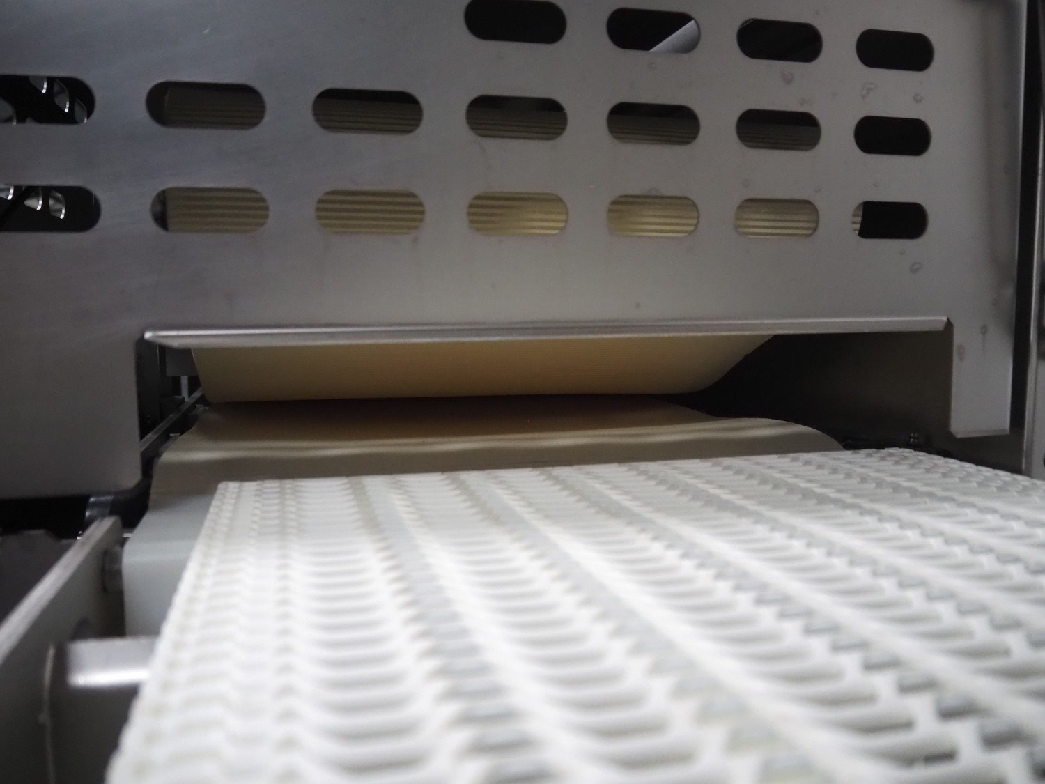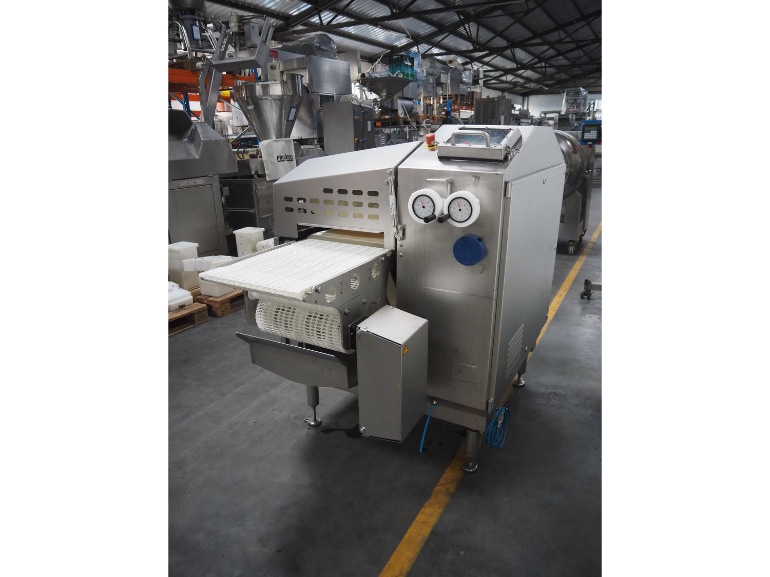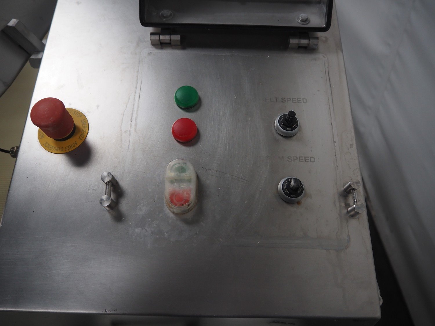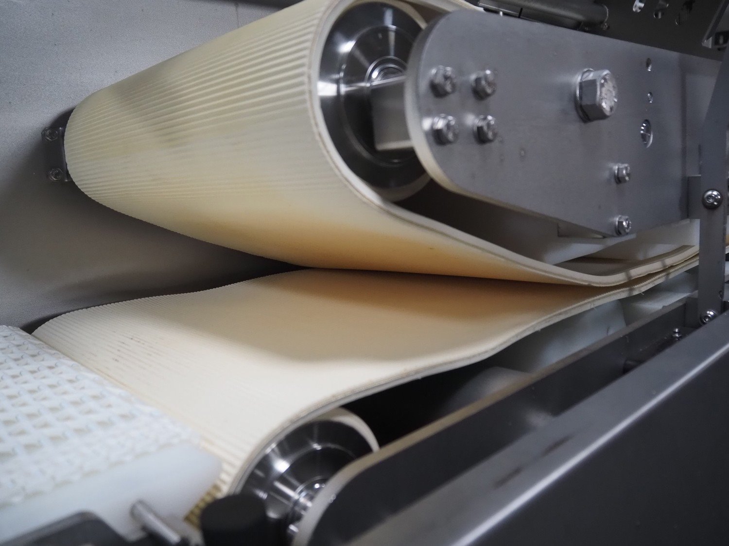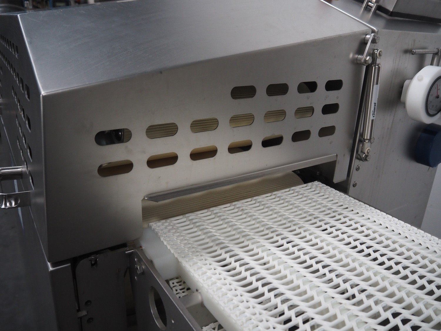 Marel flattener, model: plt-p002-400, type: 0218-002-00001, serial number: E013772, year of construction: 2012, 230/400 V, 3 Ph, 50 Hz, plastic mesh belt, belt width: 405 mm and 430 mm, total dimensions: 2260 mm x 1040 mm x 1480. Including 4 extra belts.