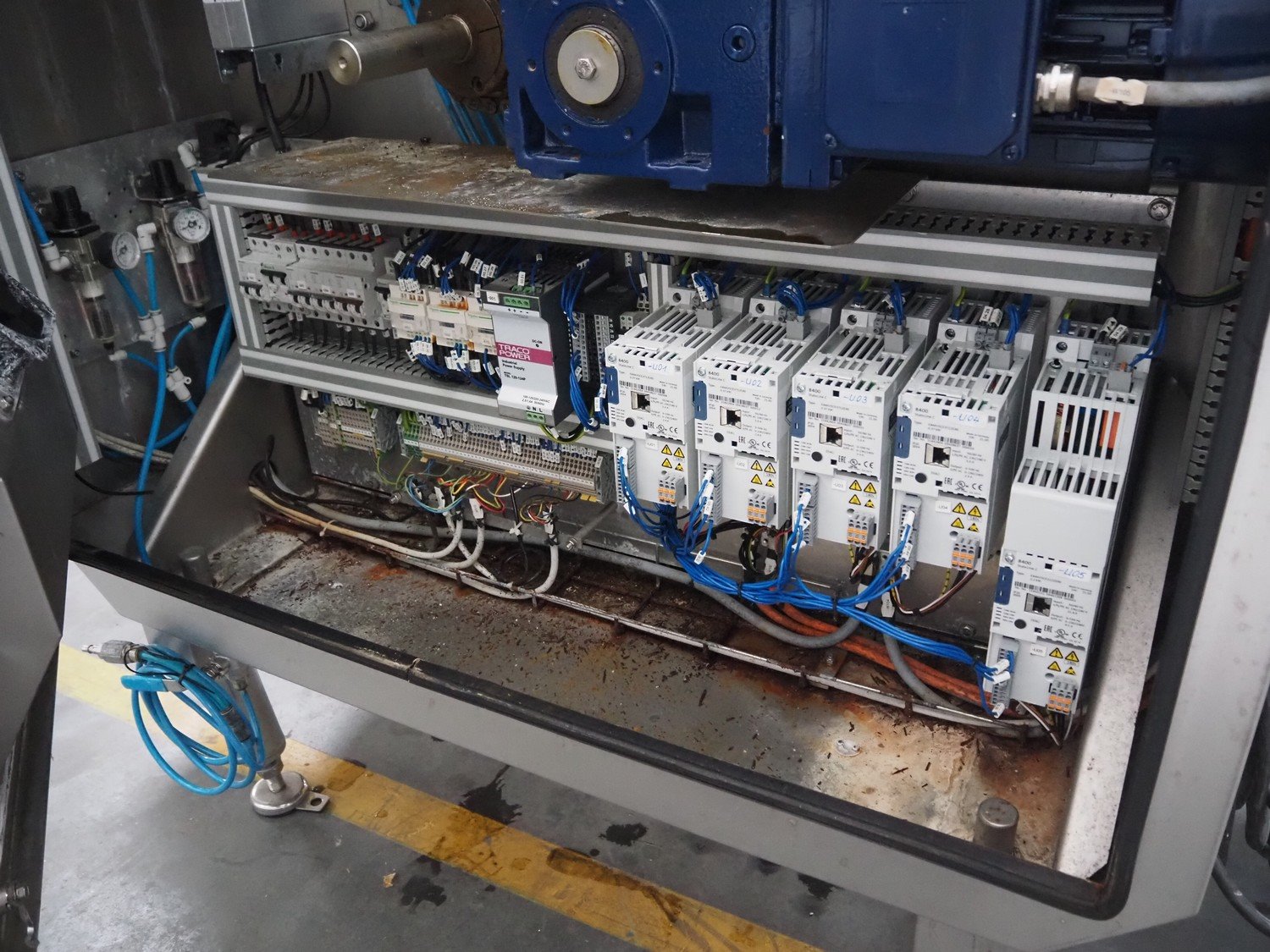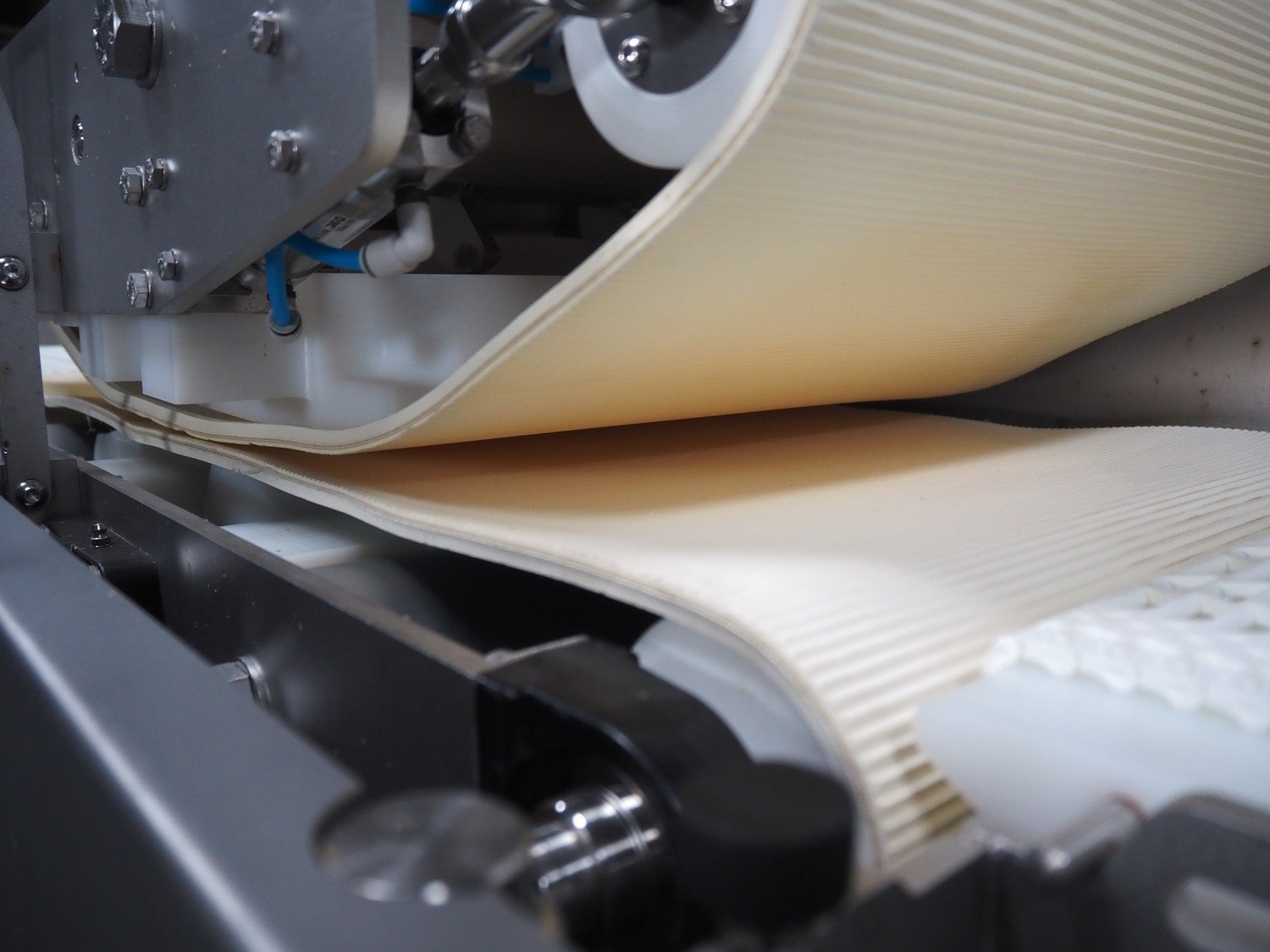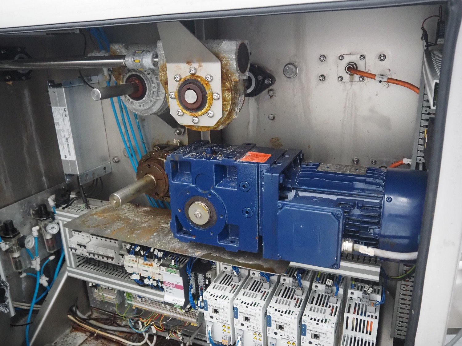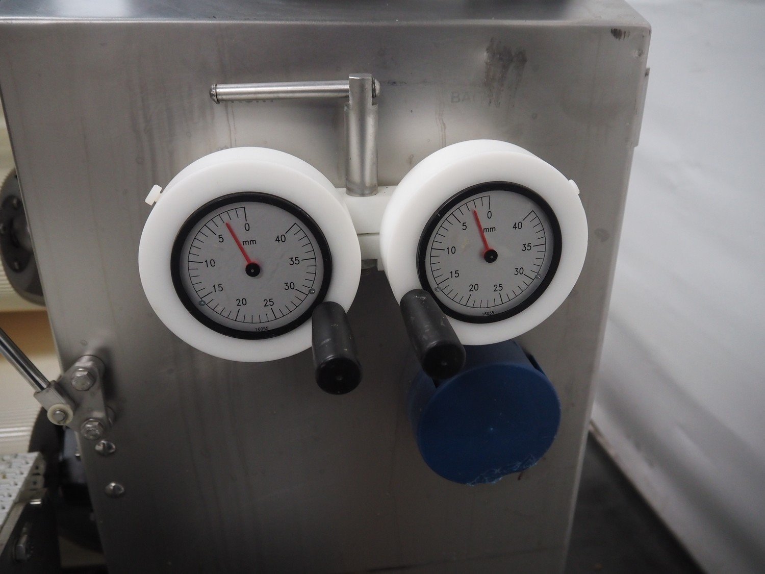 Marel flattener, model: plt-p002-400, type: 0218-002-00001, serial number: E013772, year of construction: 2012, 230/400 V, 3 Ph, 50 Hz, plastic mesh belt, belt width: 405 mm and 430 mm, total dimensions: 2260 mm x 1040 mm x 1480. Including 4 extra belts.