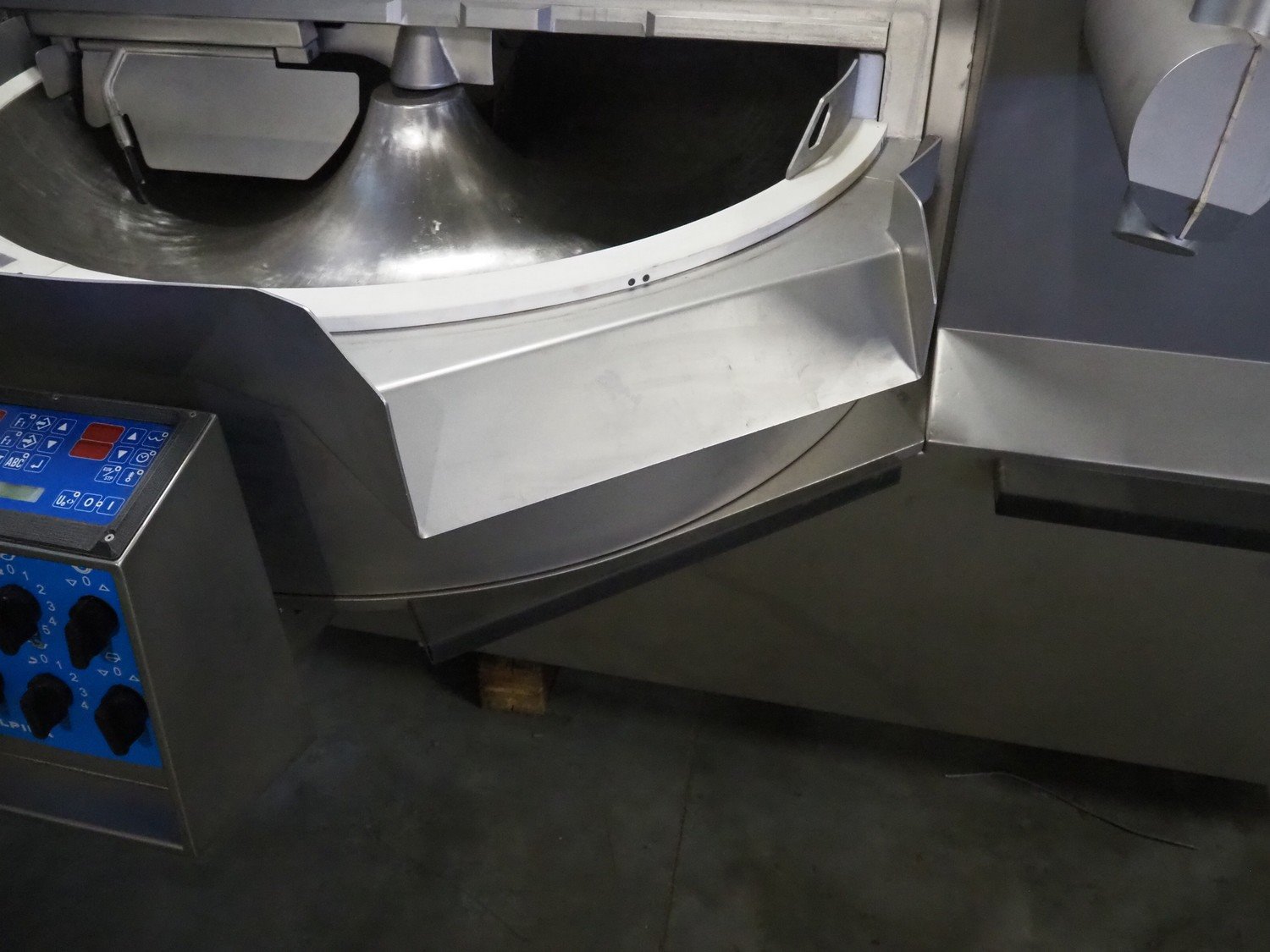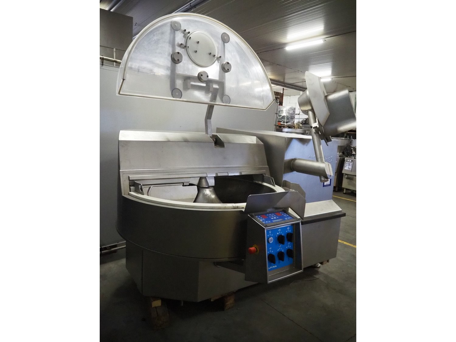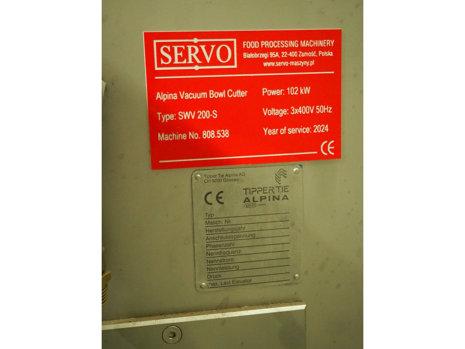 Tipper Tie Alpina AG vacuum bowl cutter with ejector, type: SWV 200-S, machine number: 808.538, year of construction: 2006, year of service: 2024, 400 V, 3 Ph, 50 Hz, 230 A, 102 kW, s/s bowl and knives, dimensions: 2600 mm x 2200 mm x 2300 mm. No lifter.