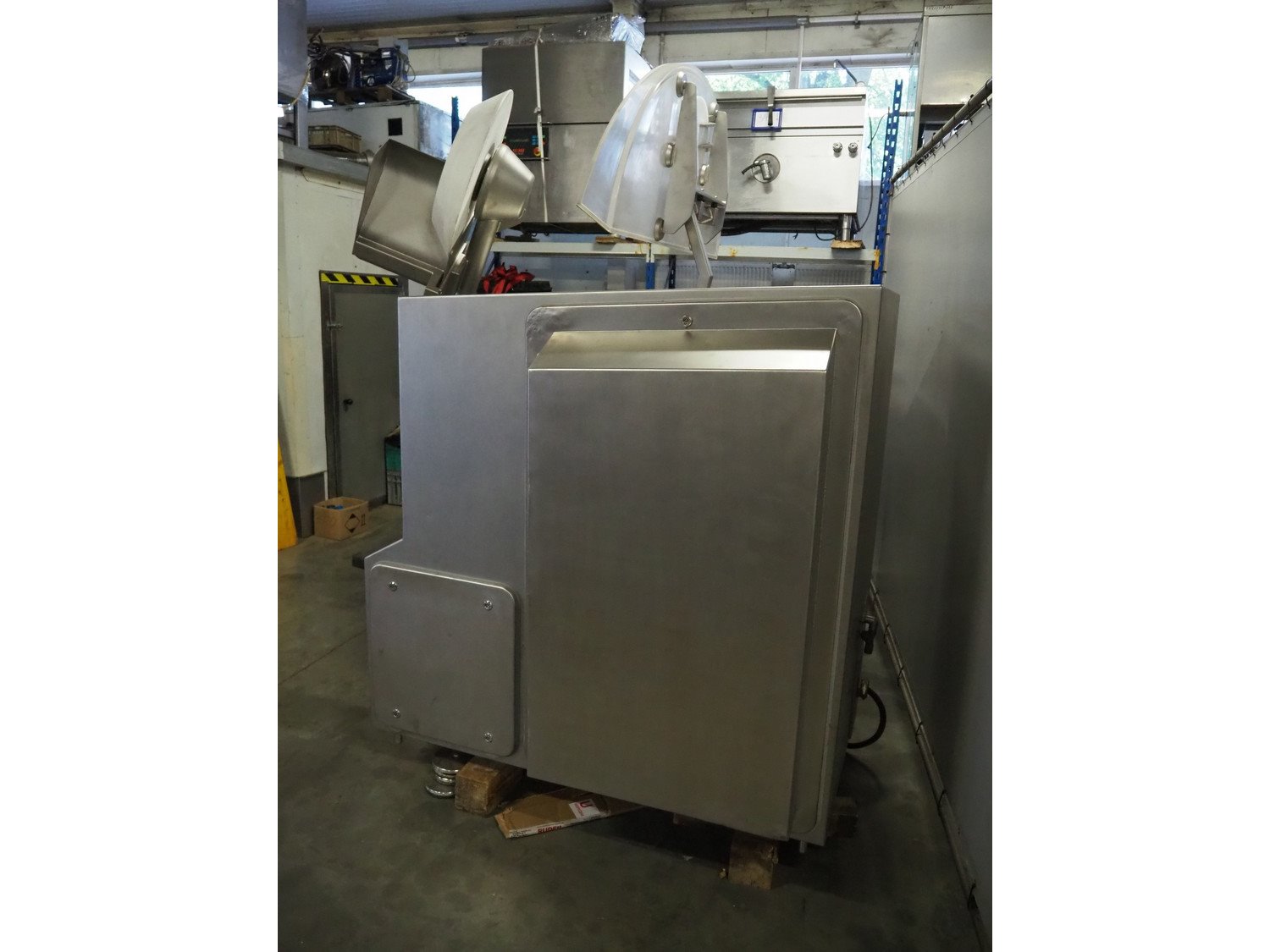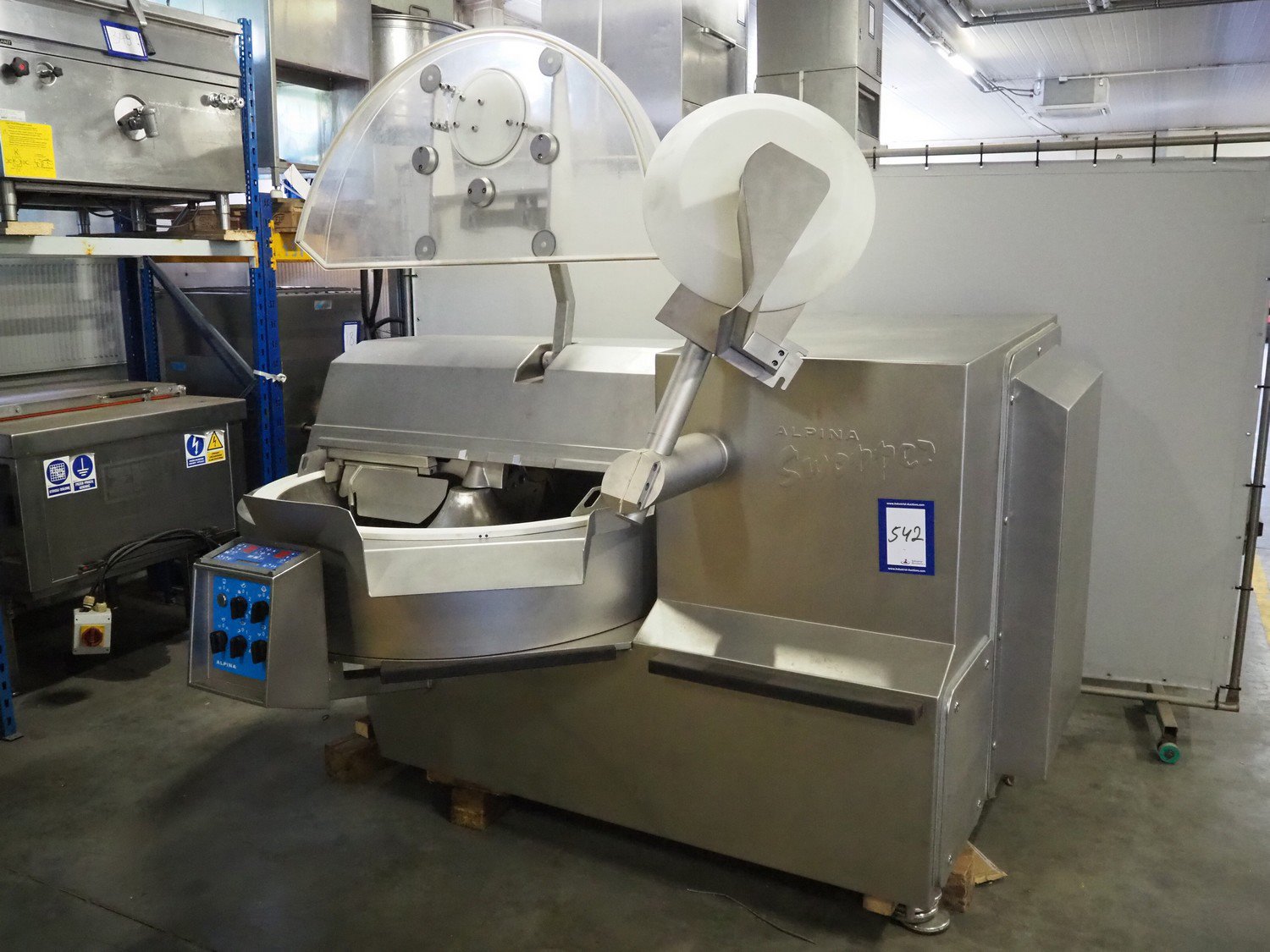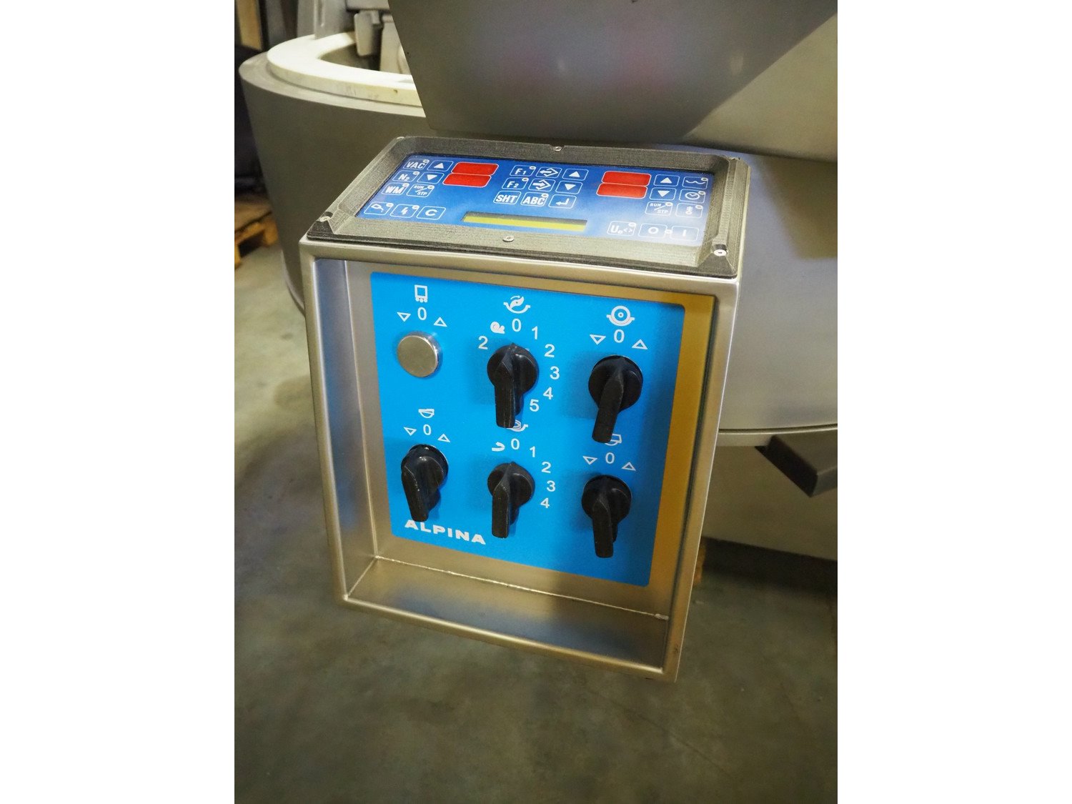 Tipper Tie Alpina AG vacuum bowl cutter with ejector, type: SWV 200-S, machine number: 808.538, year of construction: 2006, year of service: 2024, 400 V, 3 Ph, 50 Hz, 230 A, 102 kW, s/s bowl and knives, dimensions: 2600 mm x 2200 mm x 2300 mm. No lifter.