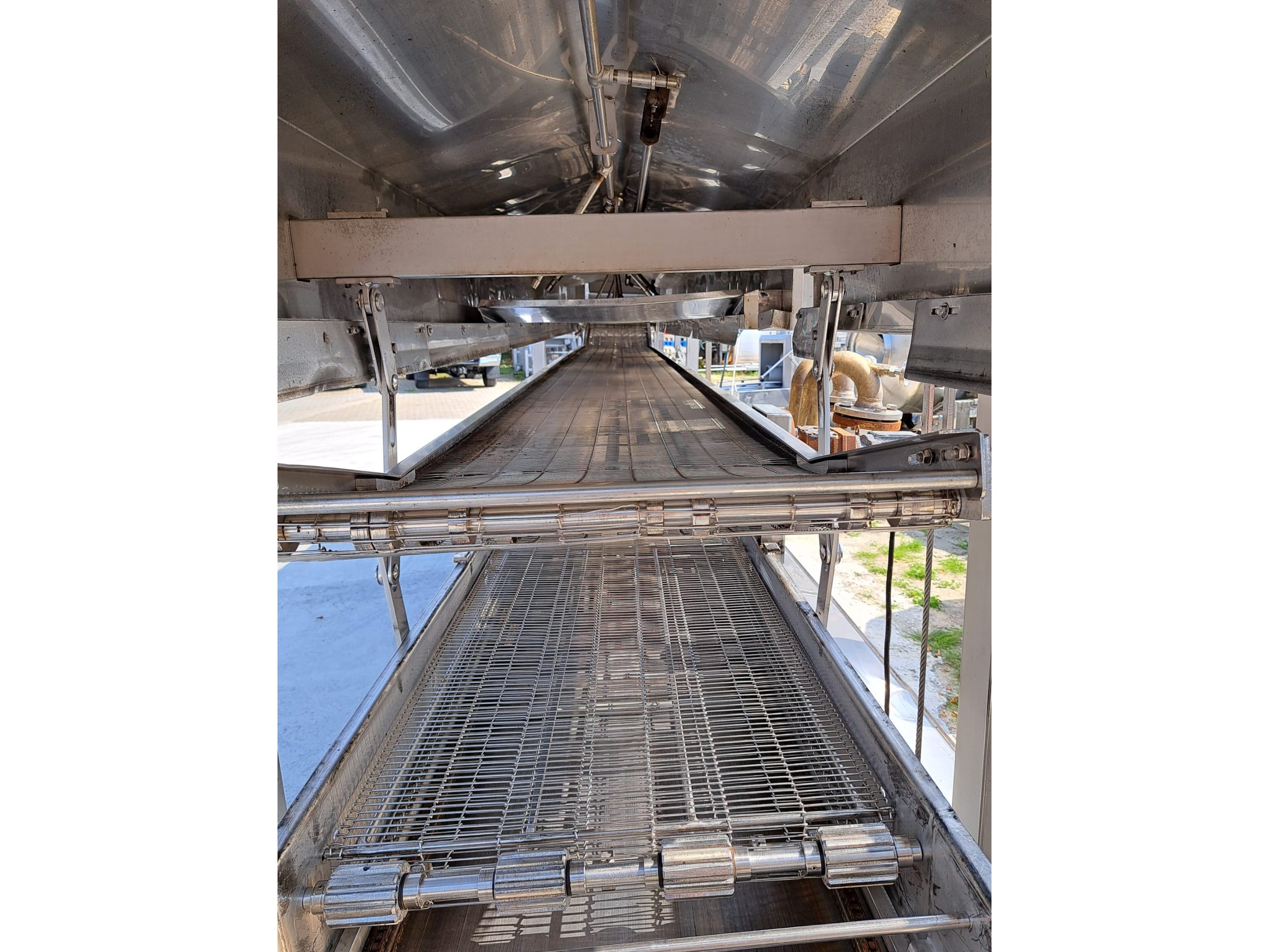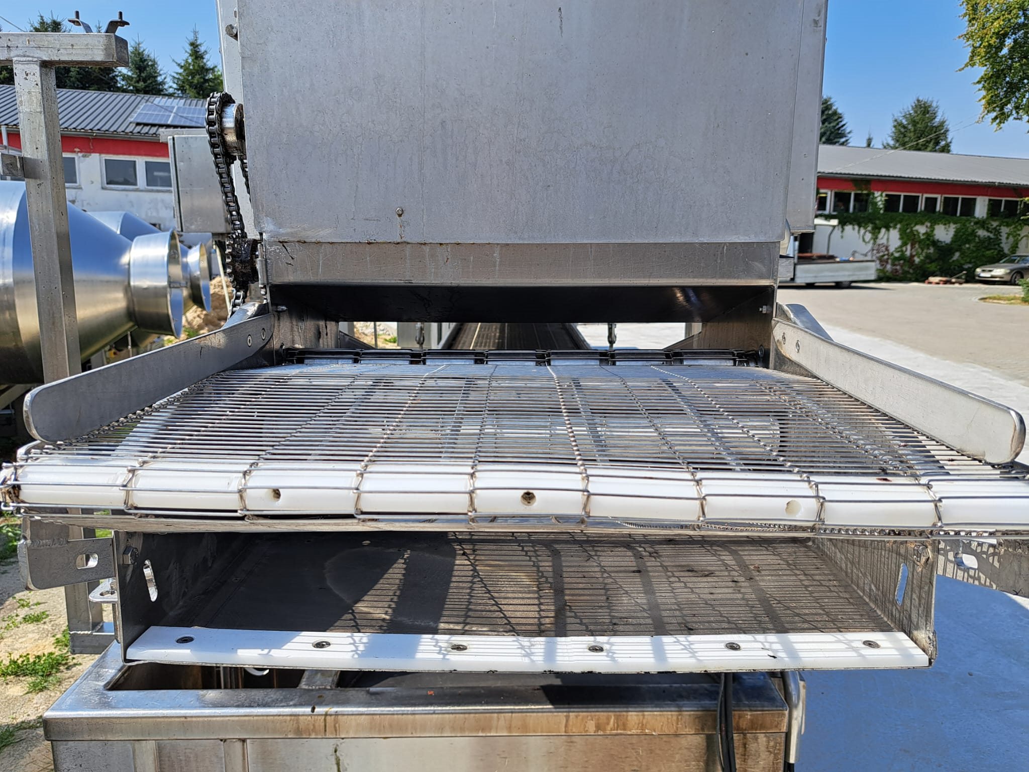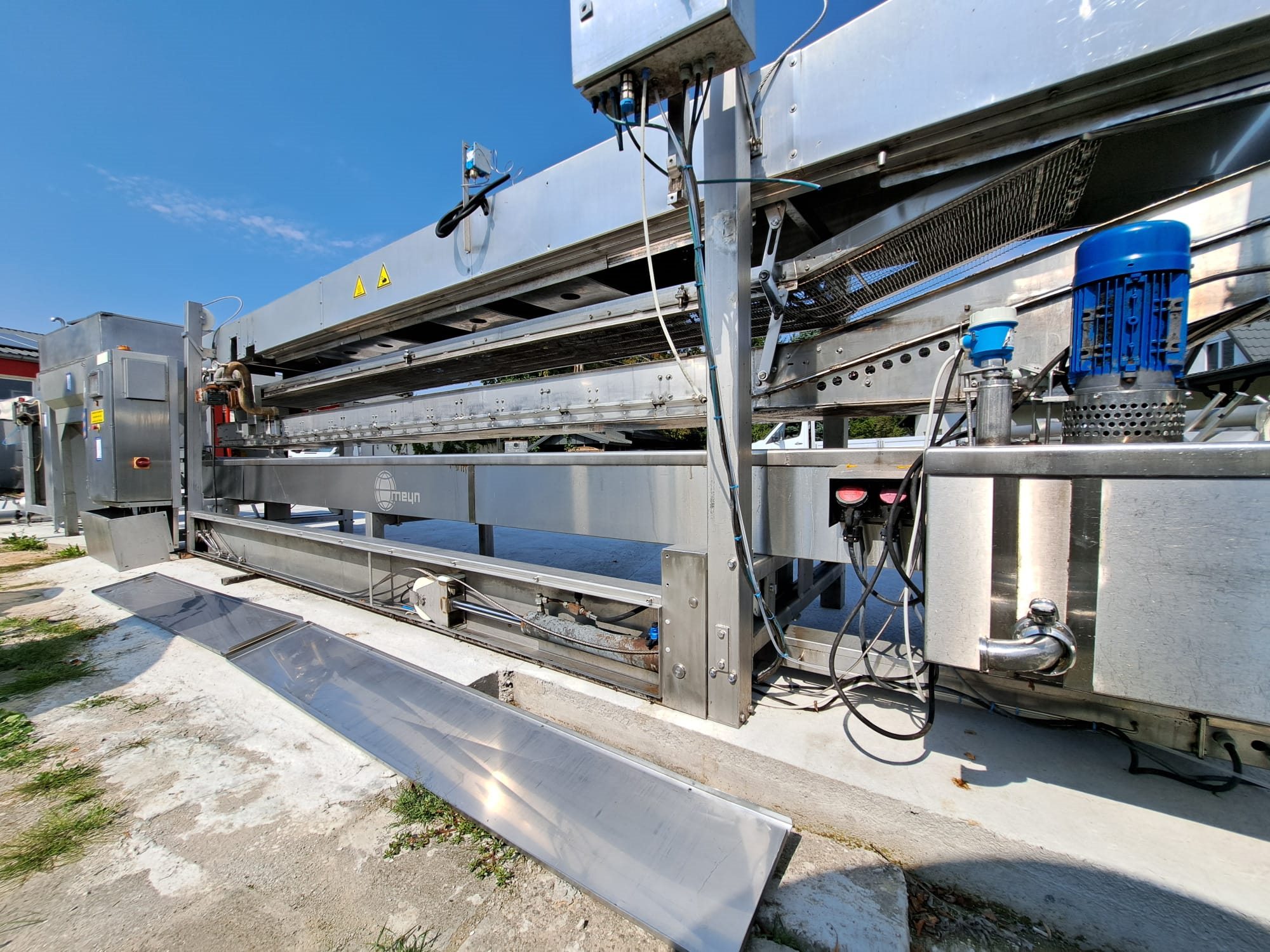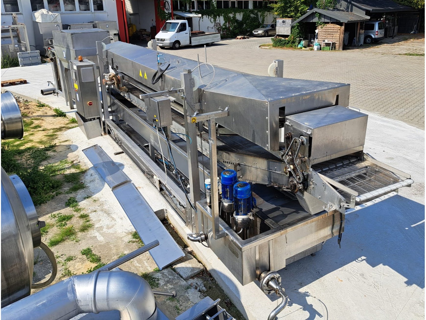 Meyn fryer, type: 600/5000 TH, machine number: 83390, year of construction: 1998, s/s mesh belt, belt width: 600 mm, total dimensions: 8000 mm x 1900 mm x 2400 mm. Including s/s thermic oil tank, circulation pump in s/s cabinet and other spare parts, dimensions tank: 2250 mm x 1000 mm x 2350 mm, dimensions cabinet: 1700 mm x 1000 mm x 1750 mm.