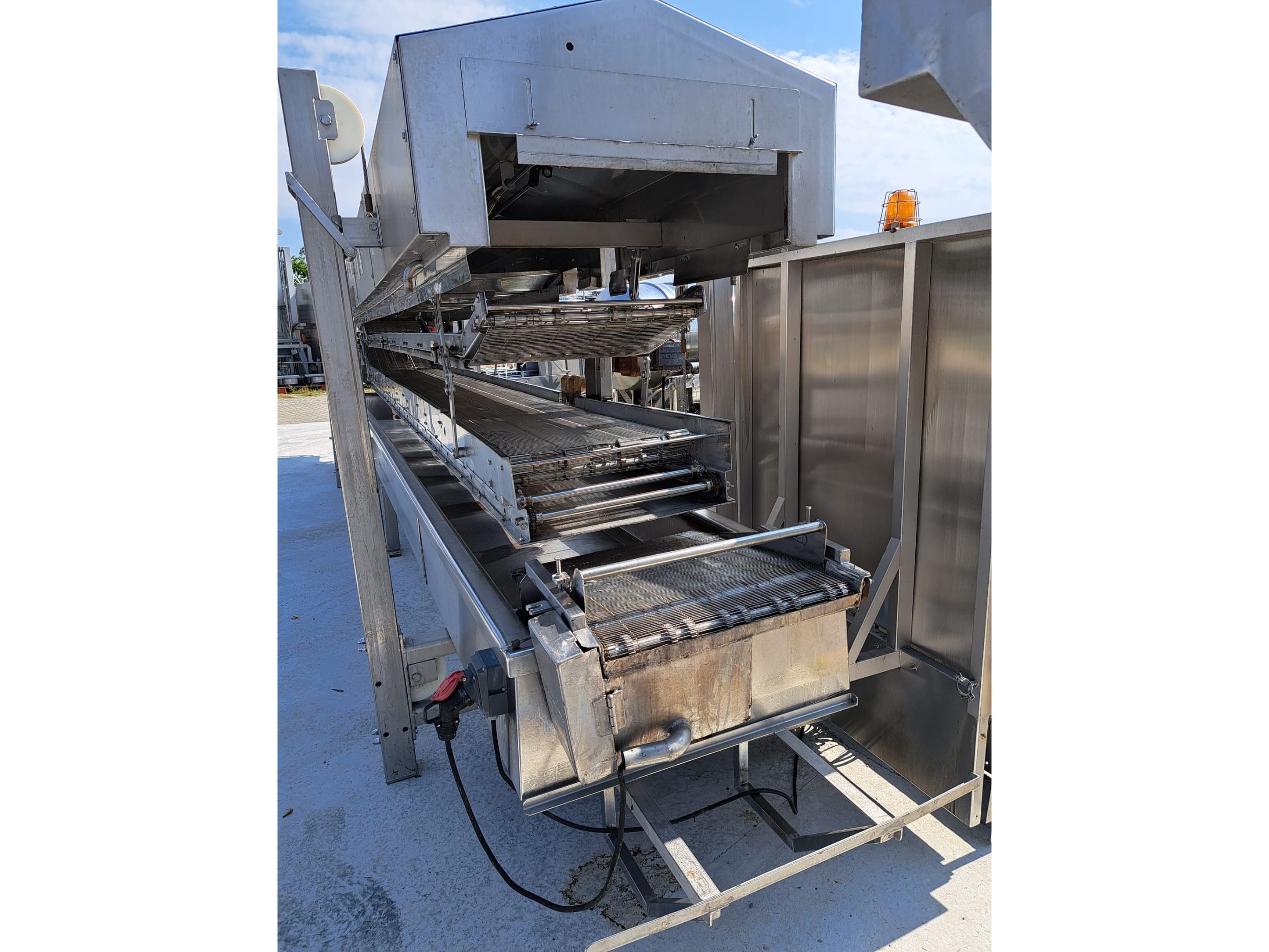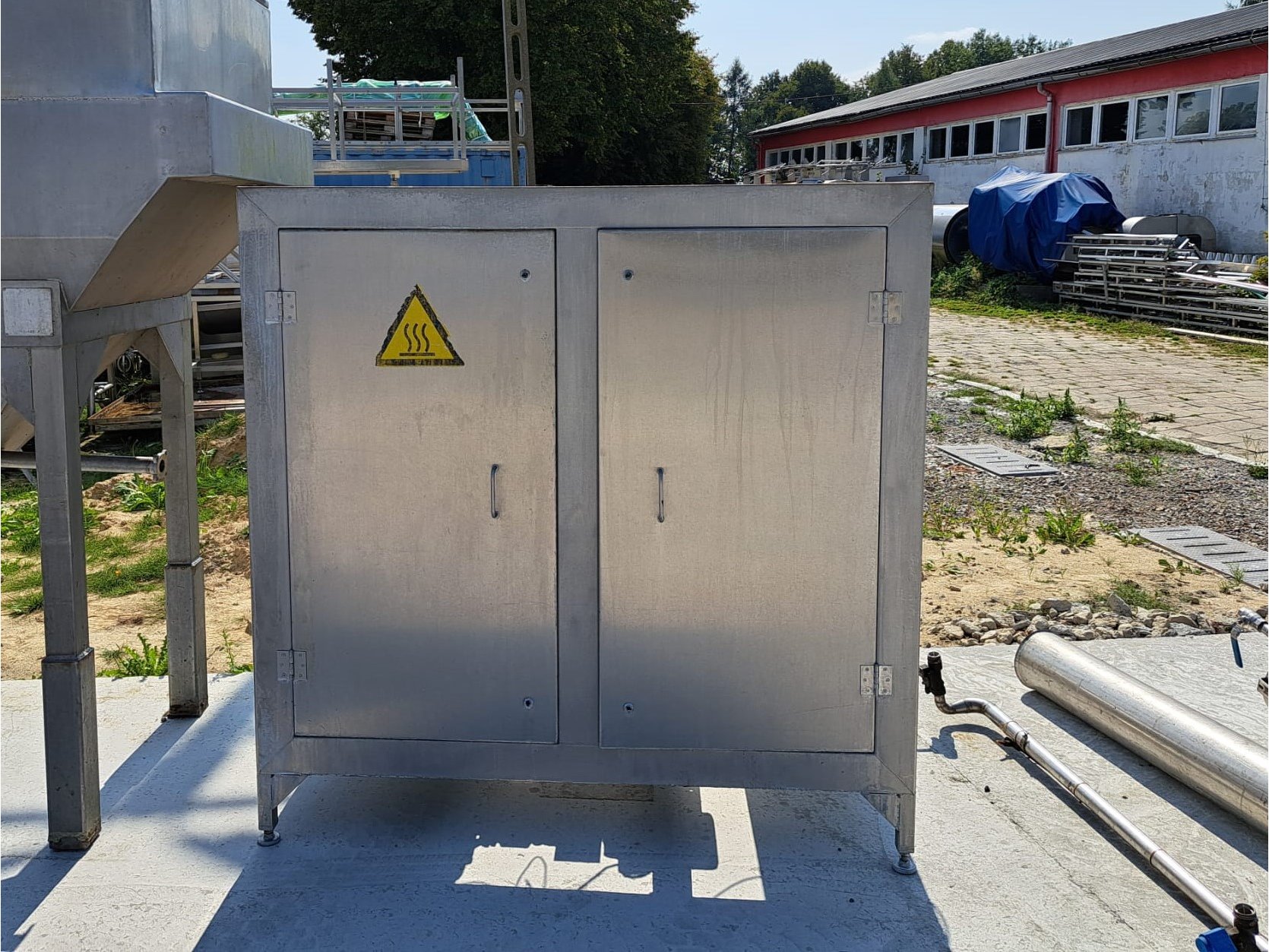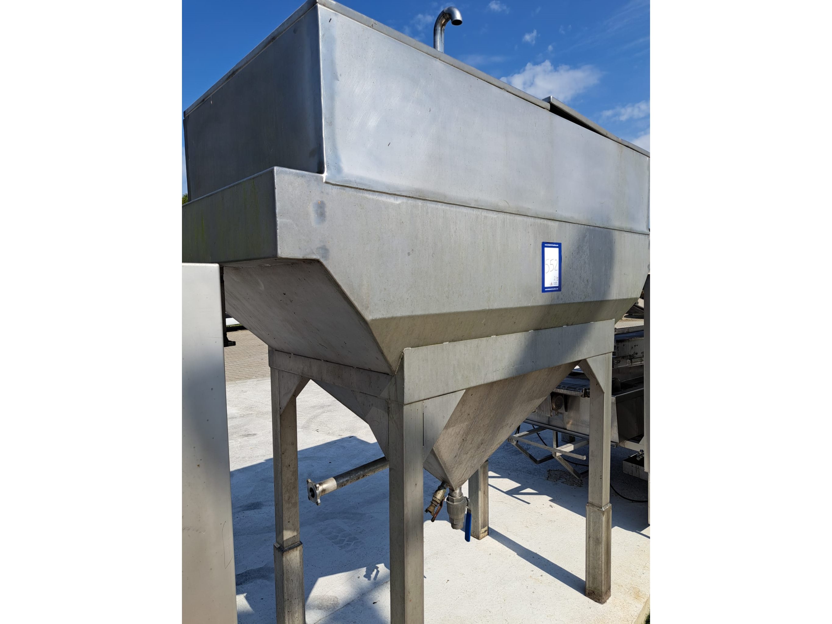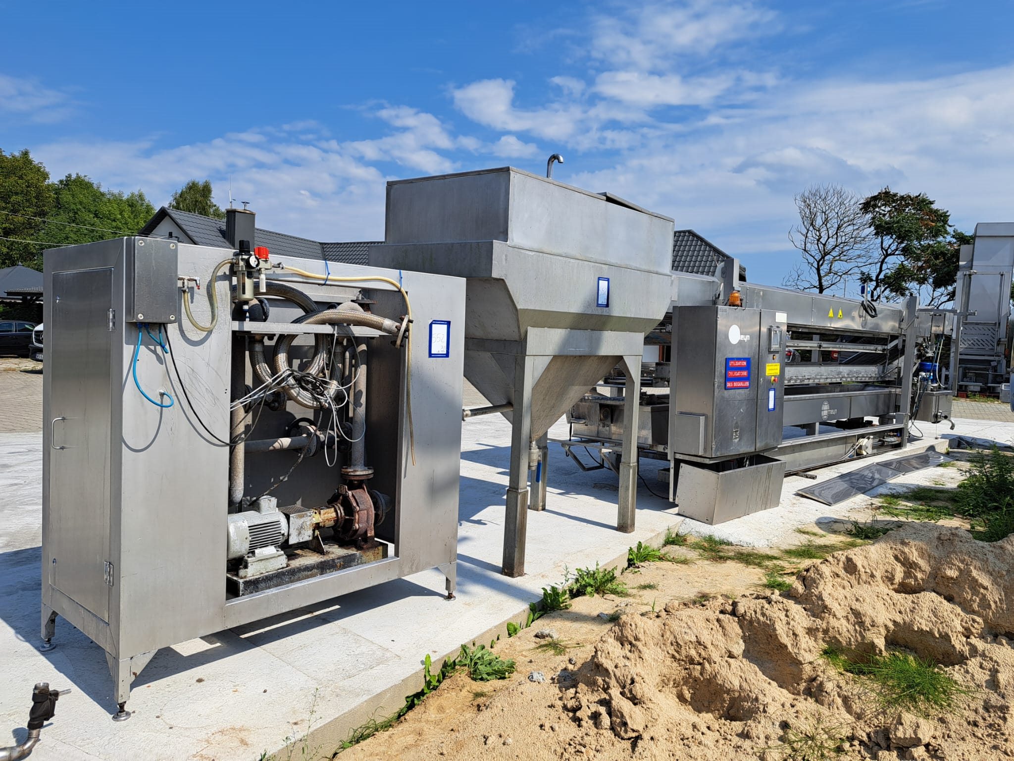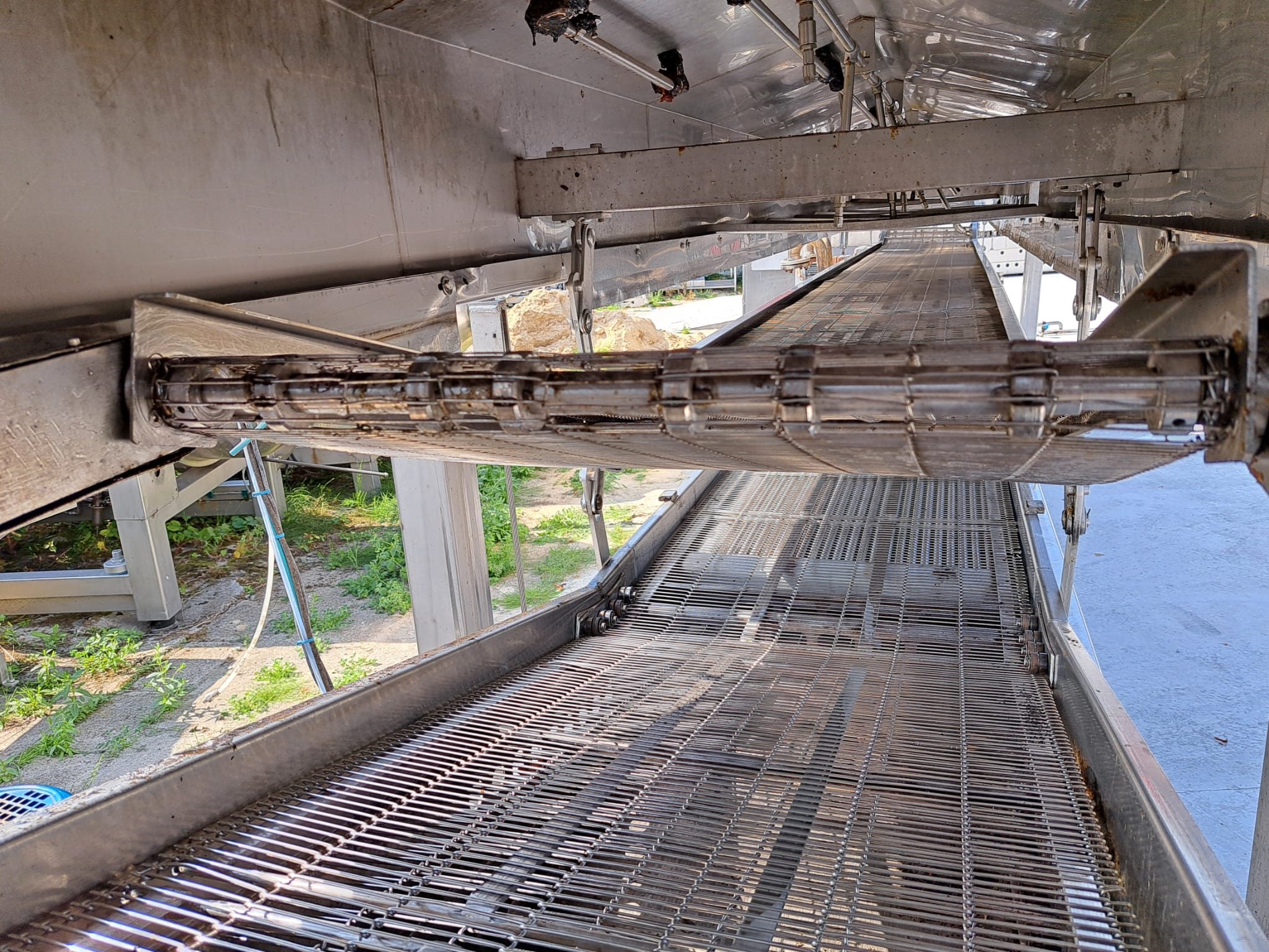 Meyn fryer, type: 600/5000 TH, machine number: 83390, year of construction: 1998, s/s mesh belt, belt width: 600 mm, total dimensions: 8000 mm x 1900 mm x 2400 mm. Including s/s thermic oil tank, circulation pump in s/s cabinet and other spare parts, dimensions tank: 2250 mm x 1000 mm x 2350 mm, dimensions cabinet: 1700 mm x 1000 mm x 1750 mm.