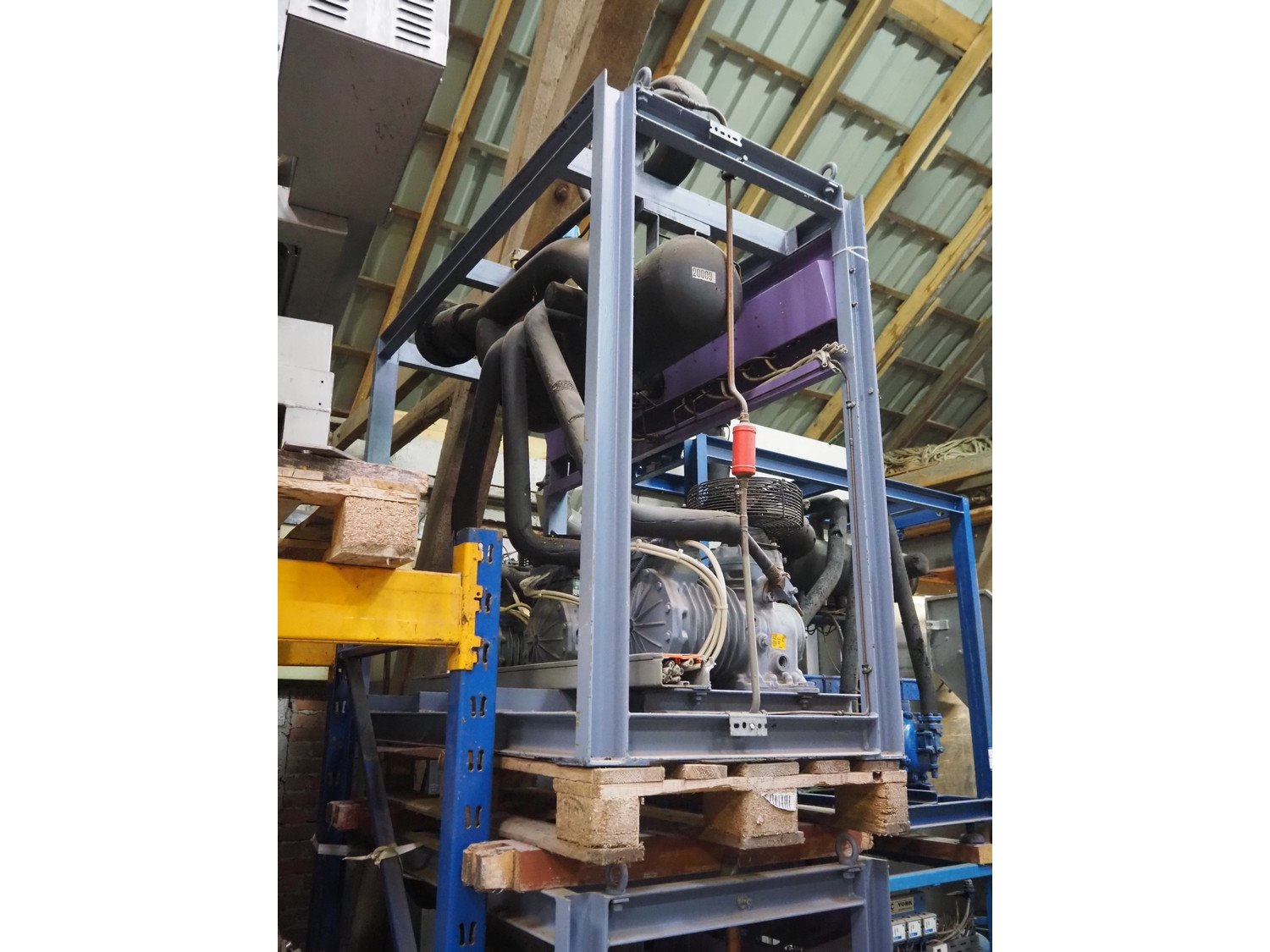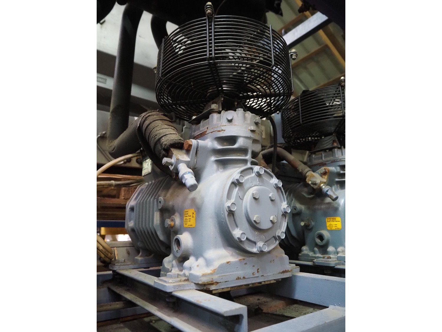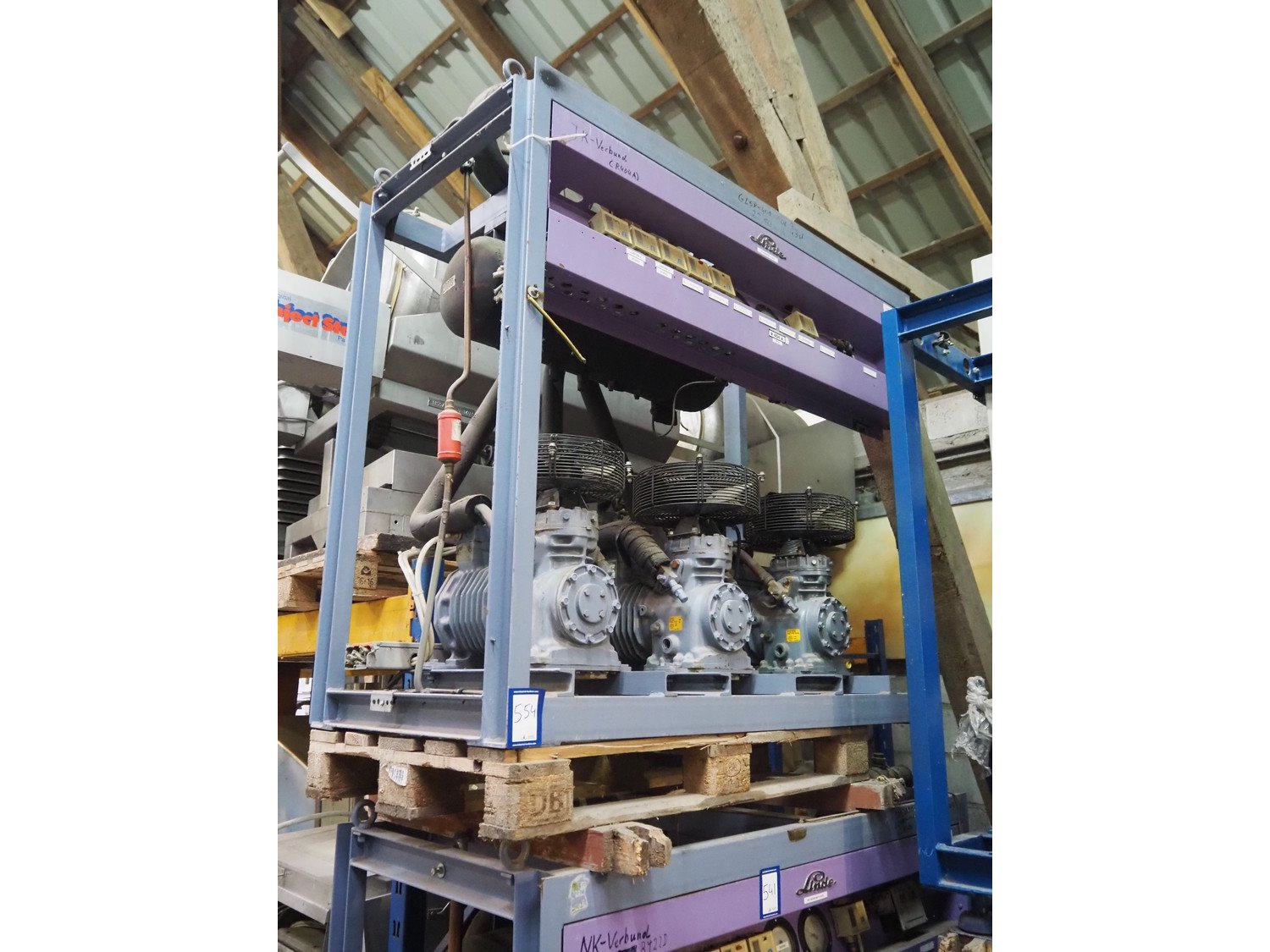 Linde AG cooling compressor rack, type: VRM 305-1491, number: 4517, consisting of 3 DWM Copeland cooling compressors, type: DLSGF-401-EWL-000, number: 438639, refrigerant: R 502, dimensions: 1600 mm x 800 mm x 1740 mm.
