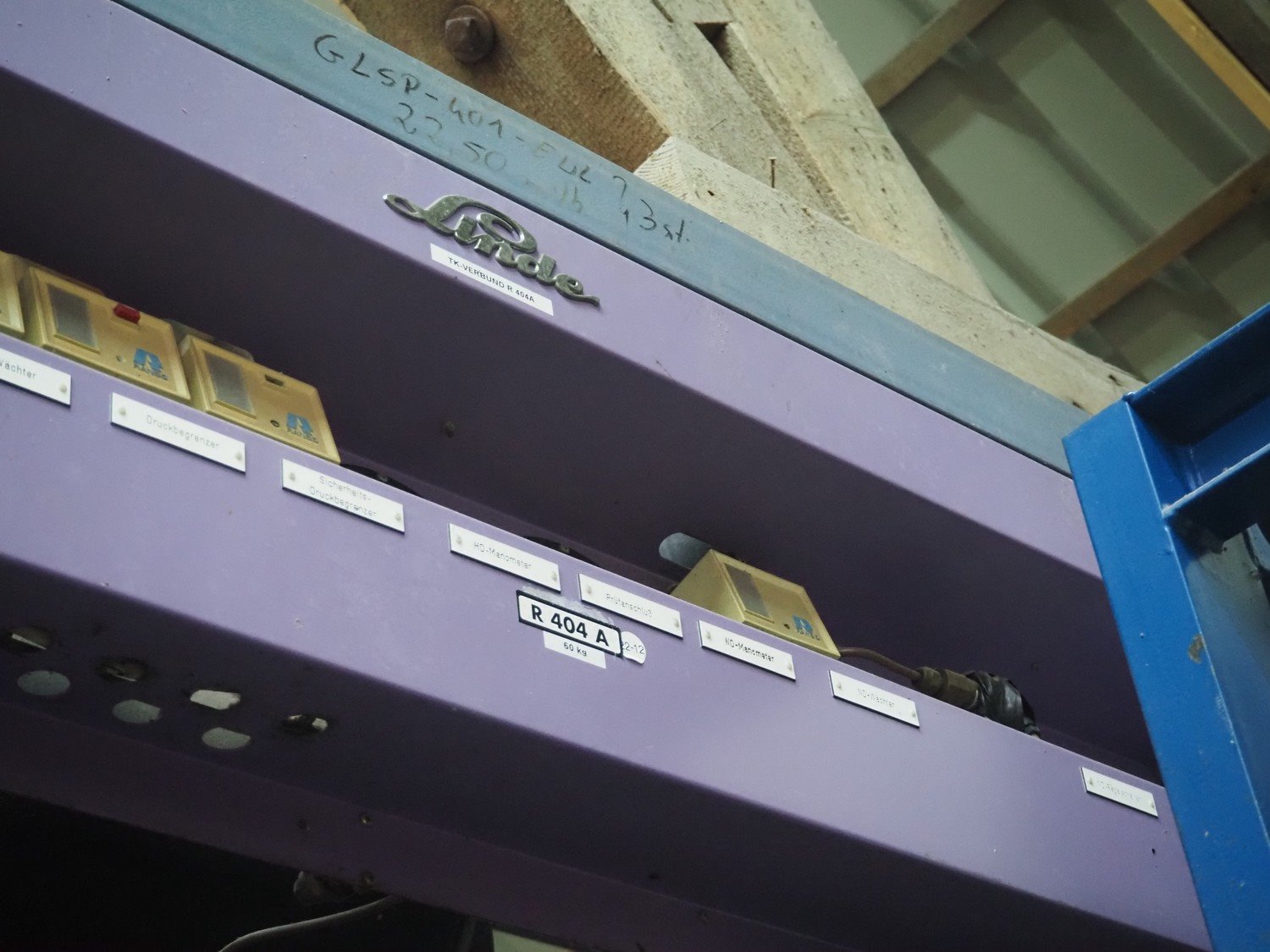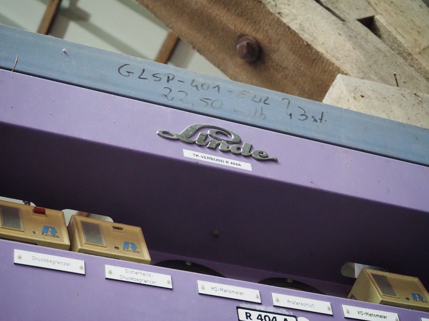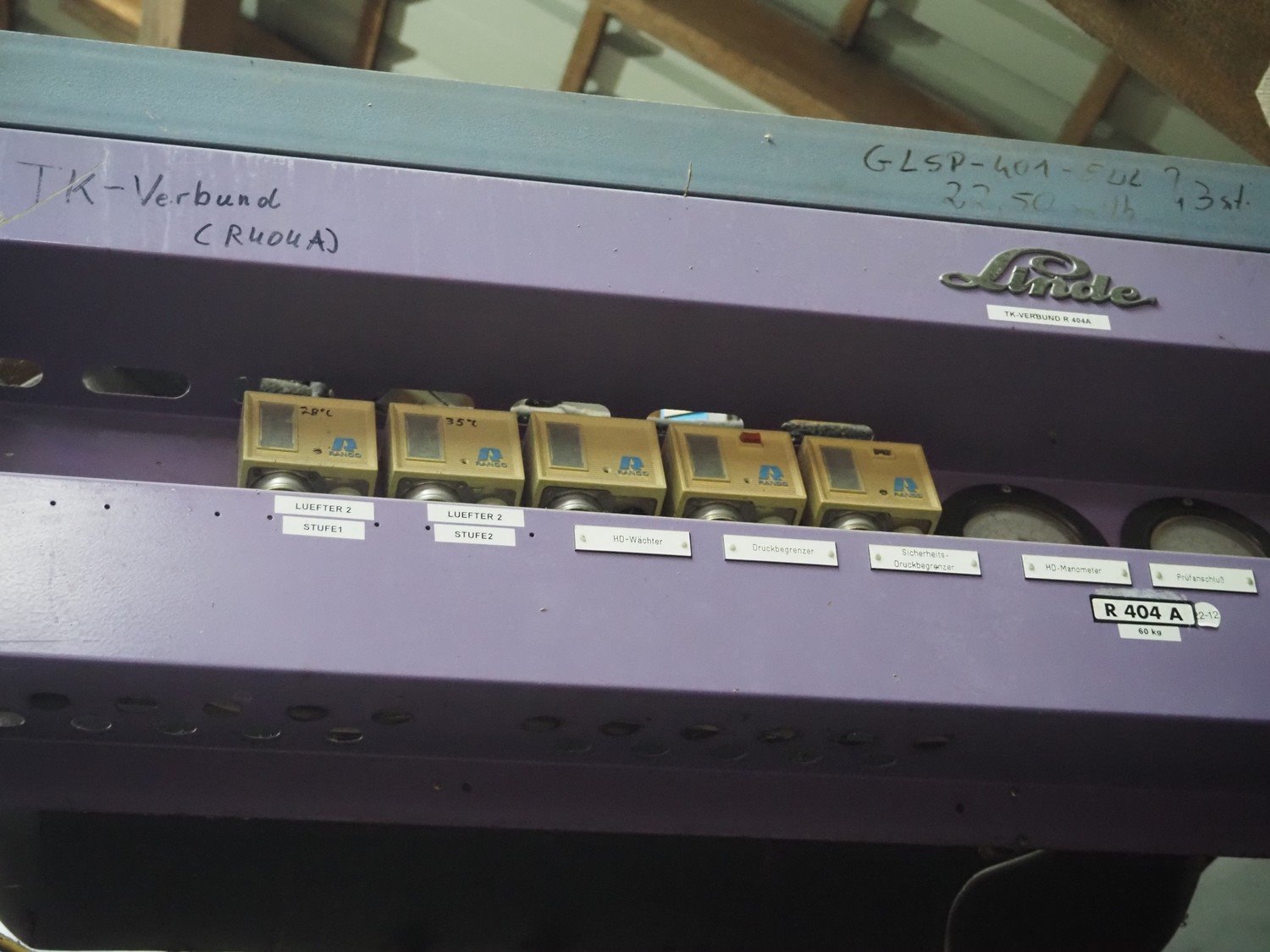 Linde AG cooling compressor rack, type: VRM 305-1491, number: 4517, consisting of 3 DWM Copeland cooling compressors, type: DLSGF-401-EWL-000, number: 438639, refrigerant: R 502, dimensions: 1600 mm x 800 mm x 1740 mm.