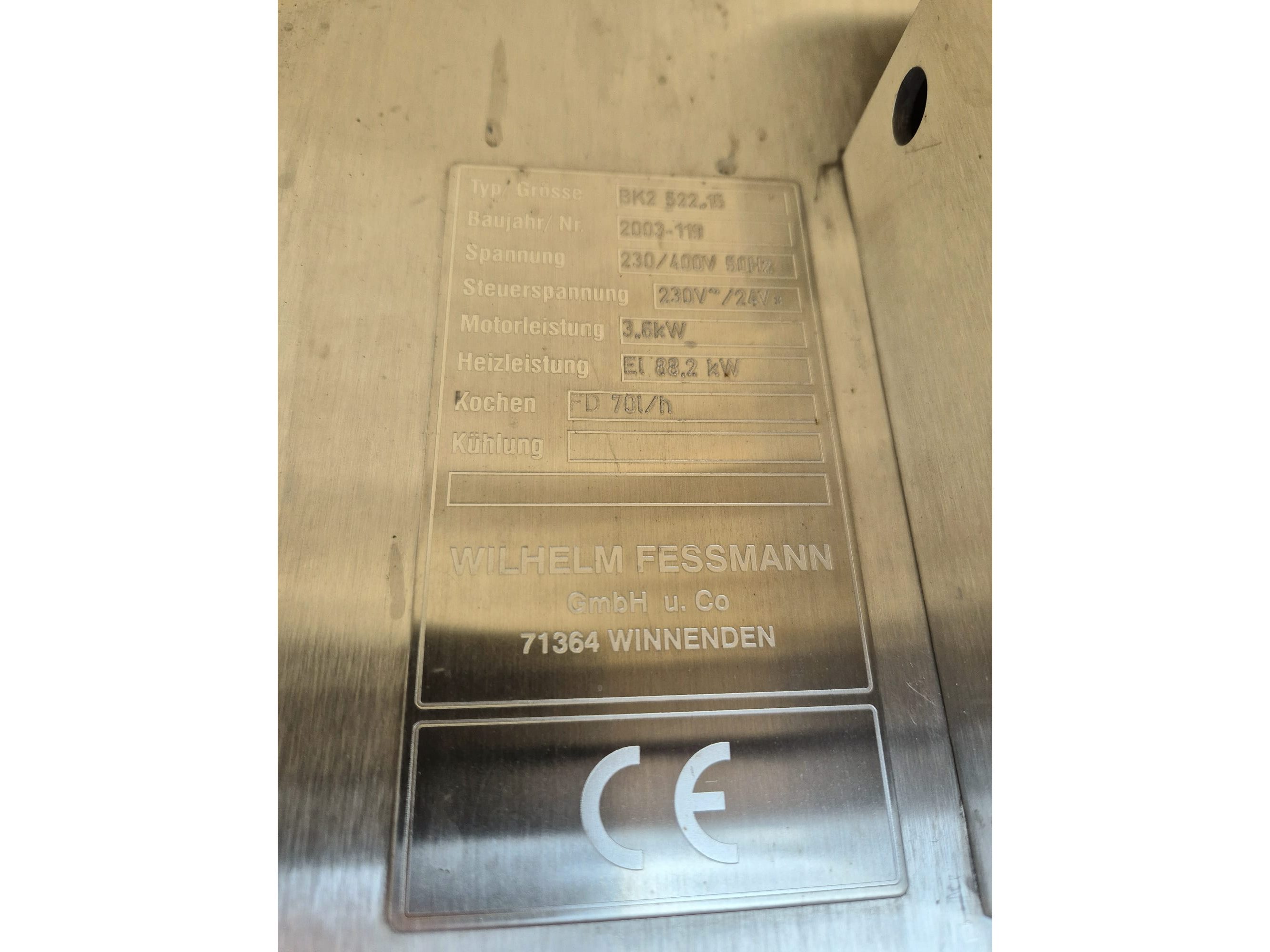 Fessmann rotating cooking chamber for 1 trolley, type: BK2 522.16, number: 119, year of construction: 2003, 230 V, 88.2 kW, 701 l/hinside dimensions: 1600 mm x 1600 mm x 2070 mm, total dimensions: 2000 mm x 1850 mm x 3000 mm.