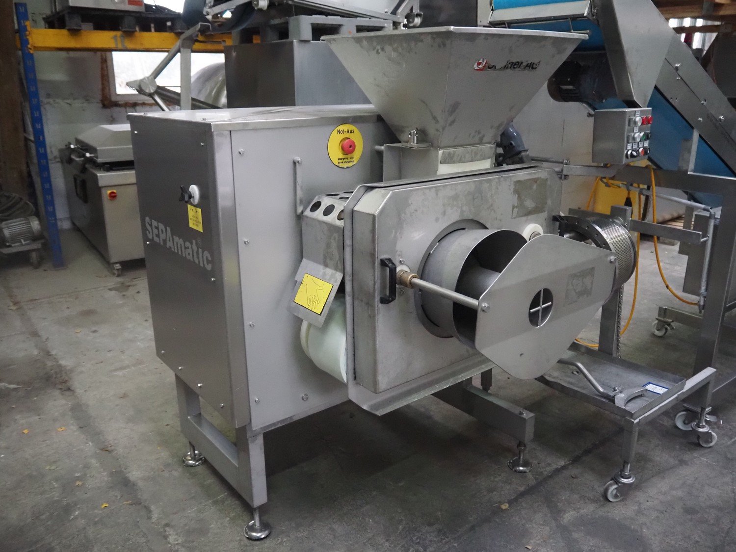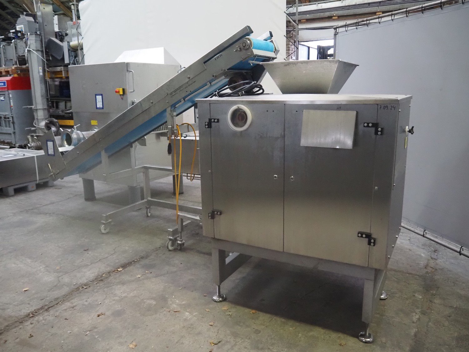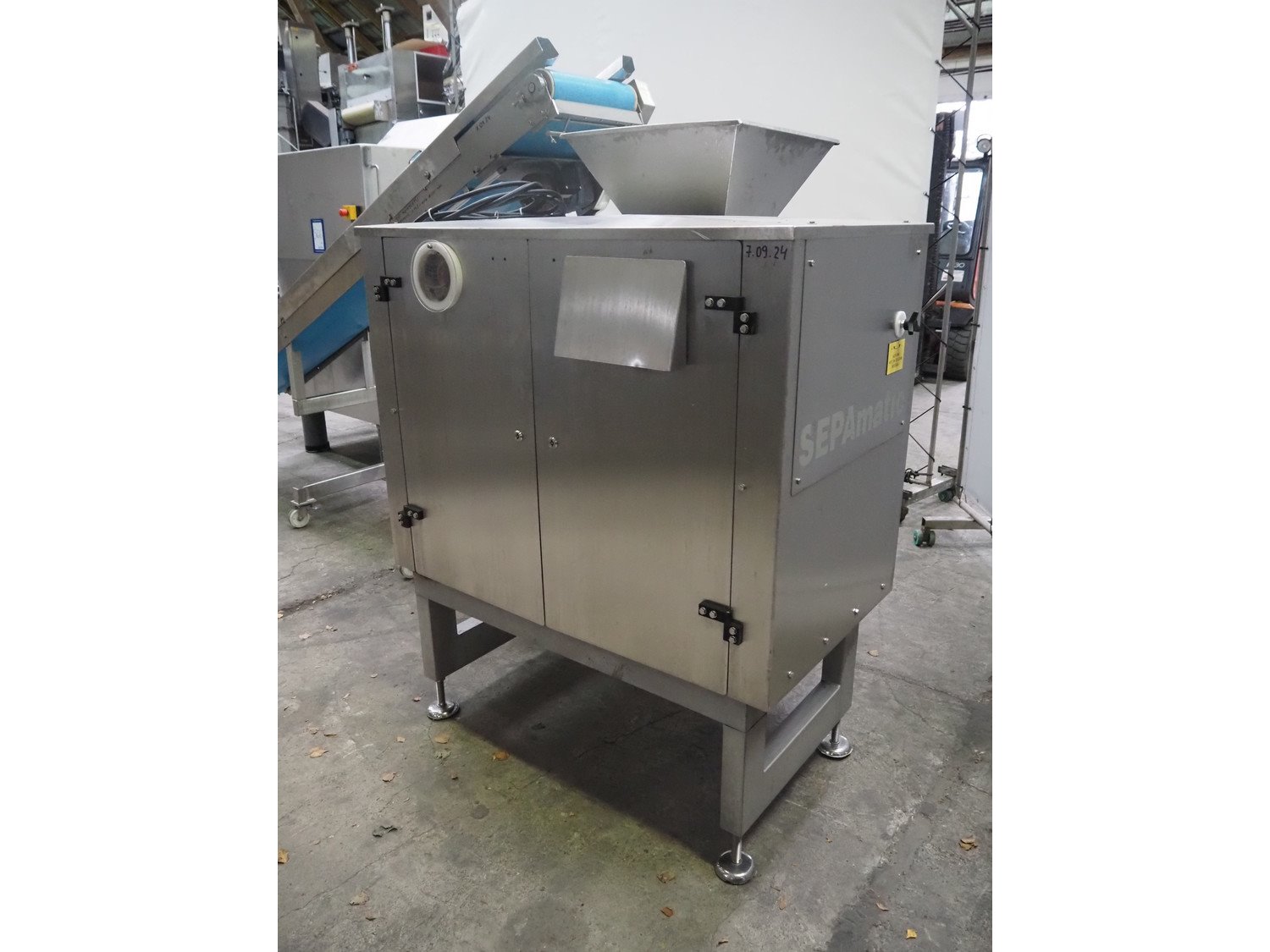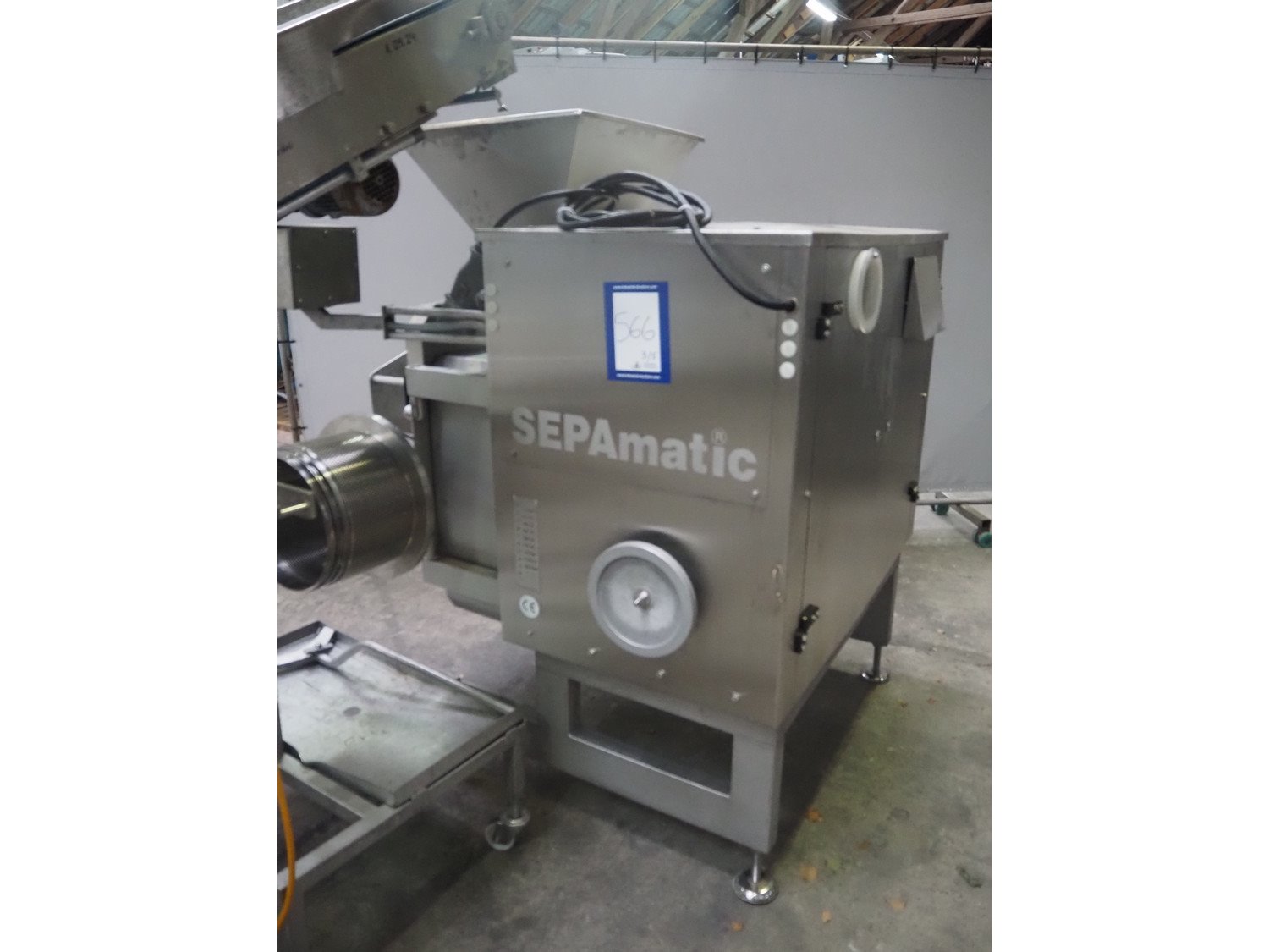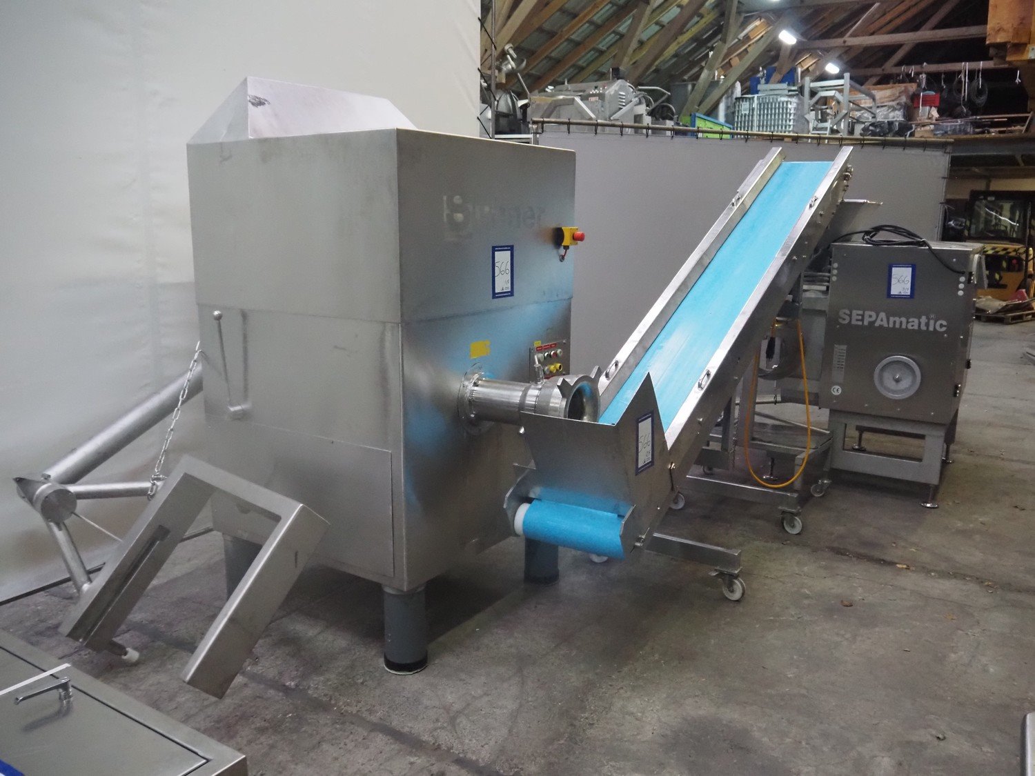 Grinder / separator line, consisting of: Seydelmann mixer-grinder with lifter for 200 liter meat bins, type: MG160B, machine number: 92379-1, 380 V, 50 Hz, 70 A, plate diameter: 160 mm, dimensions: 2000 mm x 1700 mm x 2200 mm. Switch cabinet, dimensions: 1230 mm x 1000 mm x 600 mm. Mobile elevating belt, s/s frame, plastic belt, belt width: 370 mm, elevating height: 1950 mm, total dimensions: 2950 mm x 850 mm x 2080 mm. Sepamatic separator, type: SEPA 1200, machine number: 195712, 400 V, 50 Hz, 12 A, 6 kW, 24 volt, plastic belt, belt width: 180 mm, perforations: 3 mm, total dimensions: 1500 mm x 1400 mm x 1750 mm. S/s trolley with extra drum, perforations: 4 mm, total dimensions: 850 mm x 700 mm x 1100 mm.