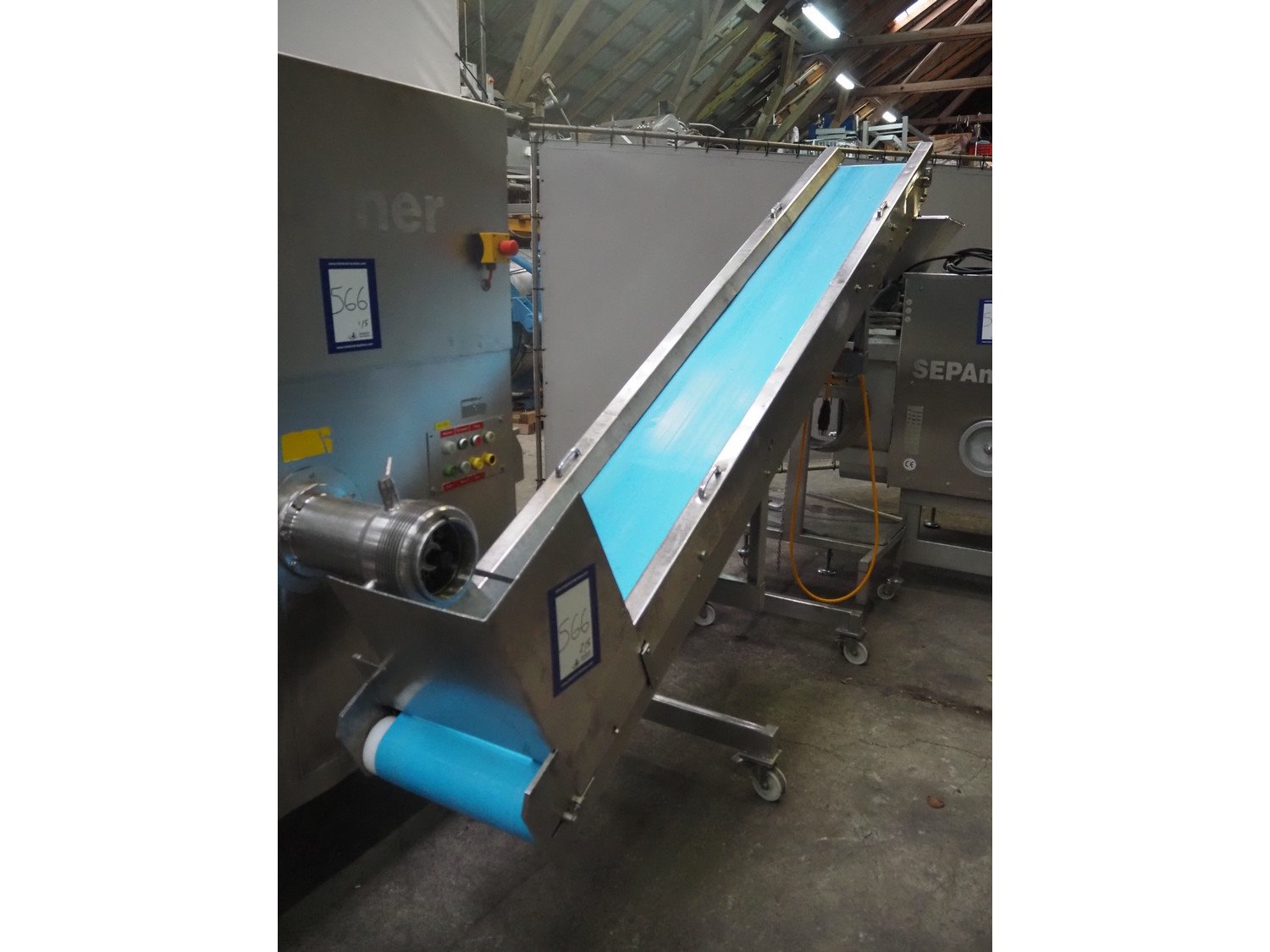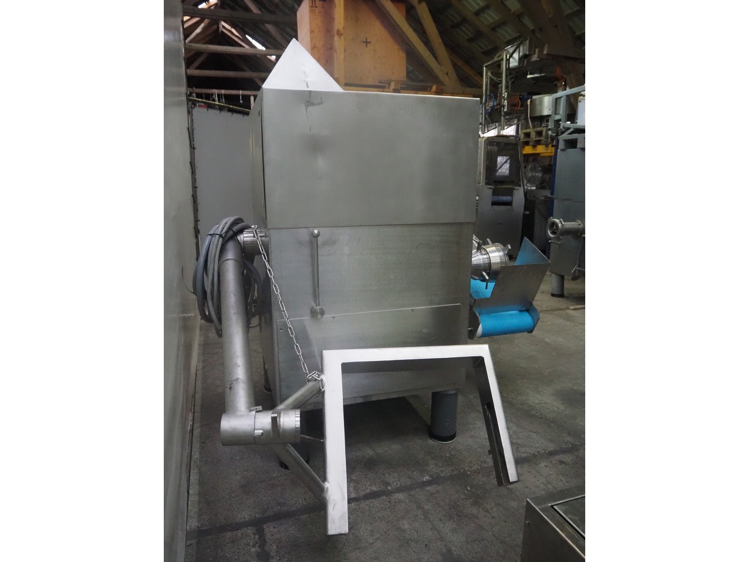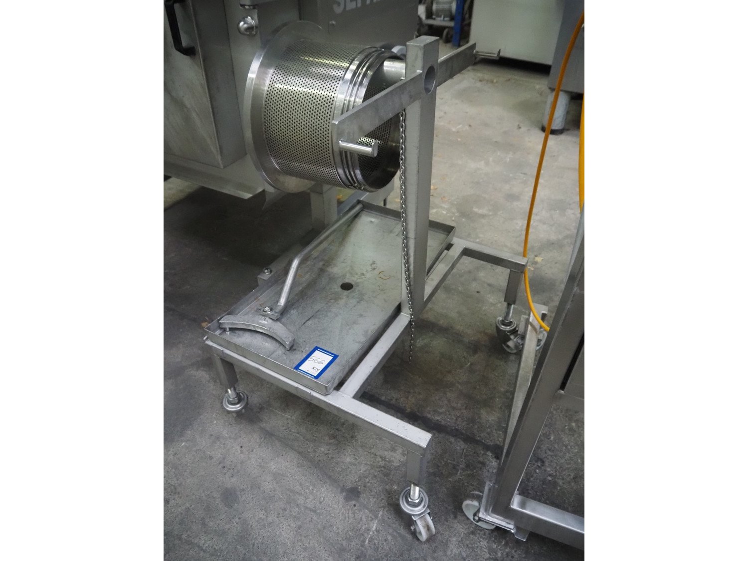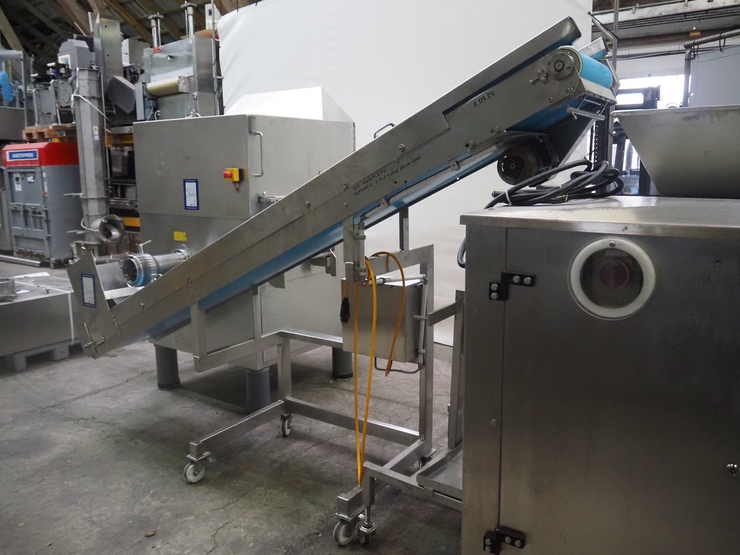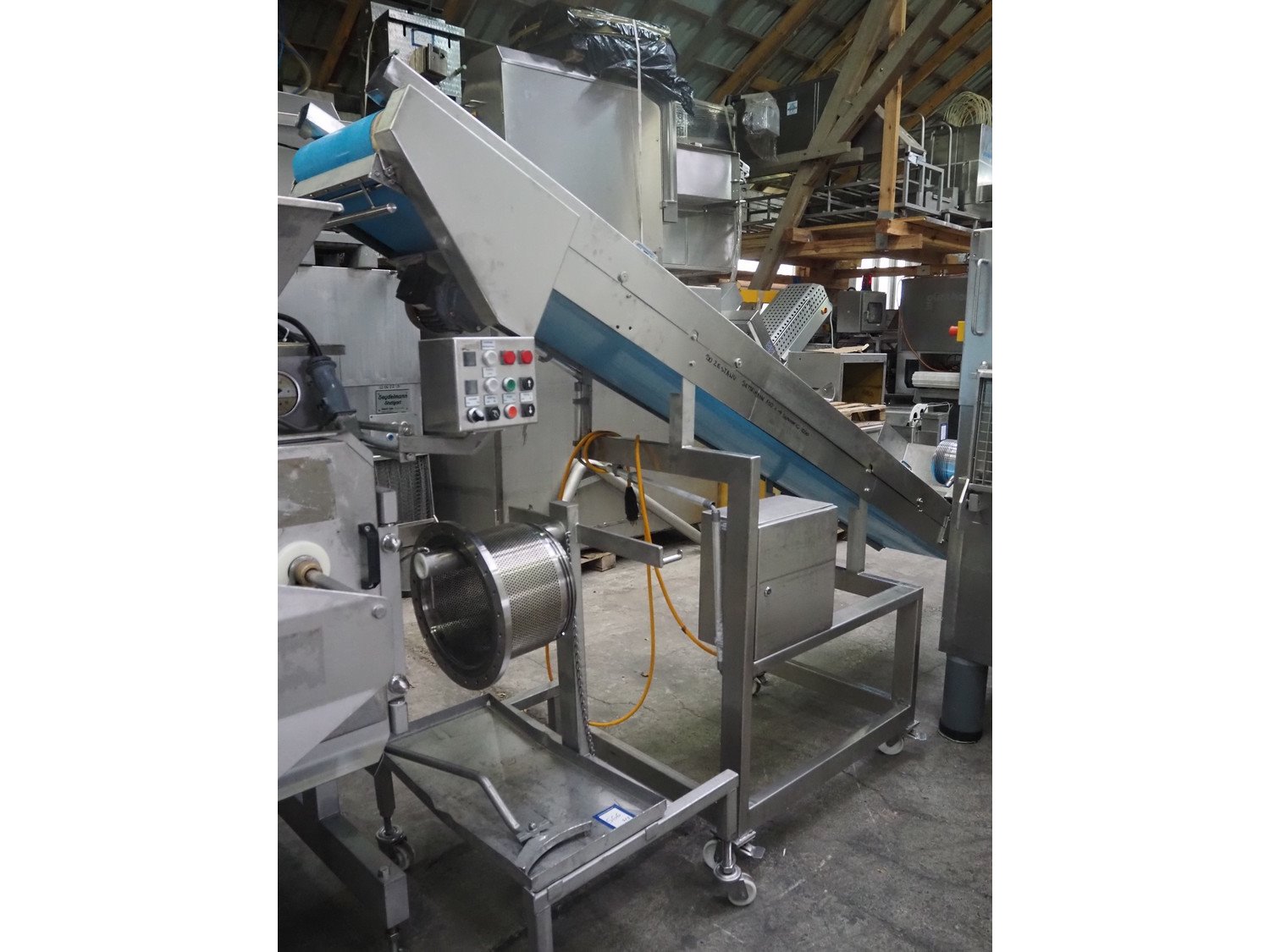 Grinder / separator line, consisting of: Seydelmann mixer-grinder with lifter for 200 liter meat bins, type: MG160B, machine number: 92379-1, 380 V, 50 Hz, 70 A, plate diameter: 160 mm, dimensions: 2000 mm x 1700 mm x 2200 mm. Switch cabinet, dimensions: 1230 mm x 1000 mm x 600 mm. Mobile elevating belt, s/s frame, plastic belt, belt width: 370 mm, elevating height: 1950 mm, total dimensions: 2950 mm x 850 mm x 2080 mm. Sepamatic separator, type: SEPA 1200, machine number: 195712, 400 V, 50 Hz, 12 A, 6 kW, 24 volt, plastic belt, belt width: 180 mm, perforations: 3 mm, total dimensions: 1500 mm x 1400 mm x 1750 mm. S/s trolley with extra drum, perforations: 4 mm, total dimensions: 850 mm x 700 mm x 1100 mm.