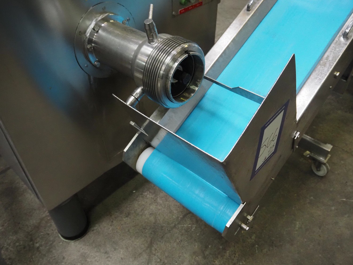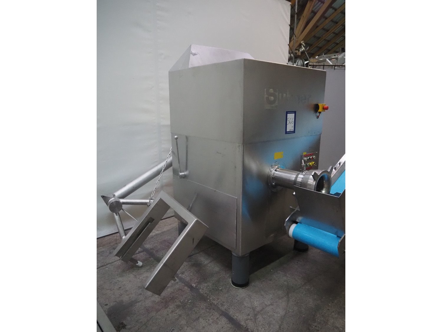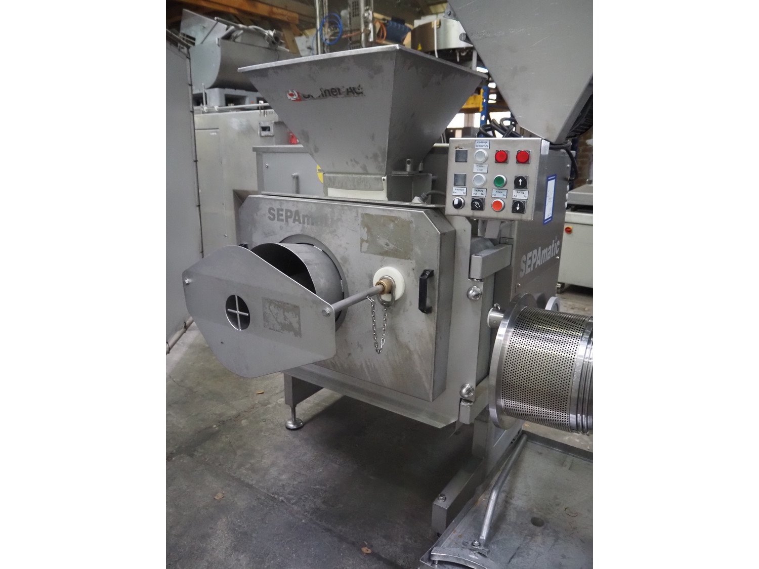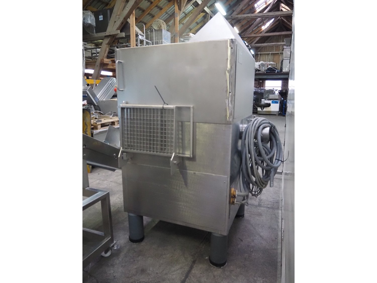Grinder / separator line, consisting of: Seydelmann mixer-grinder with lifter for 200 liter meat bins, type: MG160B, machine number: 92379-1, 380 V, 50 Hz, 70 A, plate diameter: 160 mm, dimensions: 2000 mm x 1700 mm x 2200 mm. Switch cabinet, dimensions: 1230 mm x 1000 mm x 600 mm. Mobile elevating belt, s/s frame, plastic belt, belt width: 370 mm, elevating height: 1950 mm, total dimensions: 2950 mm x 850 mm x 2080 mm. Sepamatic separator, type: SEPA 1200, machine number: 195712, 400 V, 50 Hz, 12 A, 6 kW, 24 volt, plastic belt, belt width: 180 mm, perforations: 3 mm, total dimensions: 1500 mm x 1400 mm x 1750 mm. S/s trolley with extra drum, perforations: 4 mm, total dimensions: 850 mm x 700 mm x 1100 mm.