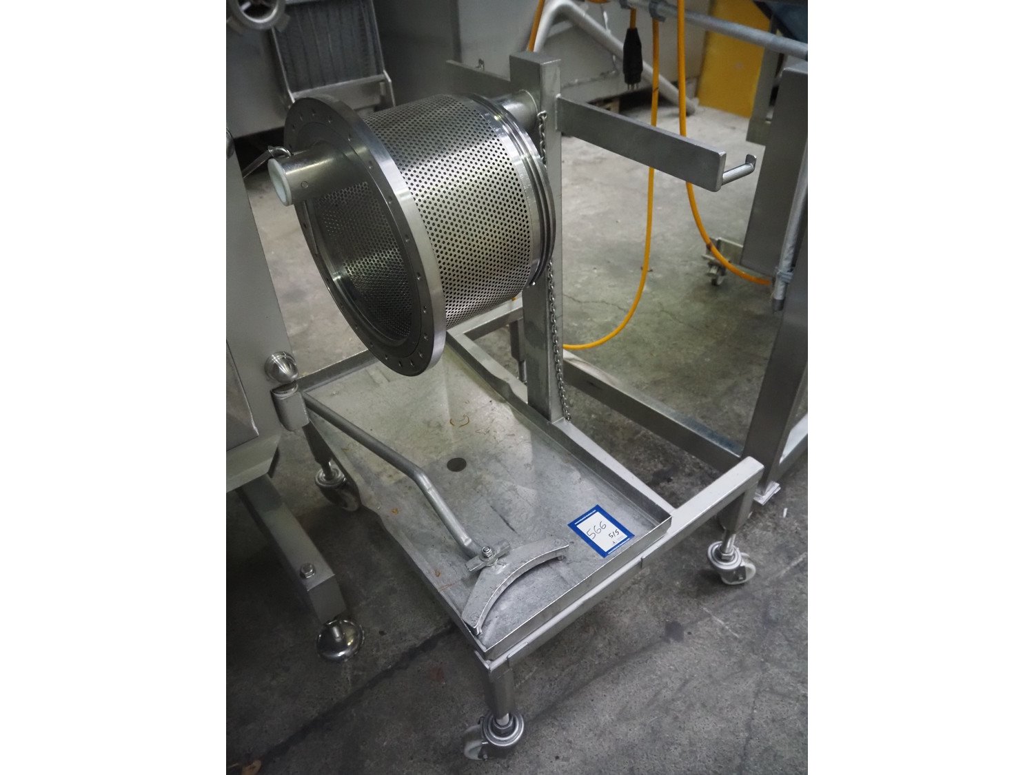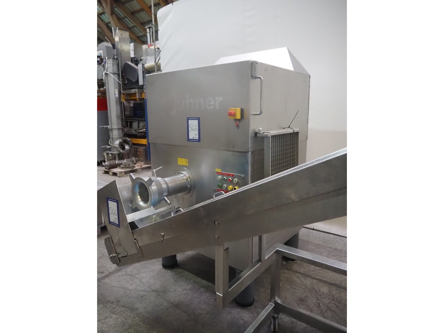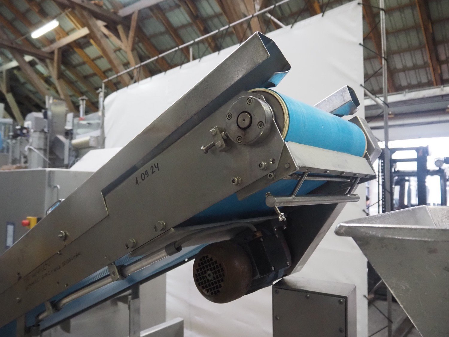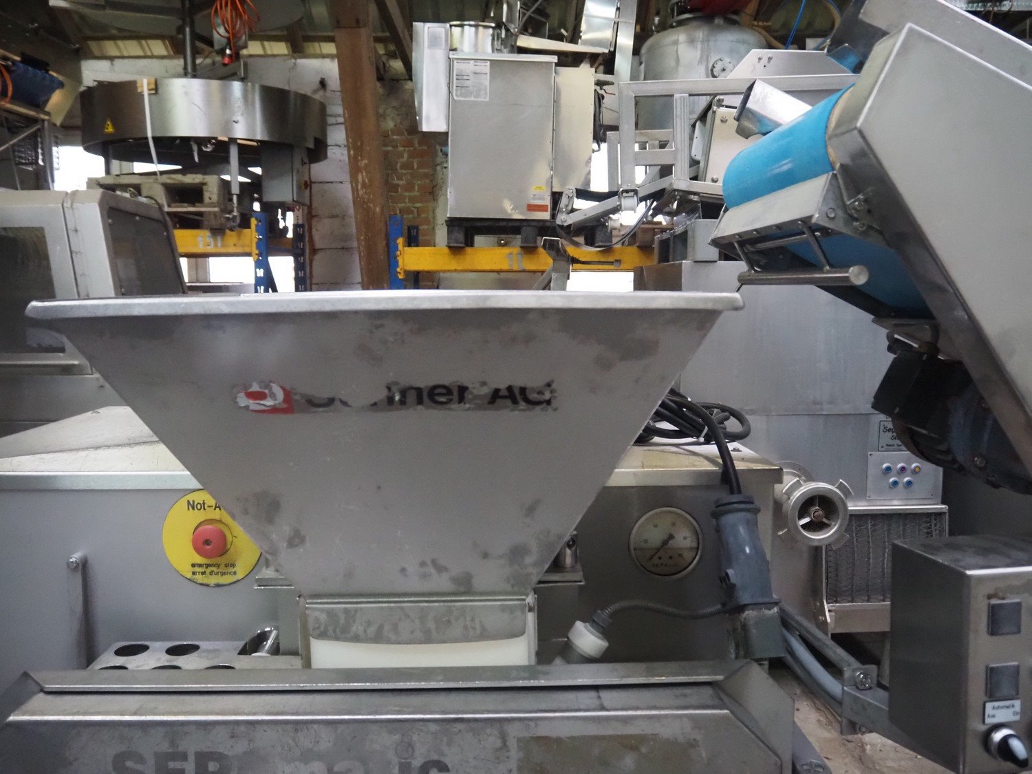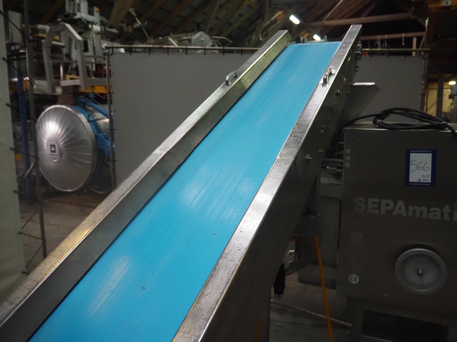 Grinder / separator line, consisting of: Seydelmann mixer-grinder with lifter for 200 liter meat bins, type: MG160B, machine number: 92379-1, 380 V, 50 Hz, 70 A, plate diameter: 160 mm, dimensions: 2000 mm x 1700 mm x 2200 mm. Switch cabinet, dimensions: 1230 mm x 1000 mm x 600 mm. Mobile elevating belt, s/s frame, plastic belt, belt width: 370 mm, elevating height: 1950 mm, total dimensions: 2950 mm x 850 mm x 2080 mm. Sepamatic separator, type: SEPA 1200, machine number: 195712, 400 V, 50 Hz, 12 A, 6 kW, 24 volt, plastic belt, belt width: 180 mm, perforations: 3 mm, total dimensions: 1500 mm x 1400 mm x 1750 mm. S/s trolley with extra drum, perforations: 4 mm, total dimensions: 850 mm x 700 mm x 1100 mm.