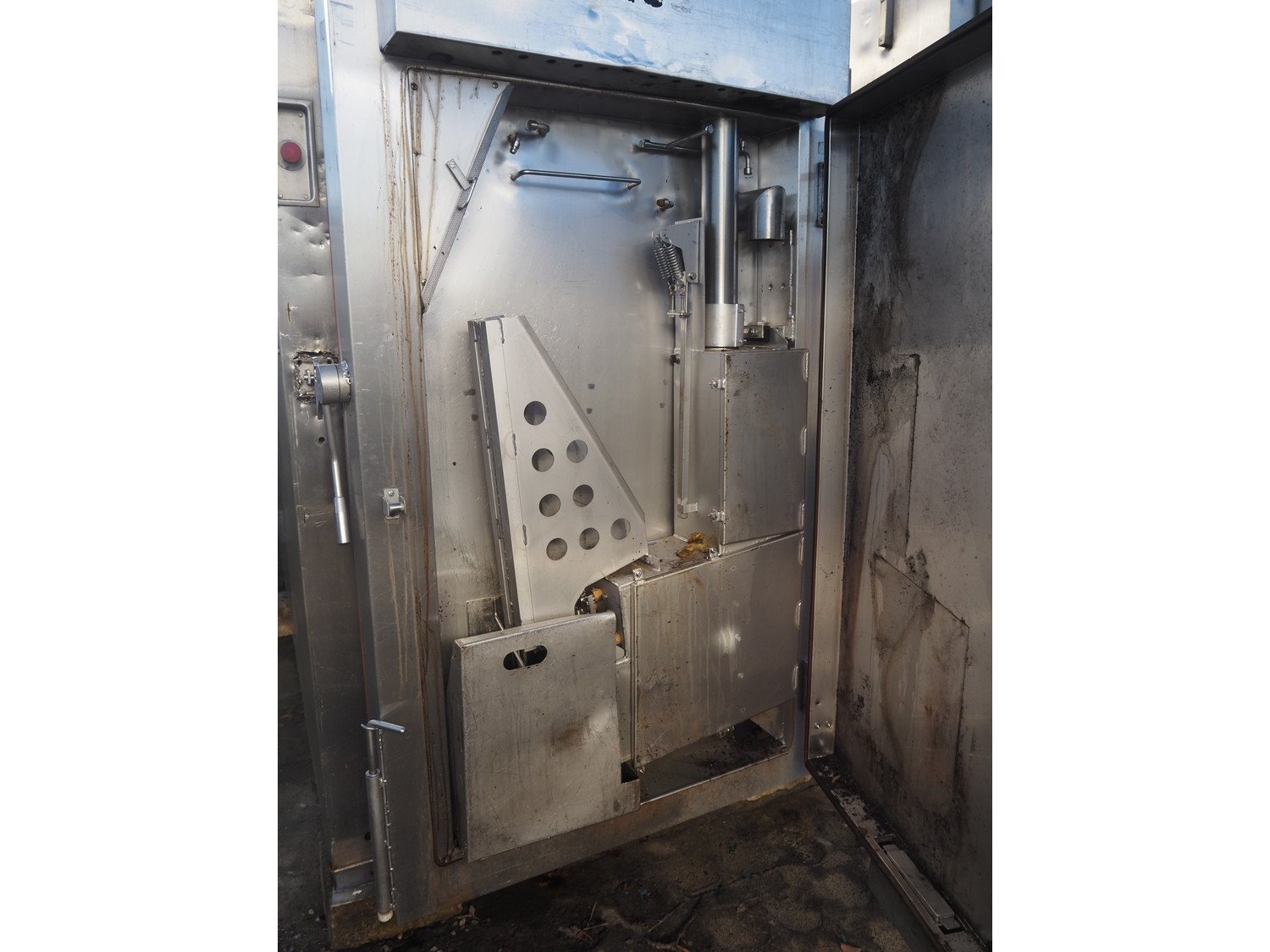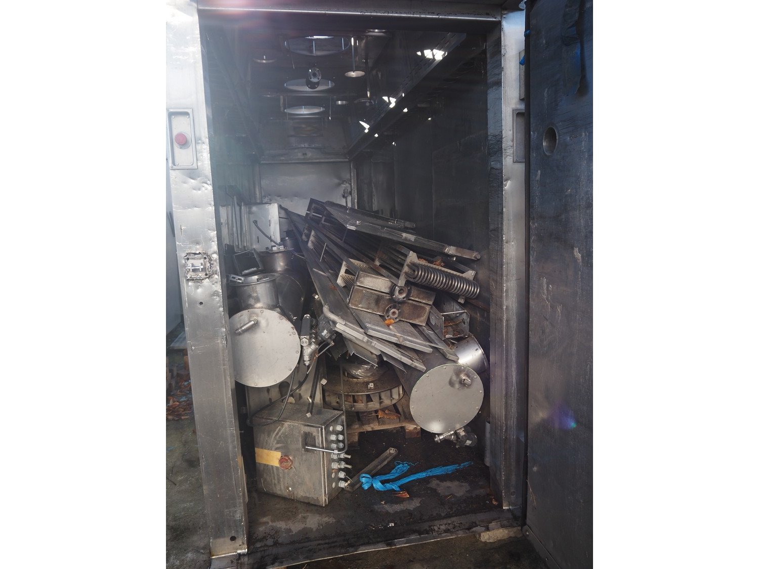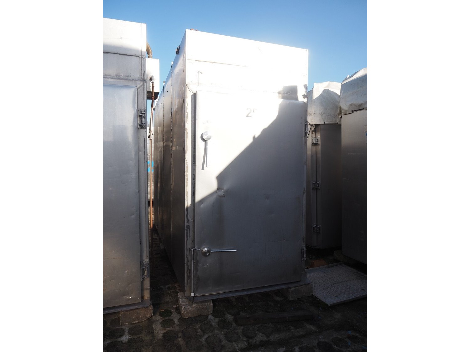 Maurer-Atmos GmbH push thru smoking chamber for 4 trolleys, type: 199180, serial number: 1095 EG, year of construction: 10/2006, steam heated, total dimensions: 4660 mm x 1400 mm x 3300 mm.