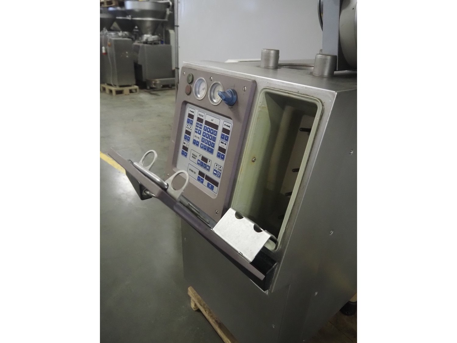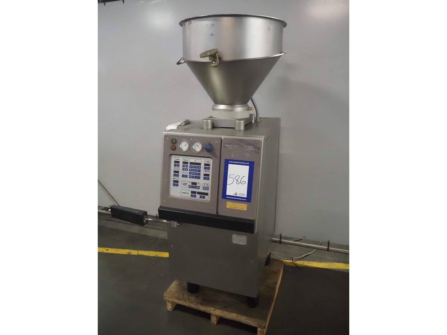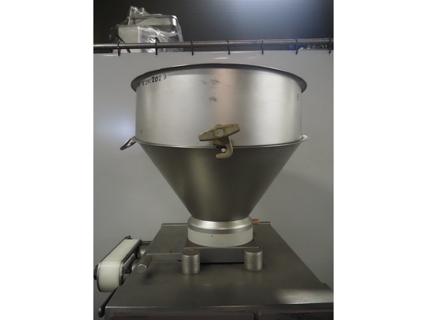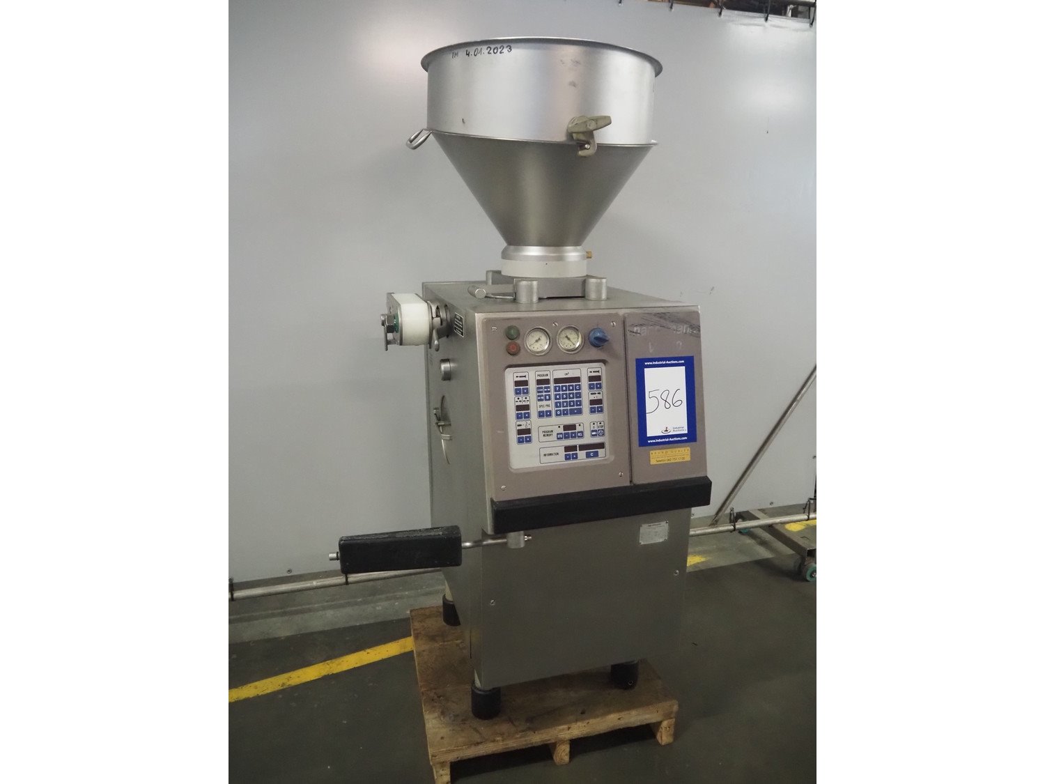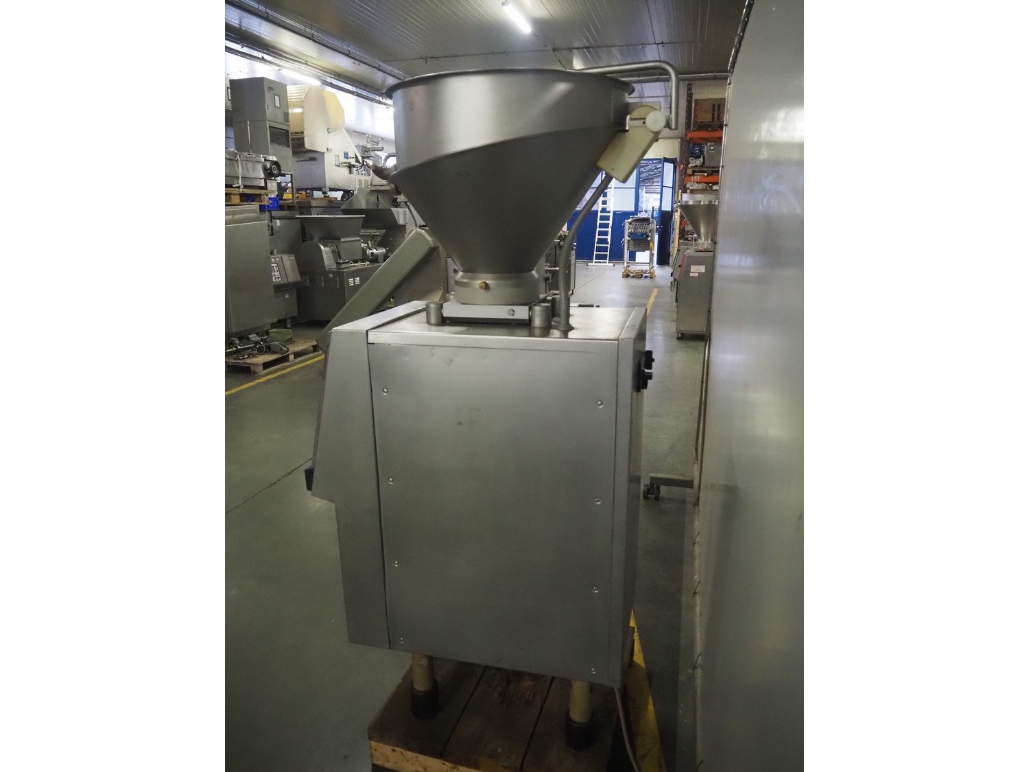 Handtmann vacuum filling machine with linking attachment, type: VF50, number: 3316, 380 V, 50 Hz, 11 A, 4 kW, dimensions: 830 mm x 690 mm x 1800 mm.