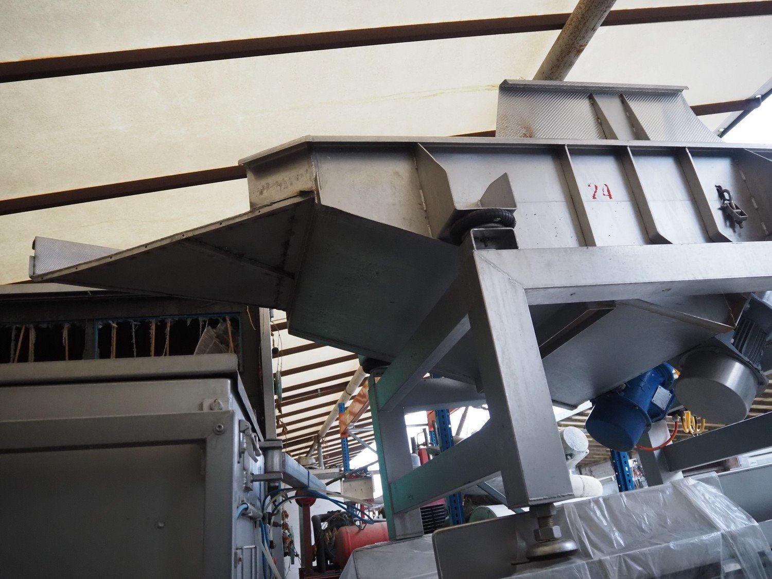 S/s sieve vibrating gutter, diameter perforations: 3 mm, gutter width: 750 mm, total dimensions: 2650 mm x 1150 mm x 1400 mm.