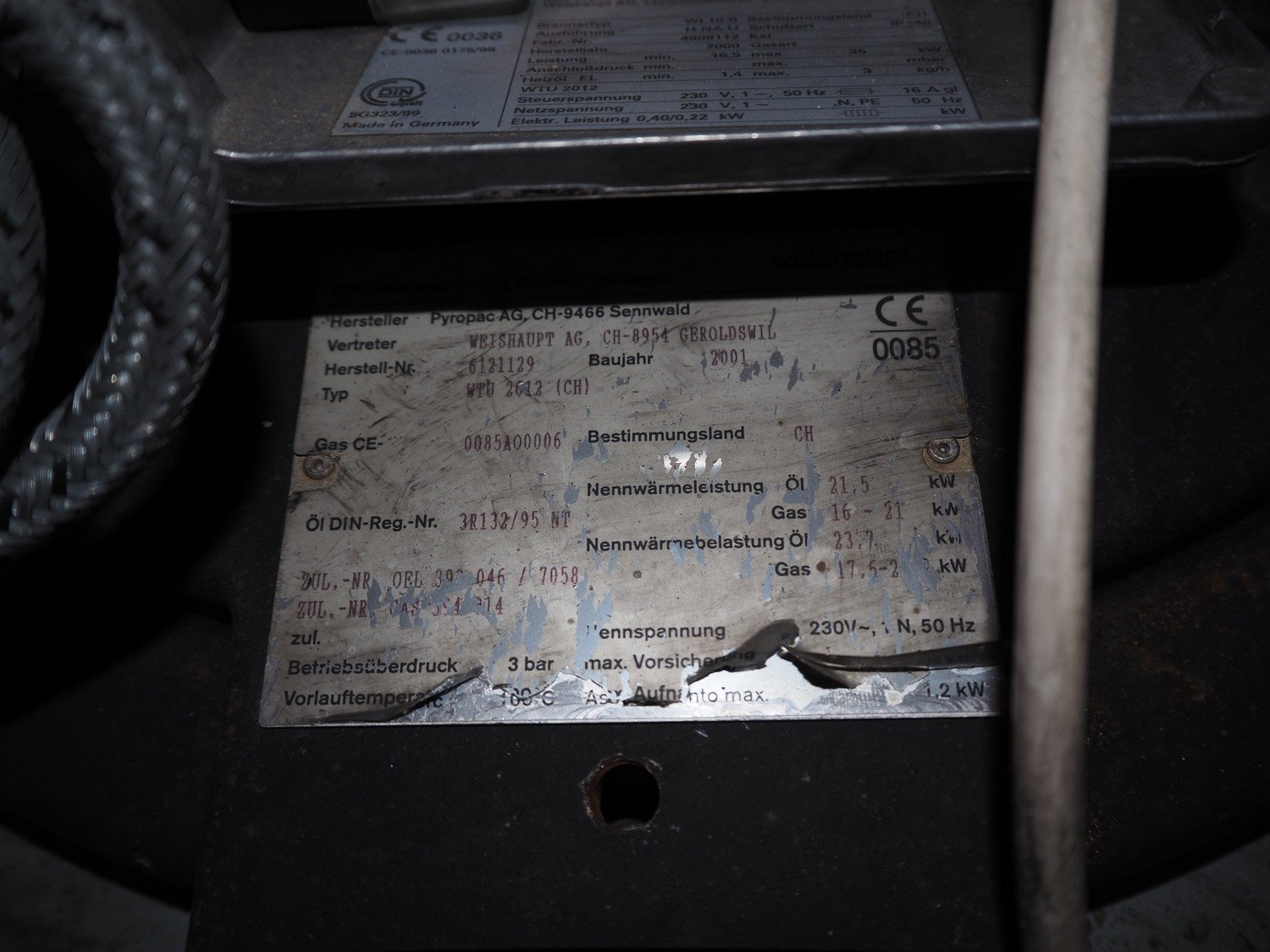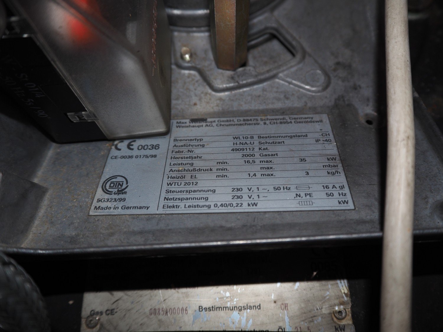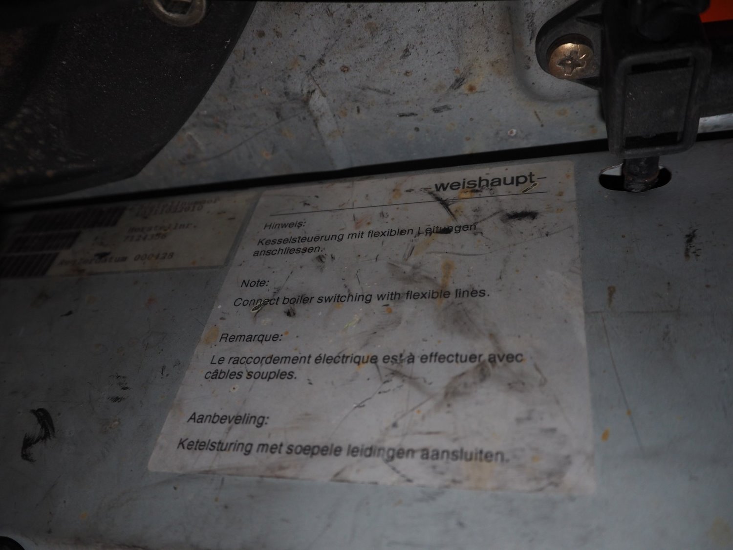 Weishaupt burner, type: WL 10-B, number: 4909112, year of construction: 2000, 230 V, 1 Ph, 50 Hz, 16 A, 0.40/0.22 kW, dimensions: 1200 mm x 570 mm x 1050 mm.