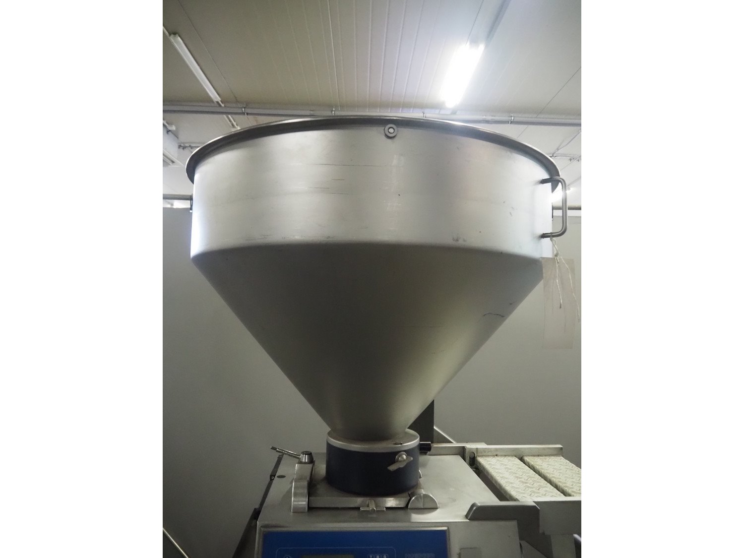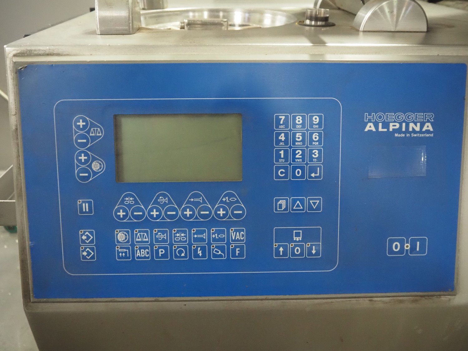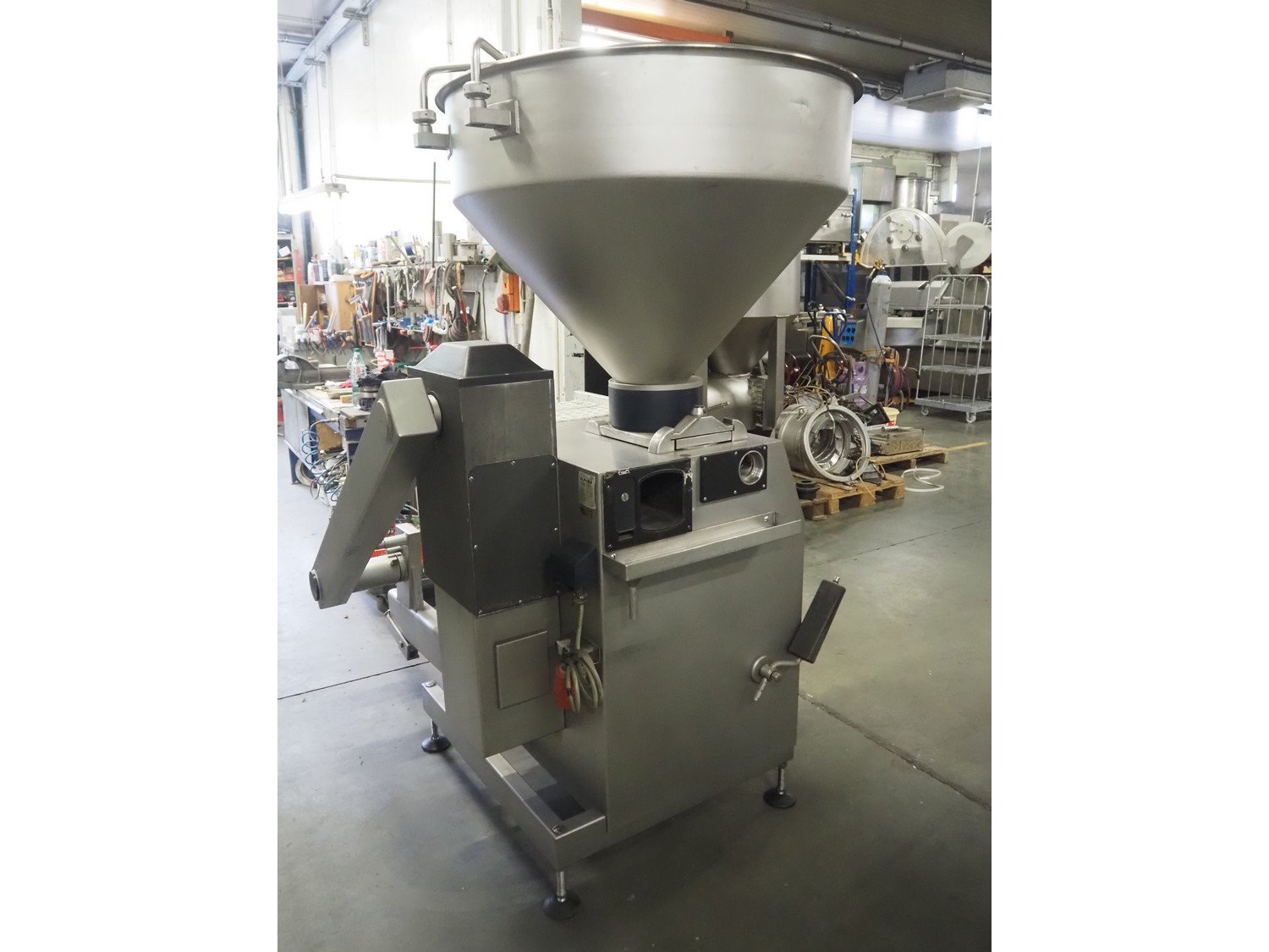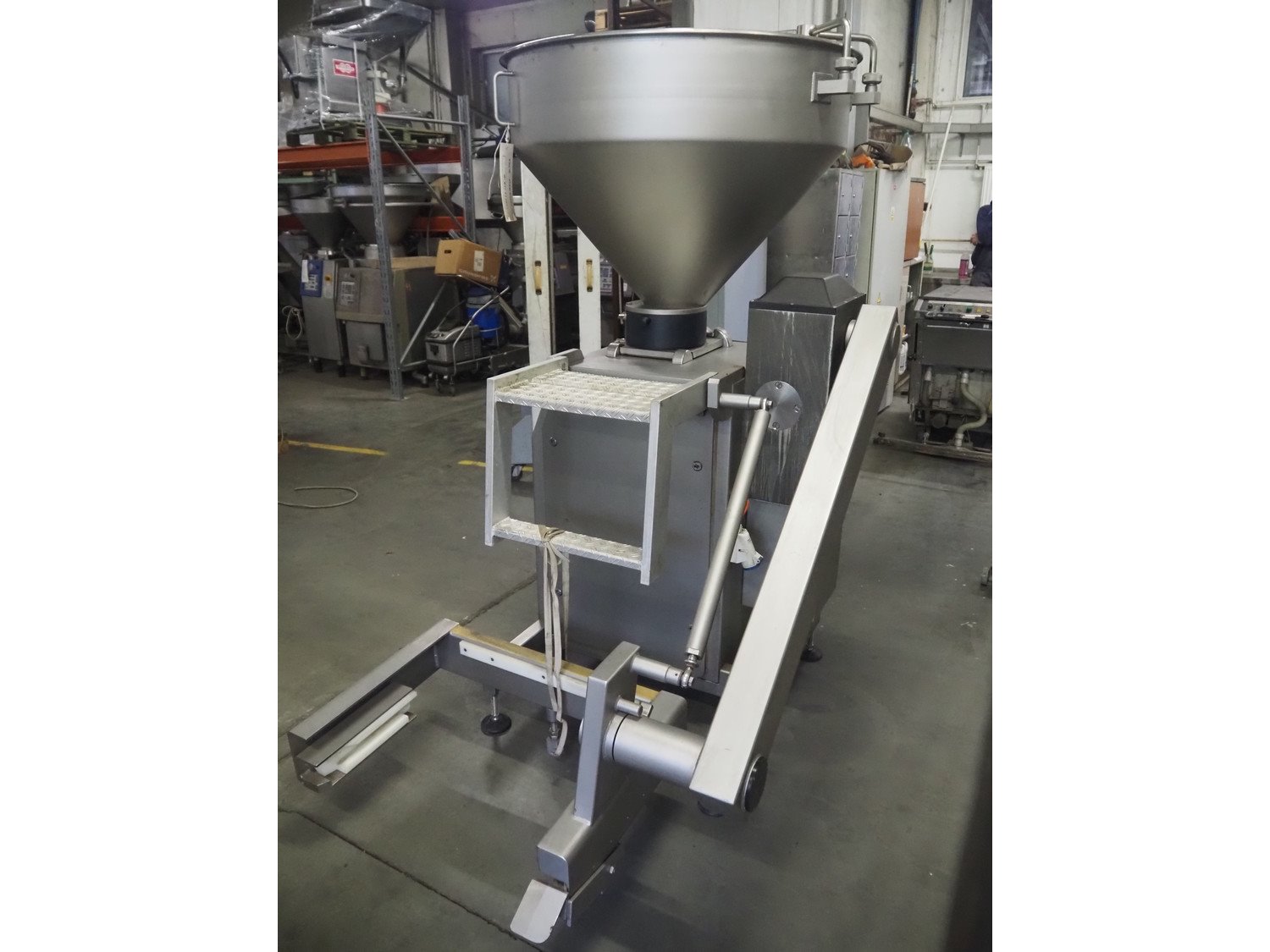 Hoegger Alpina vacuum filling machine with lifter for meat bins, type: SF 3200, machine number: 832512, 400 V, 3 Ph, 50 Hz, 15 A, dimensions: 1750 mm x 1080 mm x 2000 mm.
