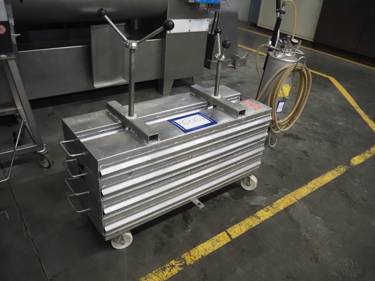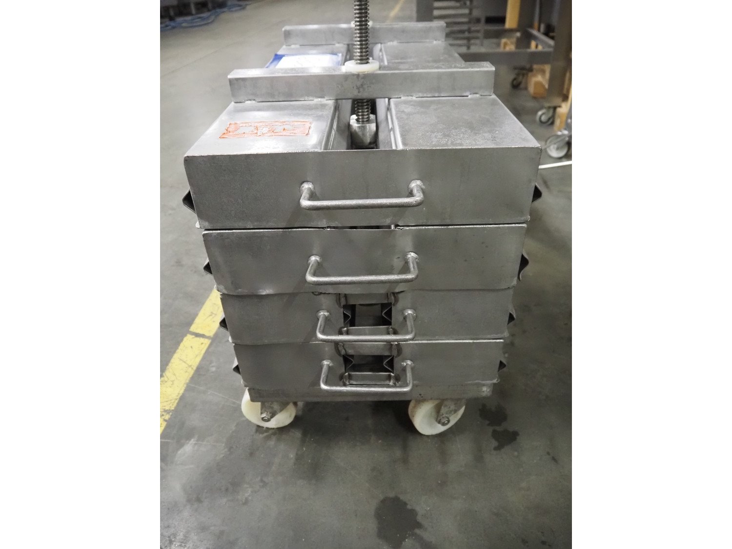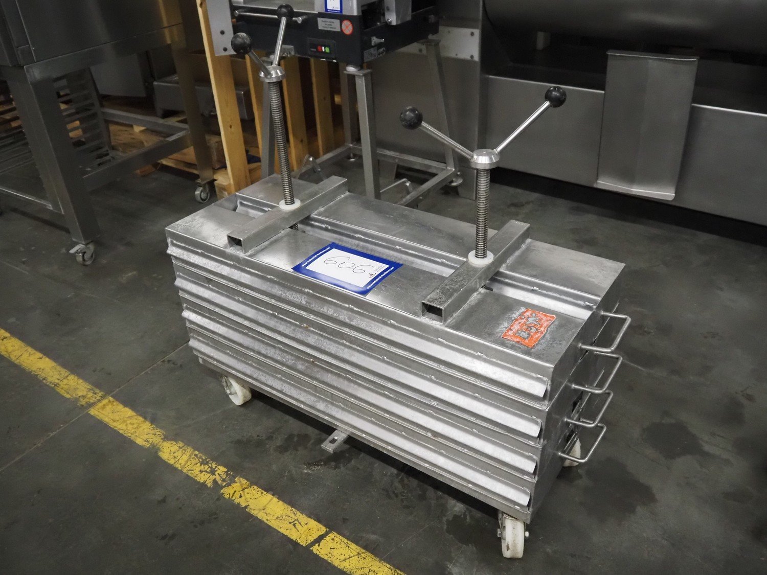 Rudolph Schad mobile ham press, 8 forms, dimensions forms: (8x) 1000 mm x 150 mm x 90 mm, total dimensions: 1150 mm x 410 mm x 900 mm.